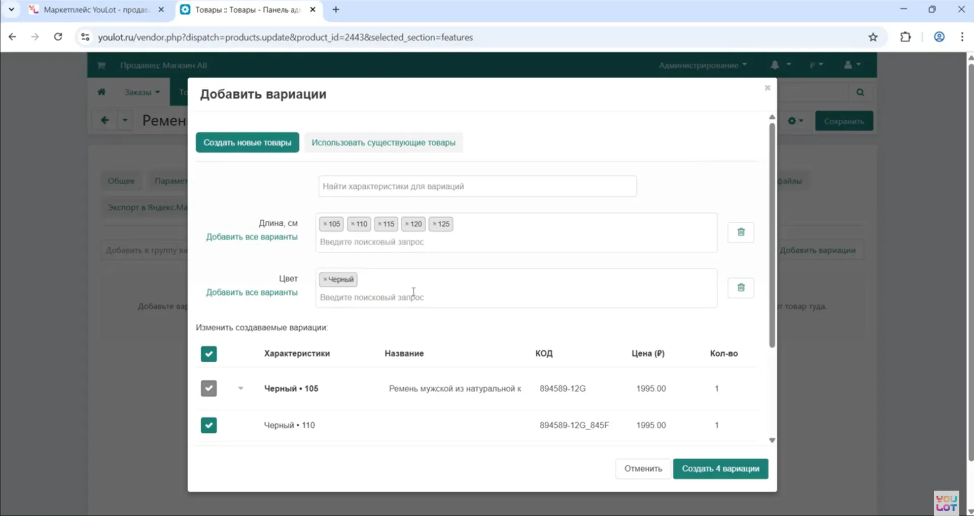 Нажмите кнопку Сохранить и перейдите на вкладку вариации.