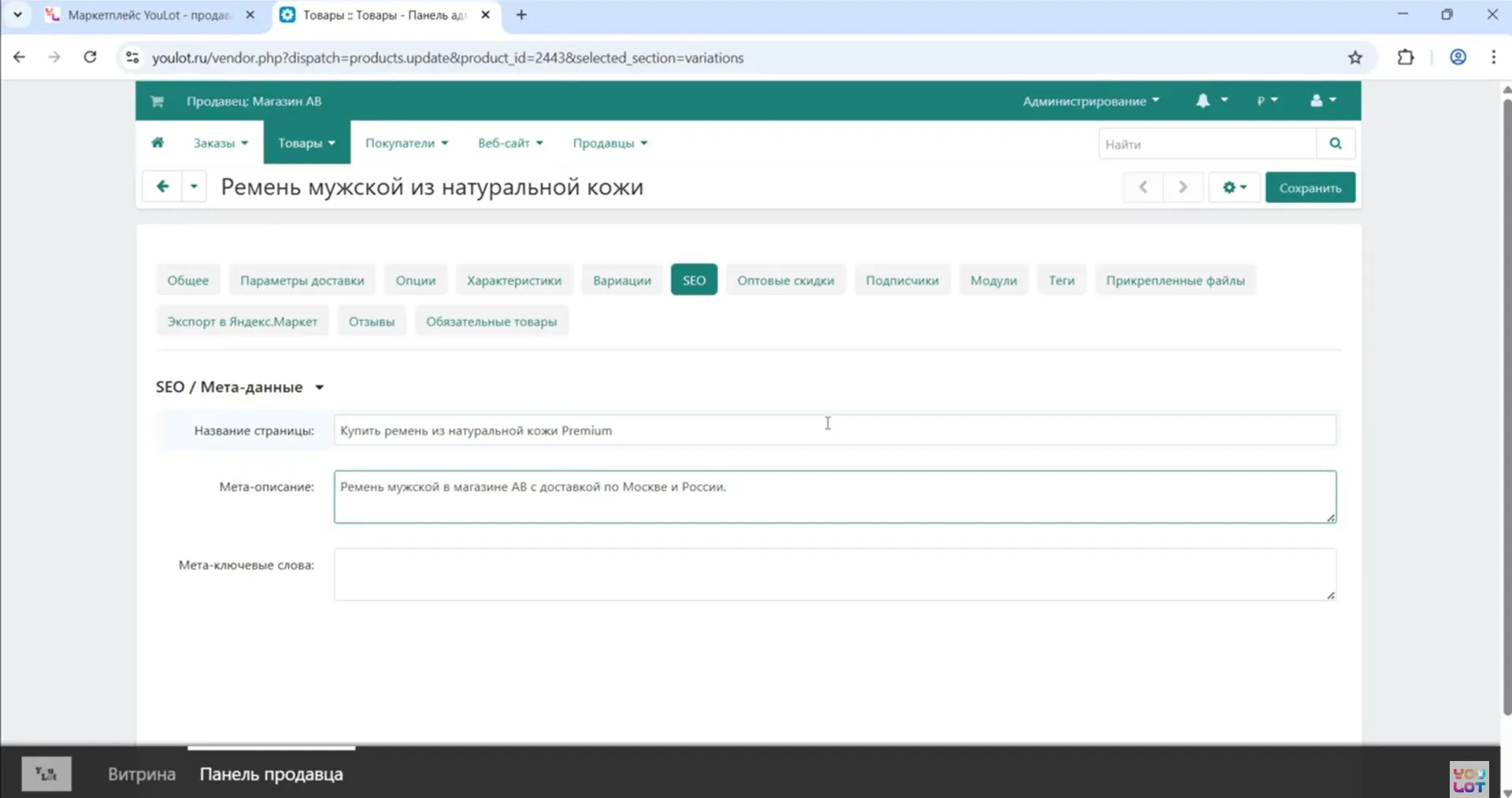 Напишите название страницы и её описание, это придаст уникальности вашему товару для поисковиков. Нажмите кнопку Сохранить.