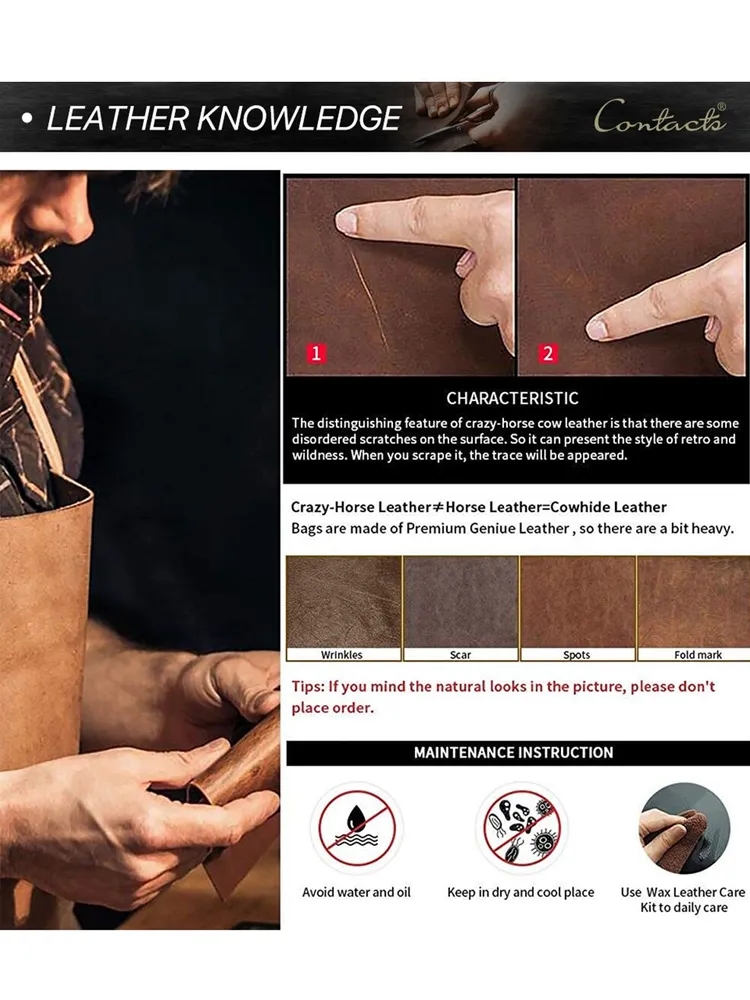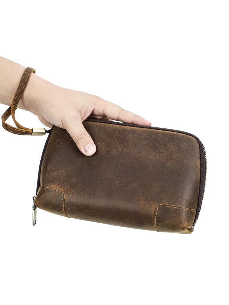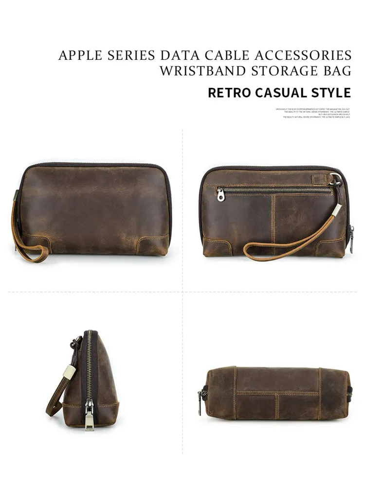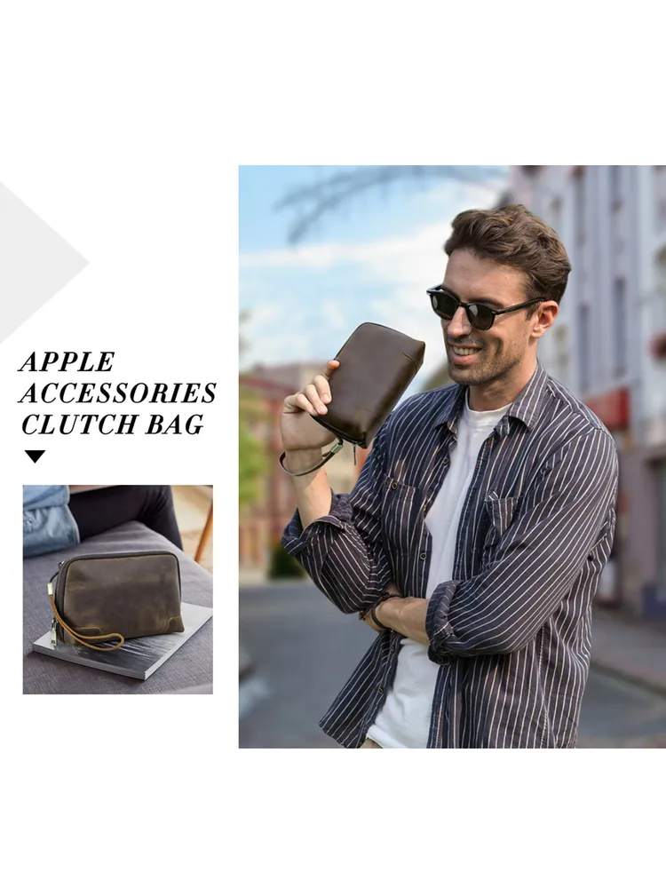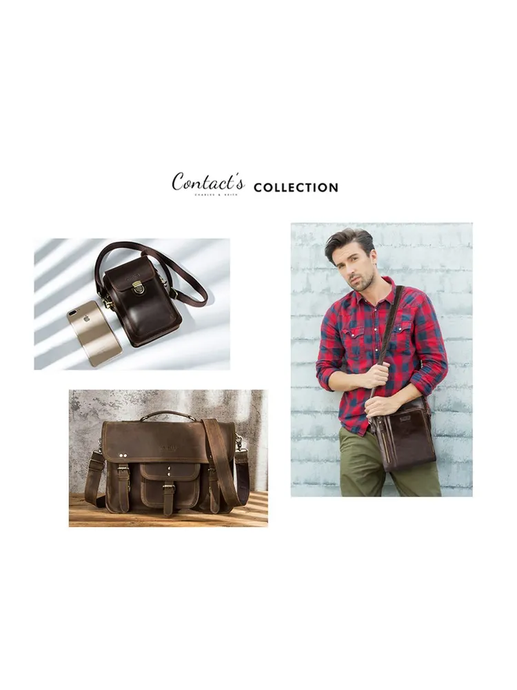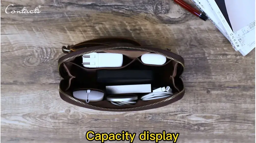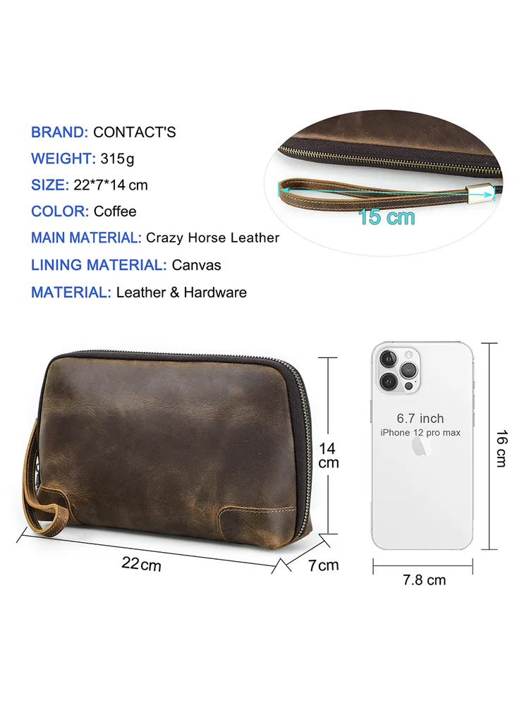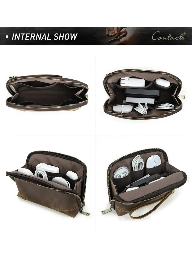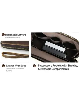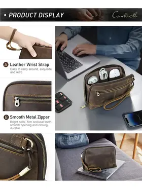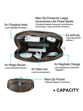 ### Продукт: Кожаный мужской клатч CONTACT'S для хранения электронных аксессуаров и кошелек **Описание продукта:**Эта элегантная и функциональная сумка выполнена из высококачественной натуральной кожи и предназначена для хранения электронных аксессуаров. С размерами 22x14x7 см и весом 315 грамм, она удобна для переноски и оснащена удобным ремешком для запястья. **Основные характеристики: **1. **Высококачественная кожа:** Мужской органайзер изготовлен из цельнозернистой кожи, которая отличается долговечностью и уникальным внешним видом. Со временем кожа становится ещё красивее и приобретает благородную патину, сочетая прикосновения роскоши и антиквариата. 2. **Вместимость:** Мини-сумка для мужских гаджетов оснащена 5 небольшими карманами для размещения мышей, кабелей, зарядных устройств MagSafe, зарядных головок и наушников. Основное отделение на молнии вмещает другие аксессуары, такие как пауэрбанки и зарядные устройства. 3. **Компактные размеры:** С размерами 22x14x7 см, сумка легко помещается в рюкзак, сумку или багаж. Она компактна и легка, что делает её идеальным выбором для путешествий. 4. **Портативность:** Коричневая кожаная сумка подходит для ночевок, отдыха, деловых поездок, путешествий за границу и повседневной жизни. Она организует ваши электронные аксессуары, демонстрируя ваш идеальный стиль и джентльменский вкус. 5. **Отличный подарок:** Коричневая мужская сумка станет прекрасным подарком на День святого Валентина, День отца, День благодарения, Рождество и Новый год для вашего отца, мужа, брата, сына или других членов семьи.