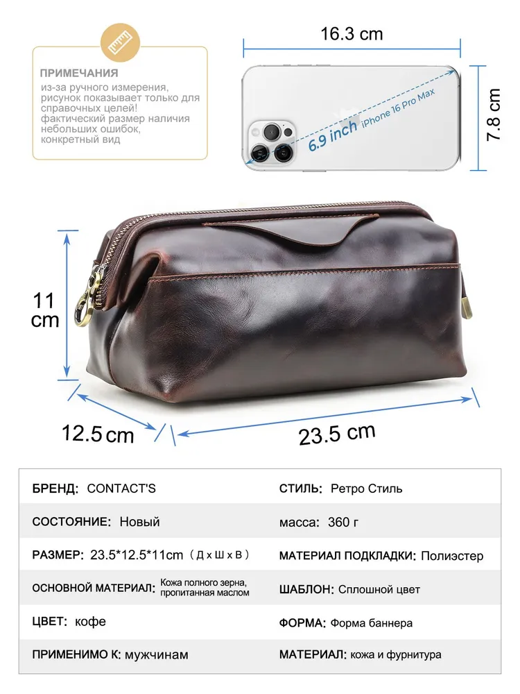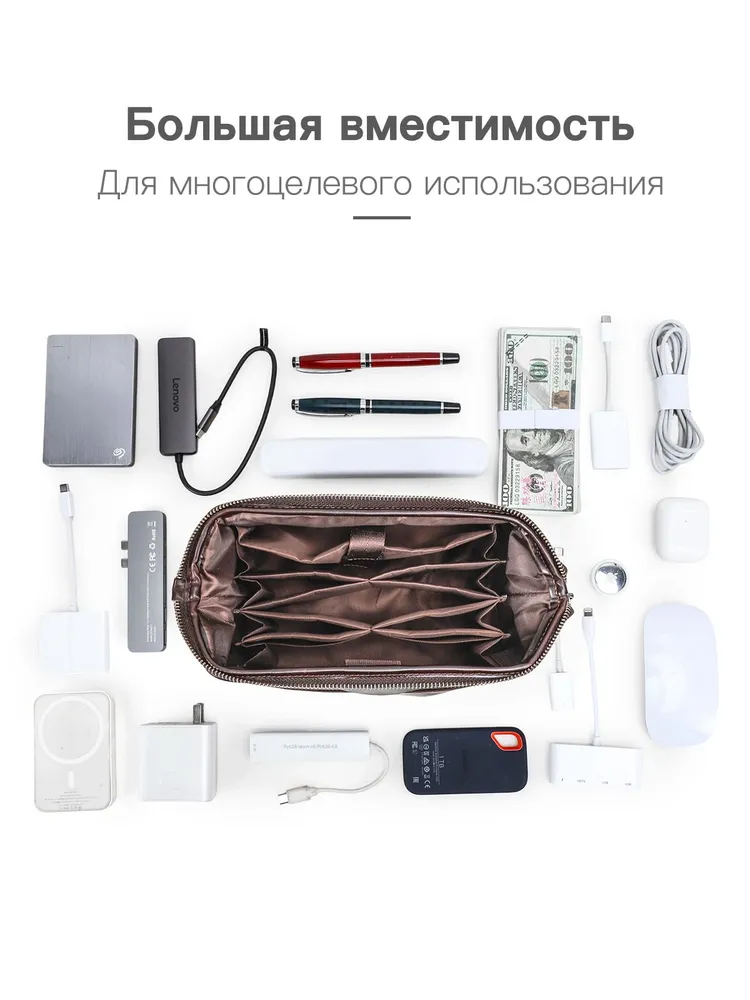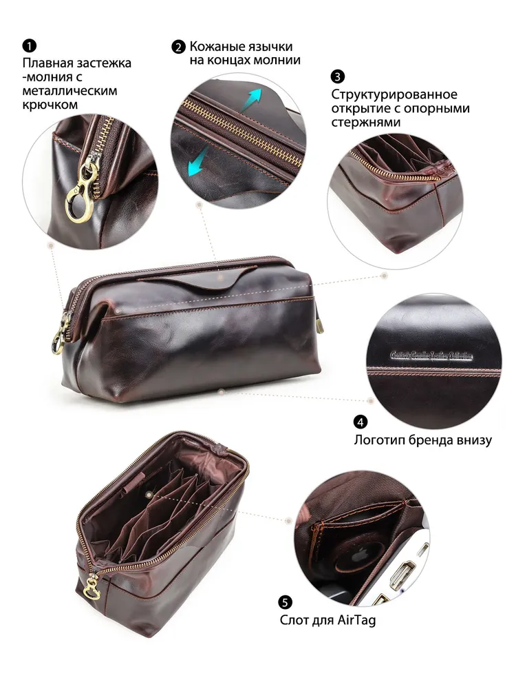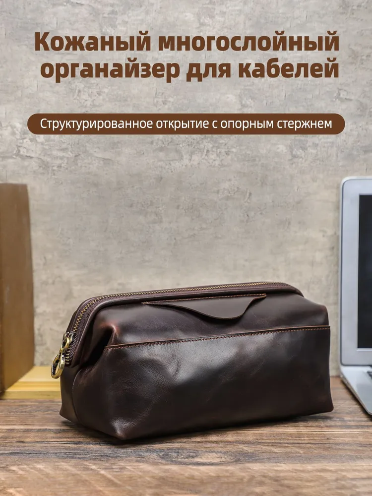 Мужской органайзер для кабелей и аксессуаров из натуральной кожи • Стильная и практичная ручная сумка-органайзер предназначена для аккуратного хранения зарядных кабелей, адаптеров, наушников и других электронных аксессуаров. Выполнена из натуральной кожи, подходит для повседневного использования, работы и поездок. Доступна в кофейном и черном цвете. • Материал: натуральная кожа, прочная и износостойкая, хорошо держит форму и сохраняет аккуратный внешний вид при ежедневном использовании. • Размеры и вес: 23,5 × 12,5 × 11 см, вес 360 г. Компактный формат позволяет носить органайзер в руках или положить в рюкзак, сумку или дорожный чемодан. • Конструкция: удобная застежка-молния обеспечивает быстрый доступ к содержимому, а встроенный металлический каркас защищает аксессуары от деформации и ударов. • Внутренняя организация: несколько функциональных отделений и карманов помогают удобно распределить кабели, power bank, зарядные устройства и мелкие гаджеты, поддерживая порядок внутри. • Дополнительные детали: предусмотрен специальный слот для AirTag, который помогает отслеживать местоположение органайзера и не потерять его в дороге. • Назначение: идеальный аксессуар для мужчин, которые ценят порядок, мобильность и аккуратное хранение техники дома, в офисе и в путешествиях.