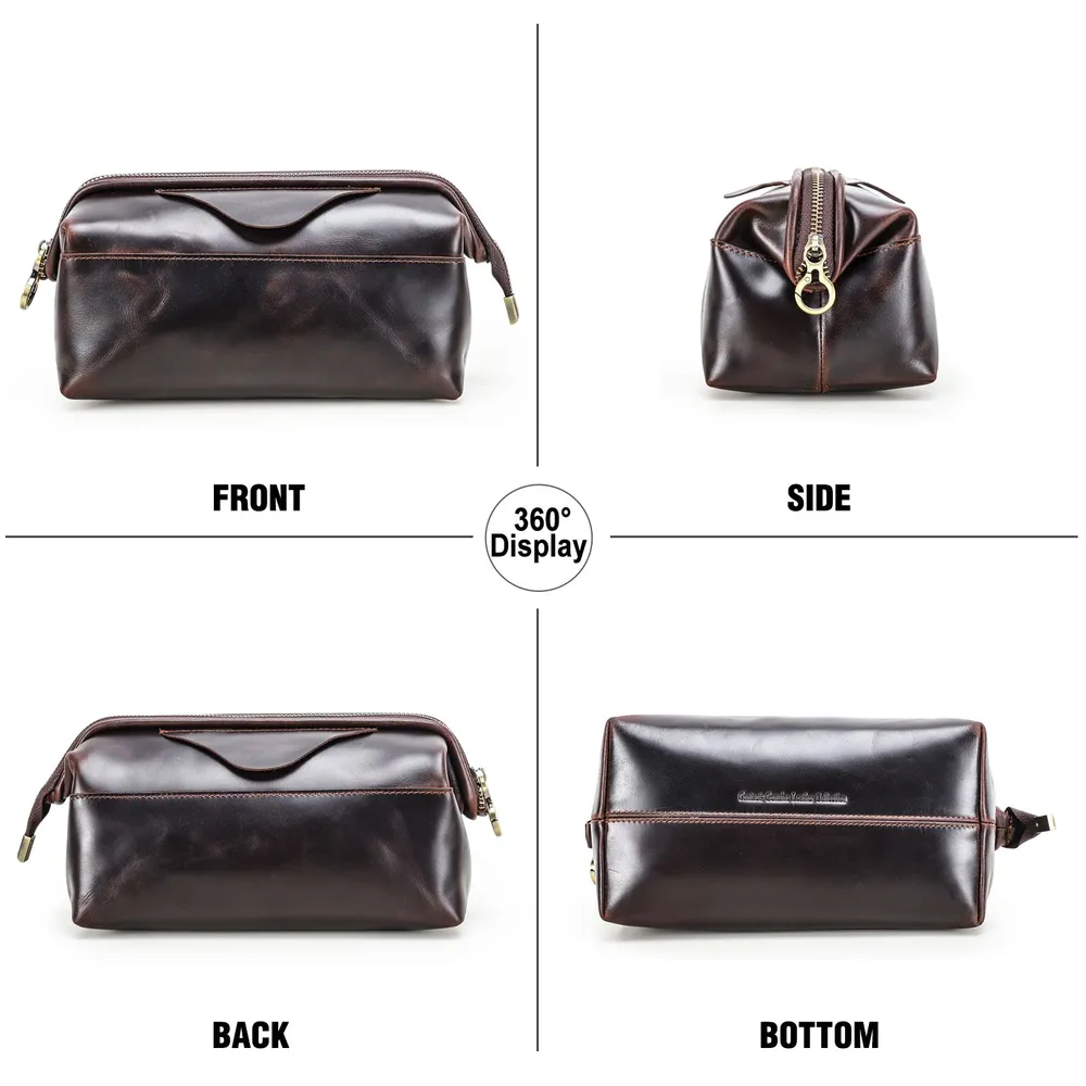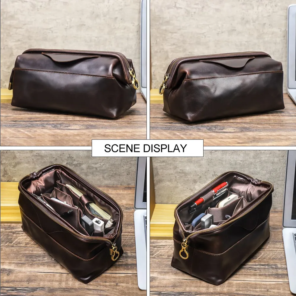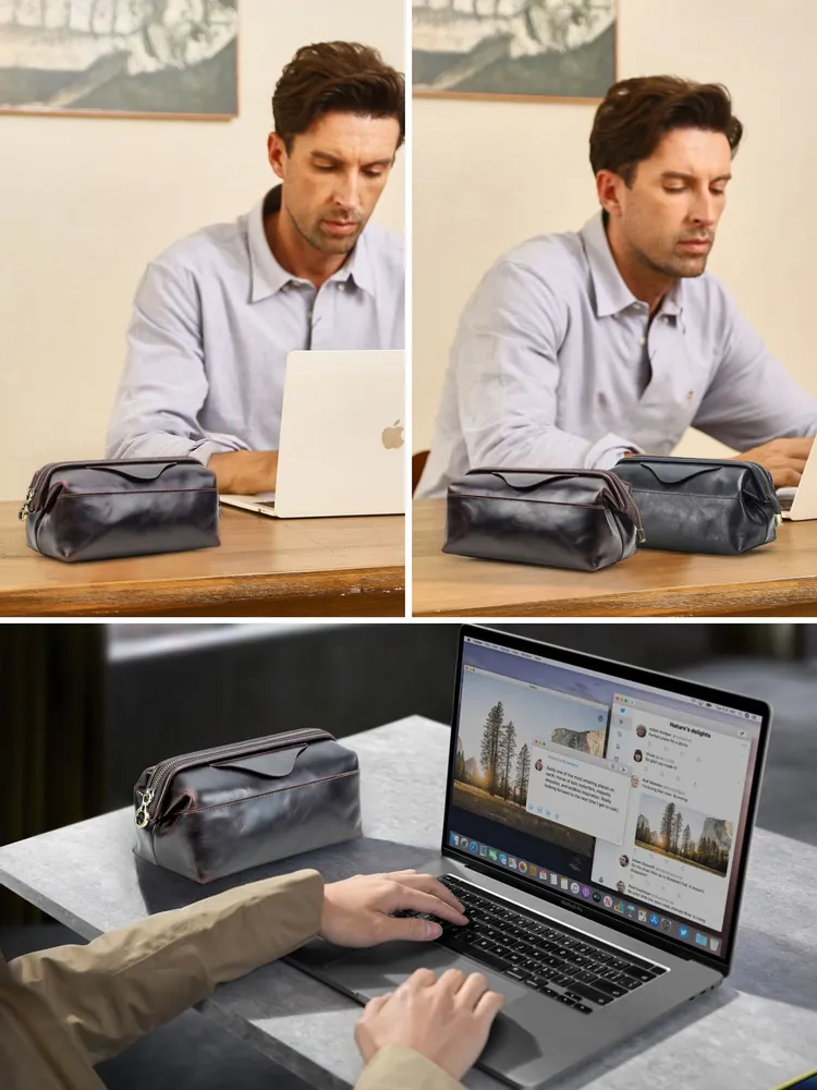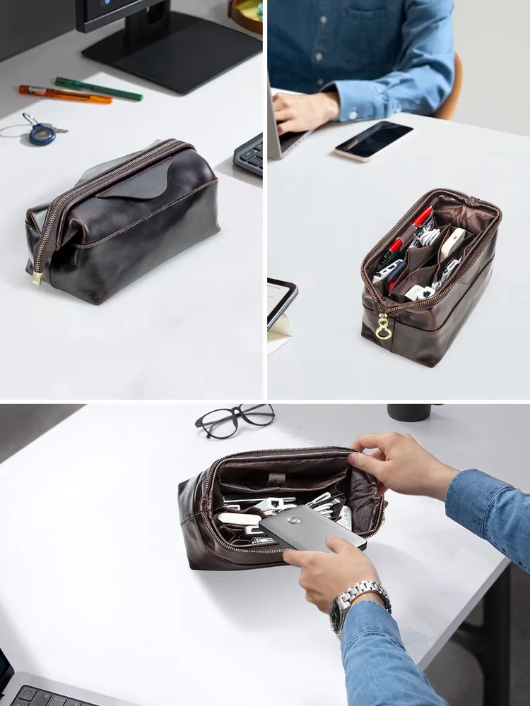 Мужской органайзер для кабелей и аксессуаров из натуральной кожи • Стильная и практичная ручная сумка-органайзер предназначена для аккуратного хранения зарядных кабелей, адаптеров, наушников и других электронных аксессуаров. Выполнена из натуральной кожи, подходит для повседневного использования, работы и поездок. Доступна в кофейном и черном цвете. • Материал: натуральная кожа, прочная и износостойкая, хорошо держит форму и сохраняет аккуратный внешний вид при ежедневном использовании. • Размеры и вес: 23,5 × 12,5 × 11 см, вес 360 г. Компактный формат позволяет носить органайзер в руках или положить в рюкзак, сумку или дорожный чемодан. • Конструкция: удобная застежка-молния обеспечивает быстрый доступ к содержимому, а встроенный металлический каркас защищает аксессуары от деформации и ударов. • Внутренняя организация: несколько функциональных отделений и карманов помогают удобно распределить кабели, power bank, зарядные устройства и мелкие гаджеты, поддерживая порядок внутри. • Дополнительные детали: предусмотрен специальный слот для AirTag, который помогает отслеживать местоположение органайзера и не потерять его в дороге. • Назначение: идеальный аксессуар для мужчин, которые ценят порядок, мобильность и аккуратное хранение техники дома, в офисе и в путешествиях.