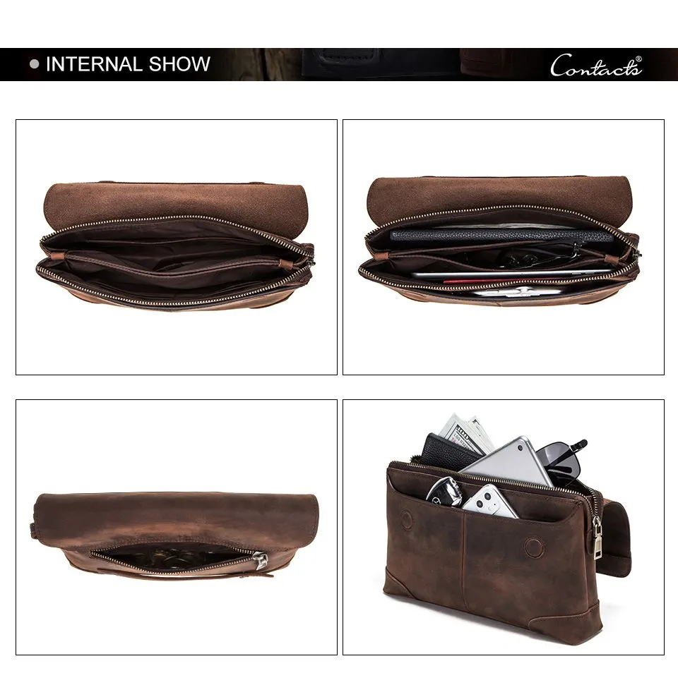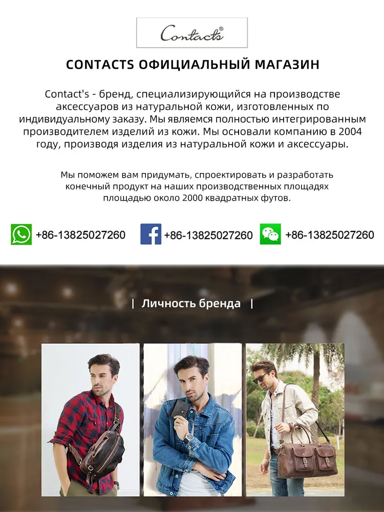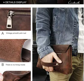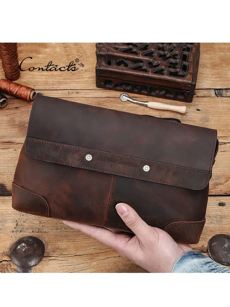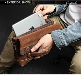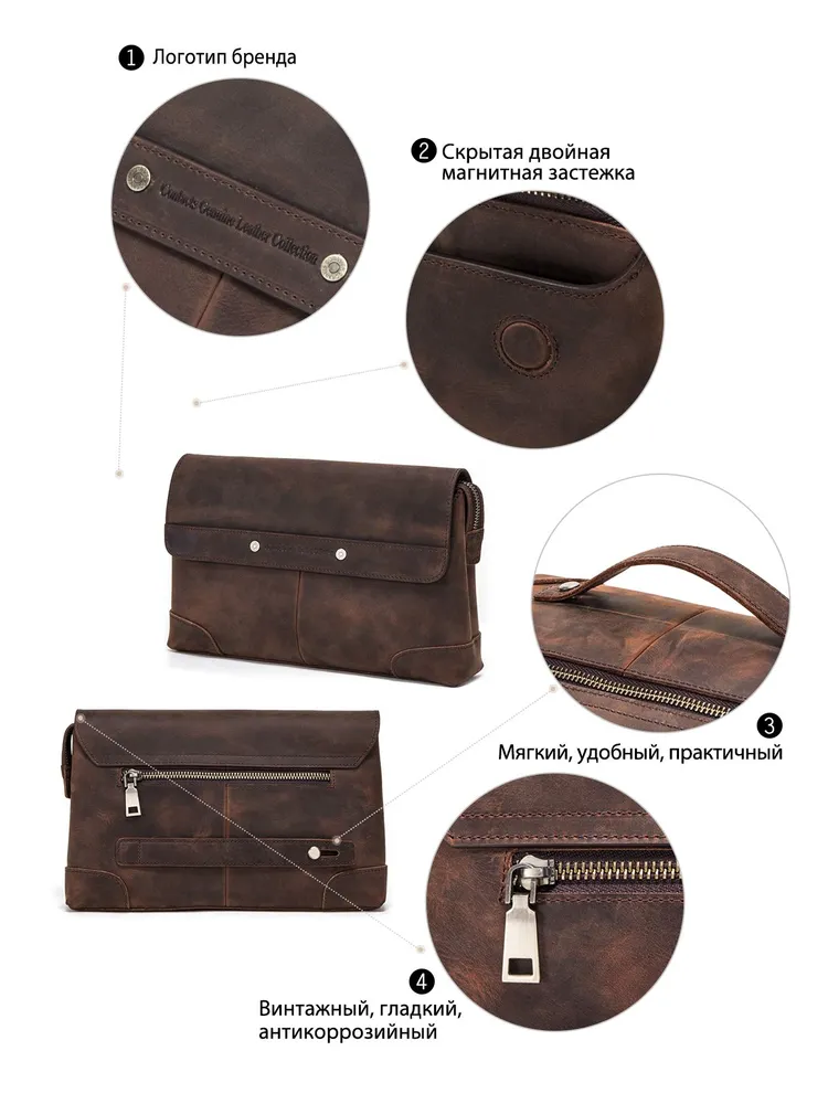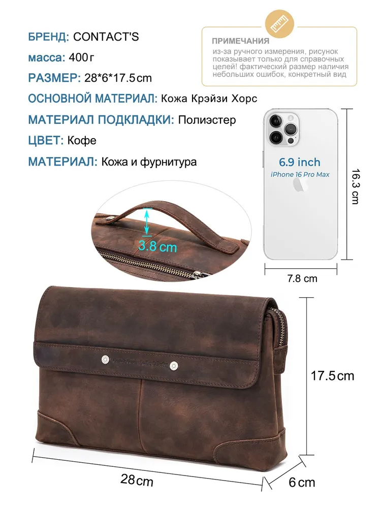 ### Продукт: Мужская сумка-клатч из натуральной кожи CONTACT'S **Описание продукта:** Эта стильная мужская сумка-клатч изготовлена из высококачественной натуральной кожи и предлагает идеальное сочетание функциональности и элегантности. Сумка имеет вес 400 грамм и размеры 28x17.5x6 см, что делает её удобной для повседневного использования. **Основные характеристики:** 1. **Высококачественная натуральная кожа:** Сумка выполнена из прочной и эстетически привлекательной натуральной кожи, обеспечивая её долговечность и стильный внешний вид. 2. **Просторное отделение:** Благодаря размерам 28x17.5x6 см, сумка-клатч предоставляет достаточно места для хранения всех необходимых вещей, включая документы, телефон, ключи и другие аксессуары. 3. **Легкий вес:** Вес всего 400 грамм делает эту сумку удобной для ношения, не создавая лишней нагрузки. 4. **Цвет:** Доступна в элегантном кофейном цвете, который придаёт сумке универсальный и классический вид. 5. **Удобство использования:** Идеально подходит для деловых встреч, повседневного использования и путешествий, обеспечивая лёгкий доступ ко всем вашим вещам.