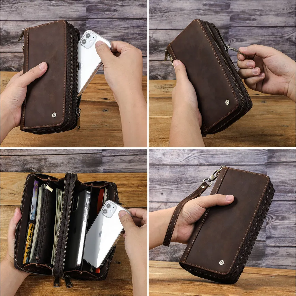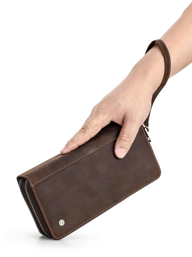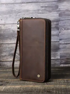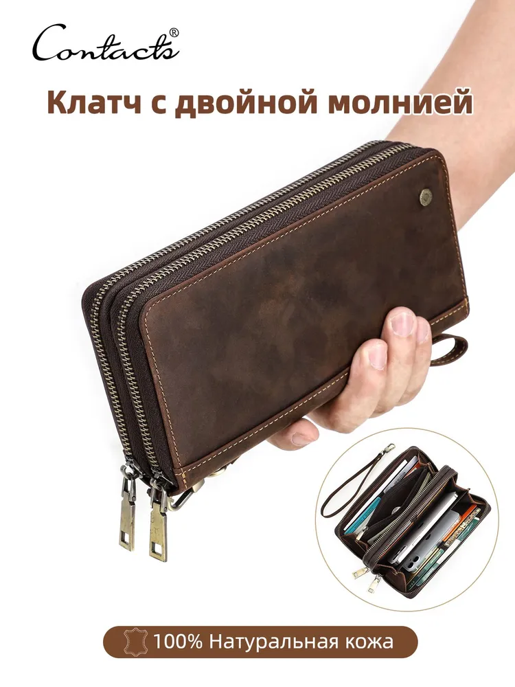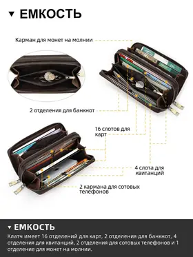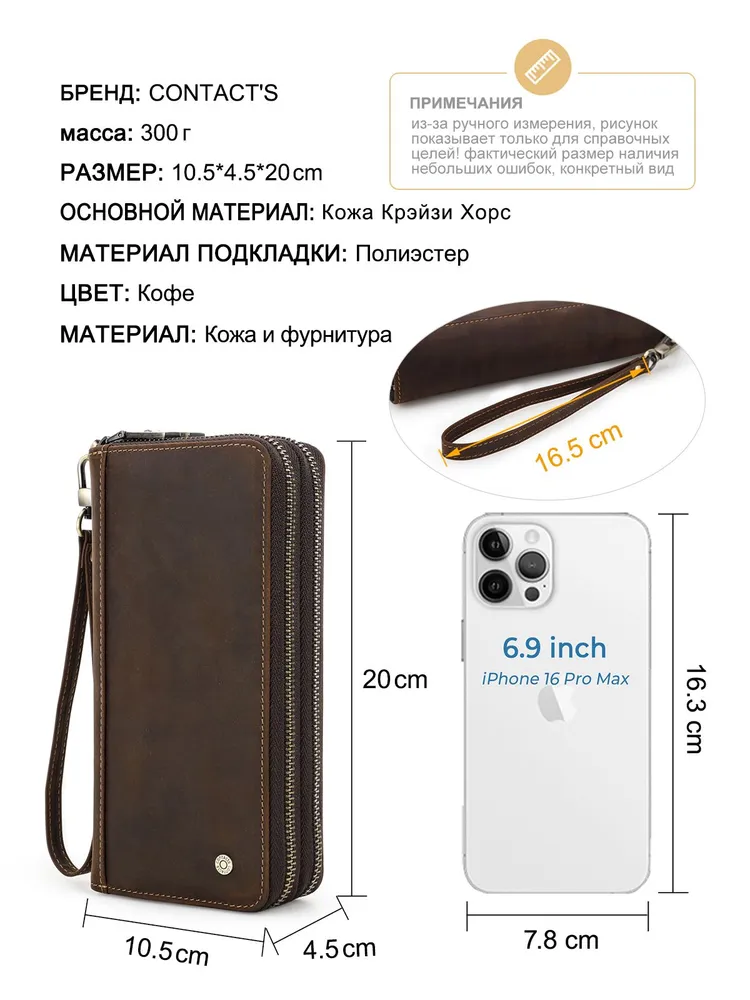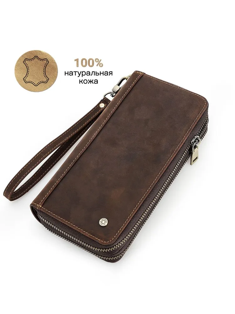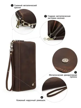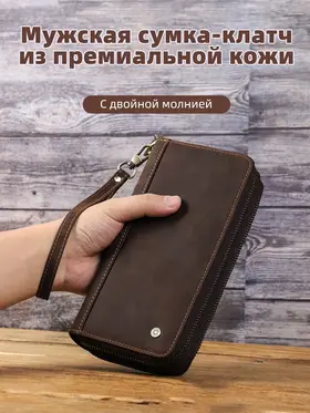 ### Продукт: Натуральная кожаная сумка-клатч, длинный кошелёк **Описание продукта:** Эта стильная и практичная сумка-клатч изготовлена из натуральной кожи и предназначена для использования как длинный кошелёк. **Основные характеристики:** 1. **Высококачественная кожа:** Изготовлена из кожи "Crazy Horse", которая придаёт сумке уникальный винтажный вид и долговечность. 2. **Размеры:** 20x10.5x4.5 см, вес 300 грамм. 3. **Большая вместимость:** Два кармана на молнии, 16 отделений для карт, 2 отделения для телефона, а также места для наличных и мелочи. 4. **Многофункциональность:** Сумка оснащена ремешком для запястья, что делает её удобной для ношения.