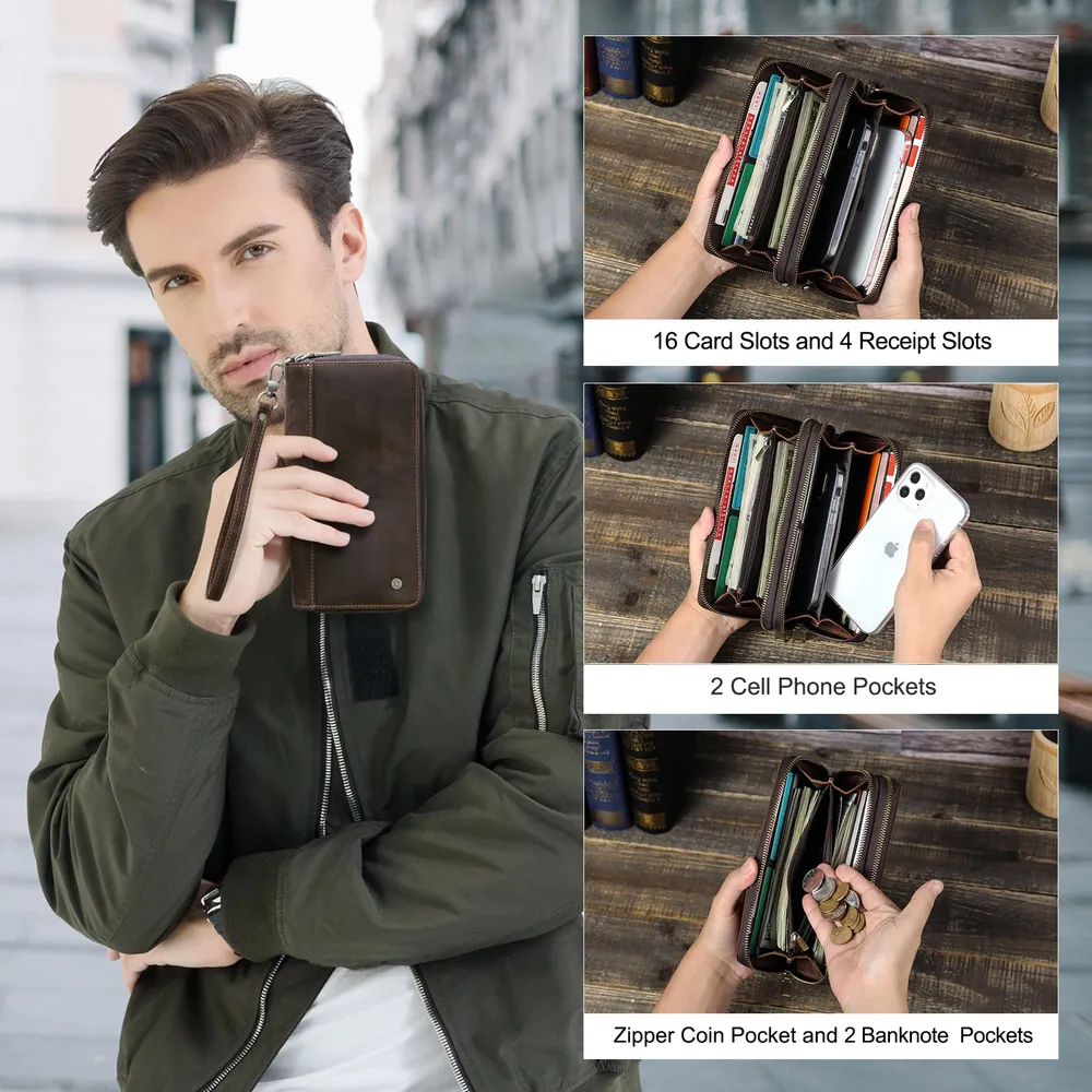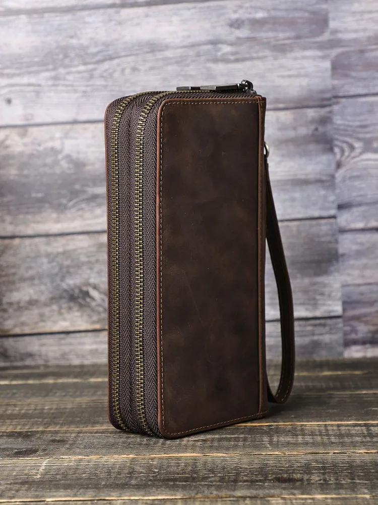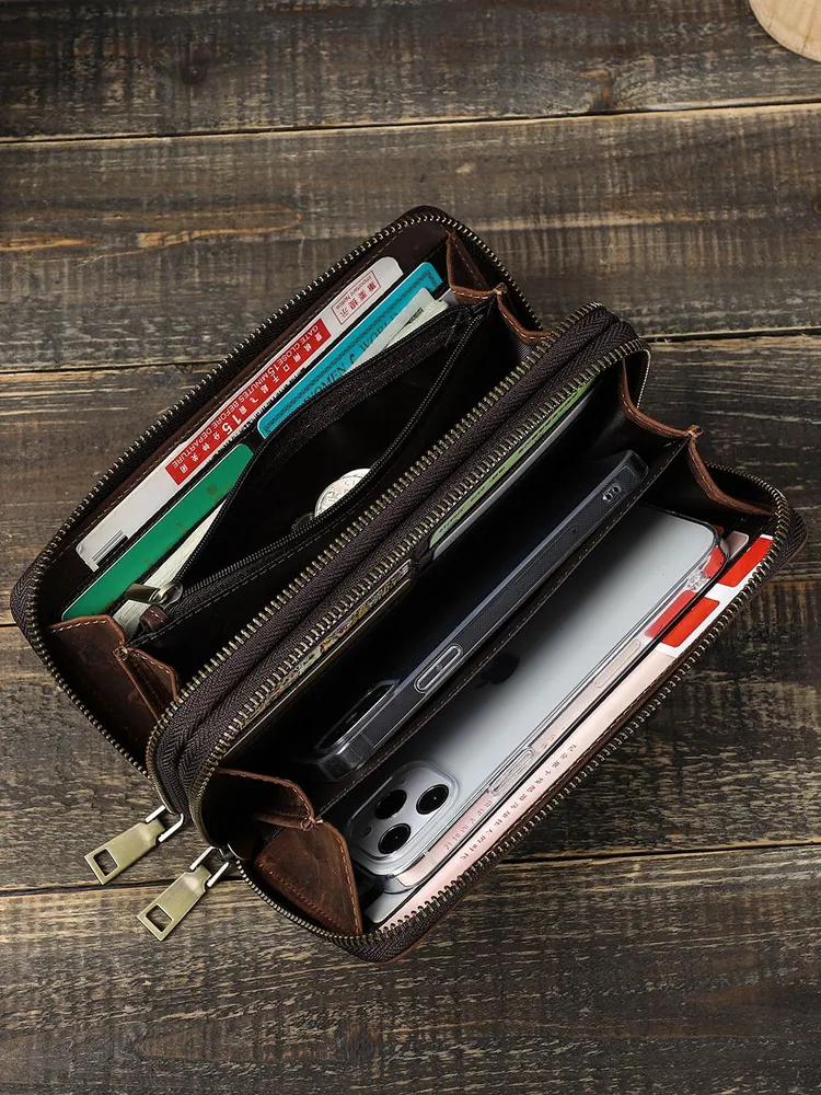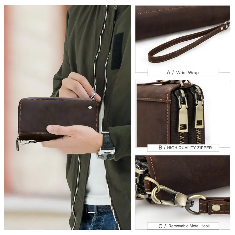 ### Продукт: Натуральная кожаная сумка-клатч, длинный кошелёк **Описание продукта:** Эта стильная и практичная сумка-клатч изготовлена из натуральной кожи и предназначена для использования как длинный кошелёк. **Основные характеристики:** 1. **Высококачественная кожа:** Изготовлена из кожи "Crazy Horse", которая придаёт сумке уникальный винтажный вид и долговечность. 2. **Размеры:** 20x10.5x4.5 см, вес 300 грамм. 3. **Большая вместимость:** Два кармана на молнии, 16 отделений для карт, 2 отделения для телефона, а также места для наличных и мелочи. 4. **Многофункциональность:** Сумка оснащена ремешком для запястья, что делает её удобной для ношения.