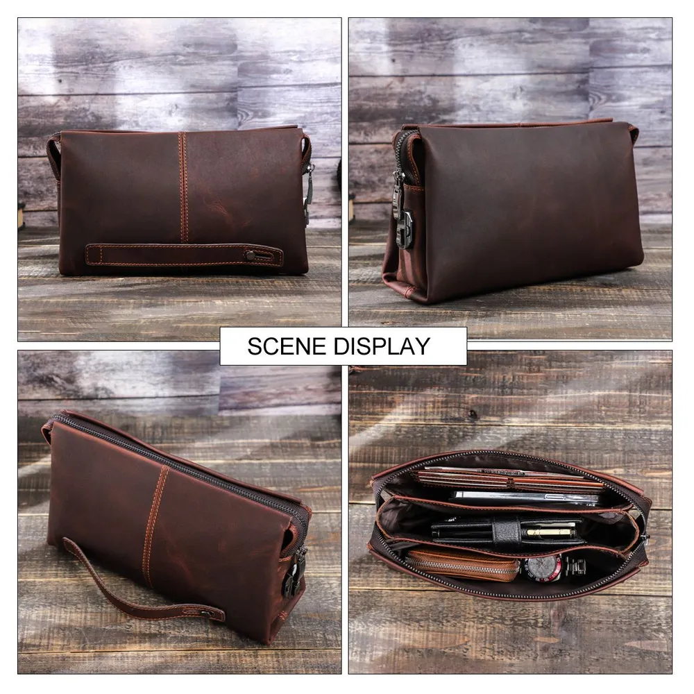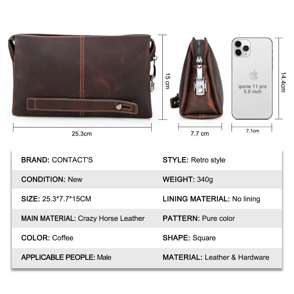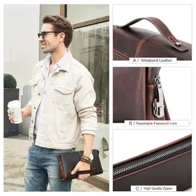### Продукт: Клатч из натуральной кожи с паролем CONTACT'S **Описание продукта:** Этот стильный кожаный клатч оснащен паролем для обеспечения дополнительной безопасности ваших вещей. С размерами 25.3x15x7.7 см и весом 340 грамм, он идеально подходит для повседневного использования и деловых встреч. Клатч представлен в двух элегантных цветах: кофейном и синем. **Основные характеристики:** 1. **Высококачественная натуральная кожа:** Клатч выполнен из прочной и эстетически привлекательной натуральной кожи, что обеспечивает его долговечность и стильный внешний вид. 2. **Парольный замок:** Клатч оснащен надежным замком с паролем, который обеспечивает безопасность ваших личных вещей и документов. 3. **Удобный размер и легкий вес:** С размерами 25.3x15x7.7 см и весом 340 грамм, клатч удобен для ношения и не создает лишней нагрузки. 4. **Два элегантных цвета:** Клатч доступен в классическом кофейном и стильном синем цветах, что позволяет выбрать вариант по своему вкусу. 5. **Боковой ремешок:** Клатч оснащен боковым ремешком для удобного ношения на запястье. 6. **Многофункциональный внутренний дизайн:** Внутри клатча предусмотрено 6 слотов для карт, что позволяет удобно разместить все необходимые карты и документы.