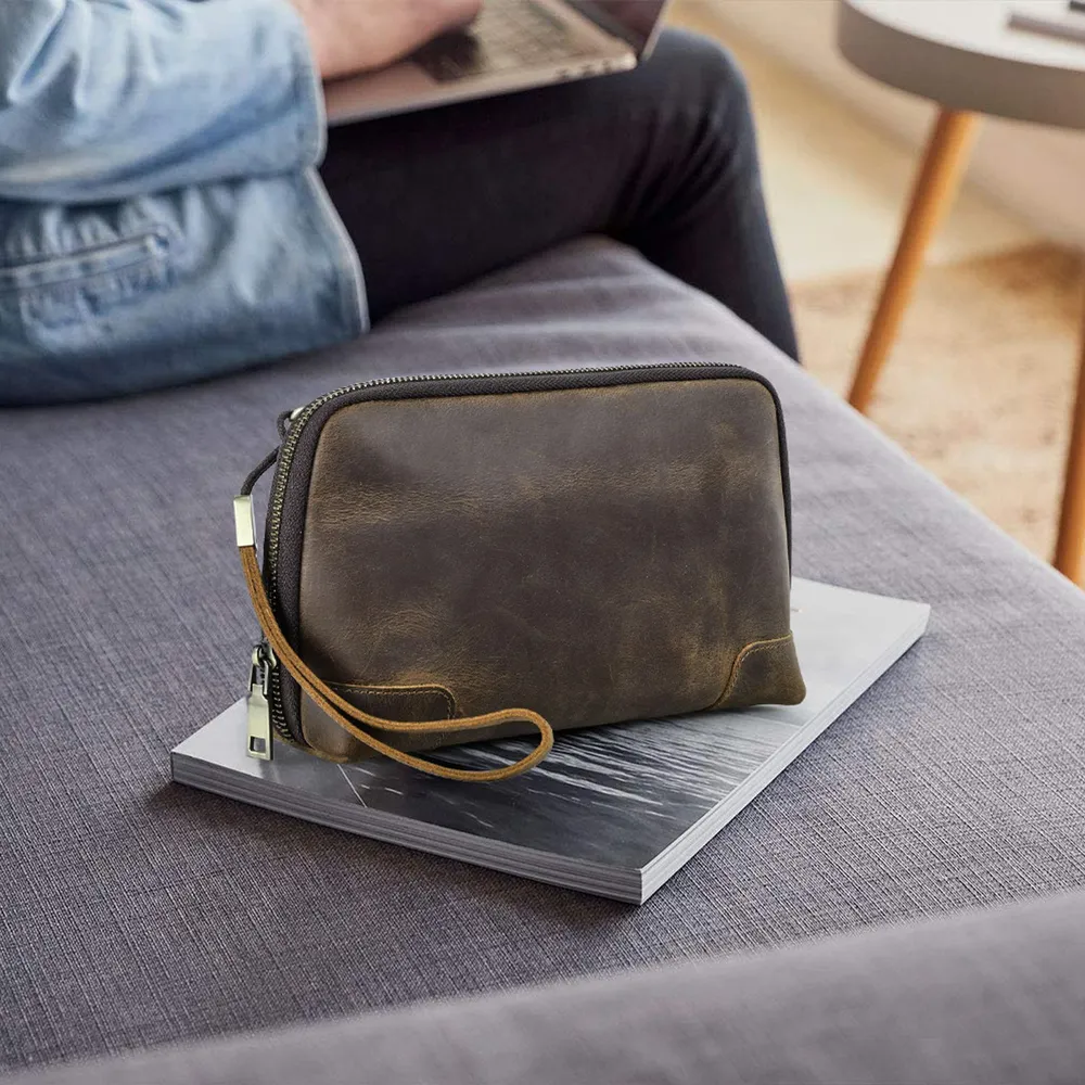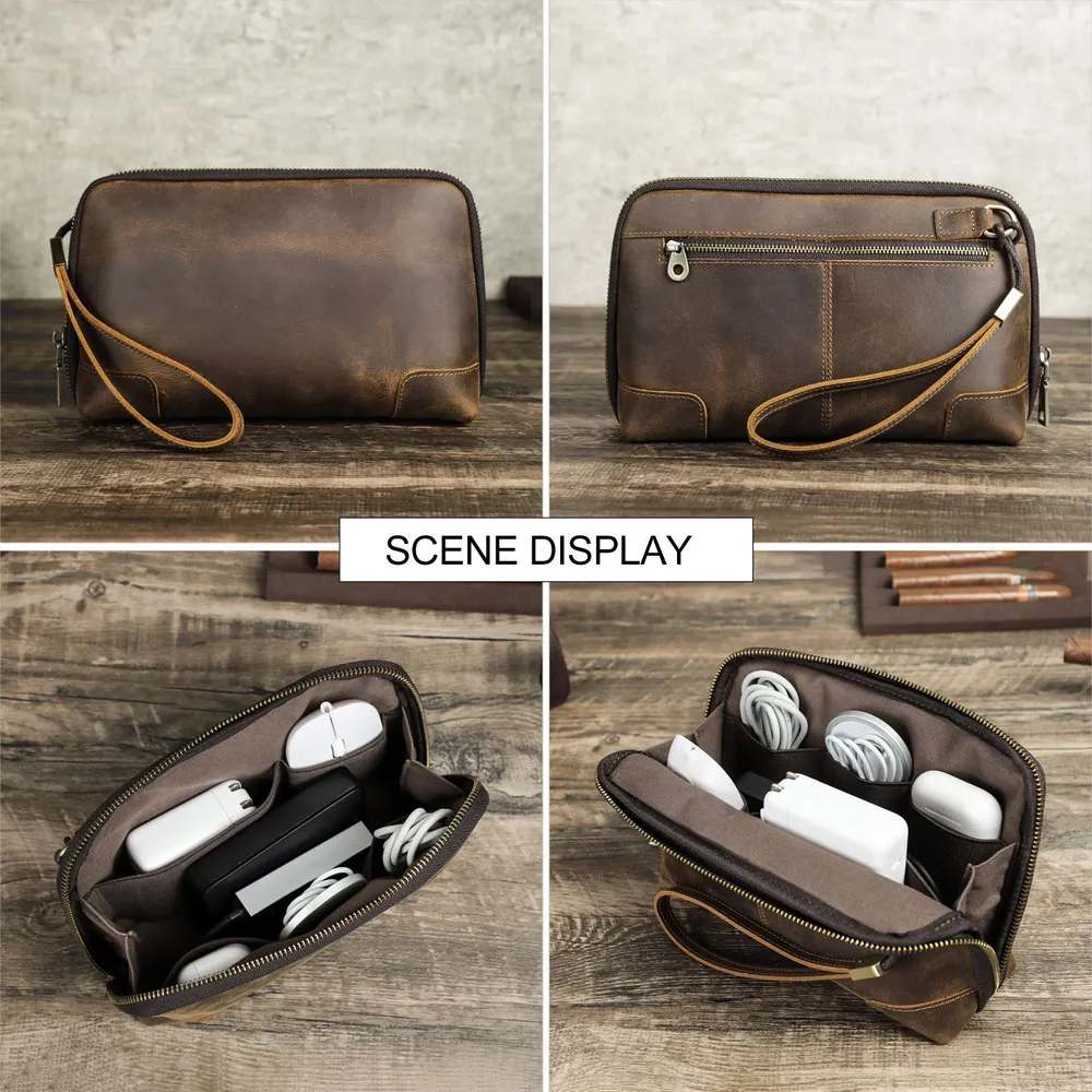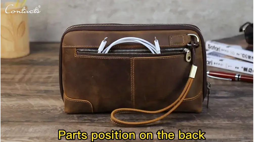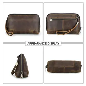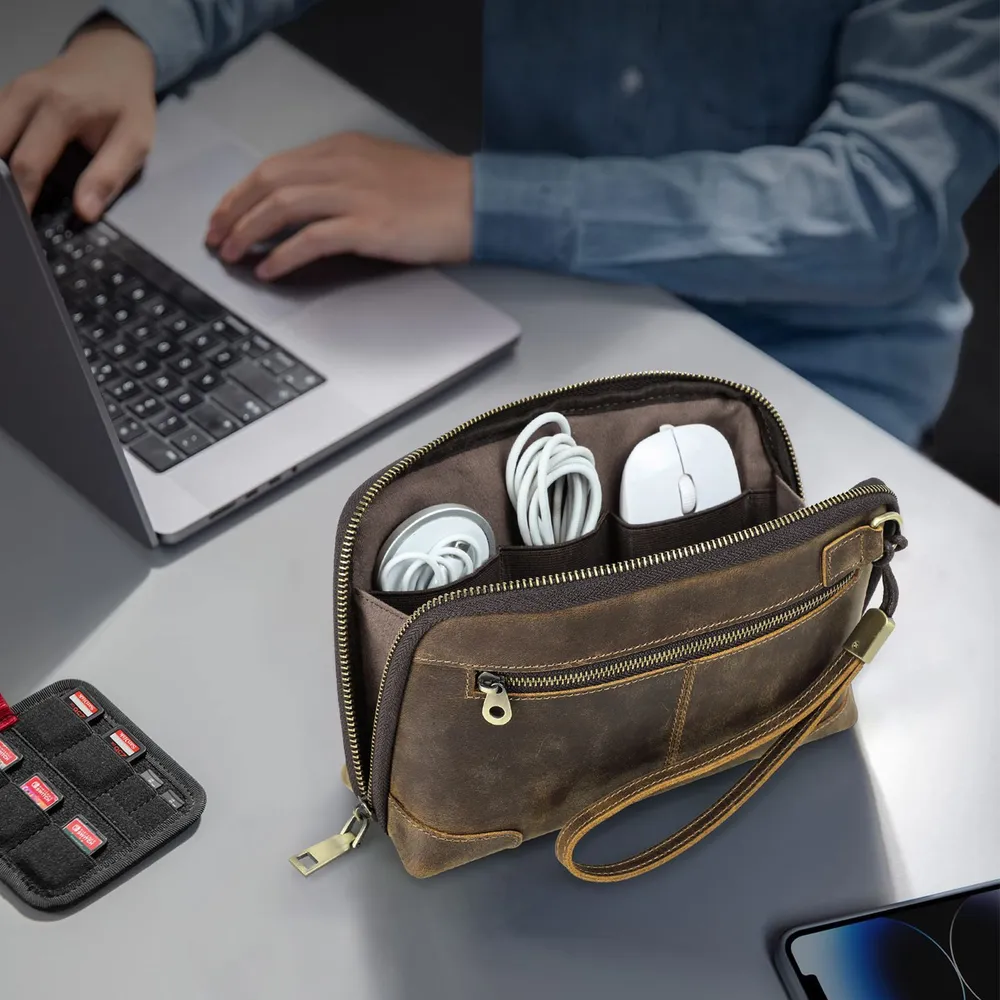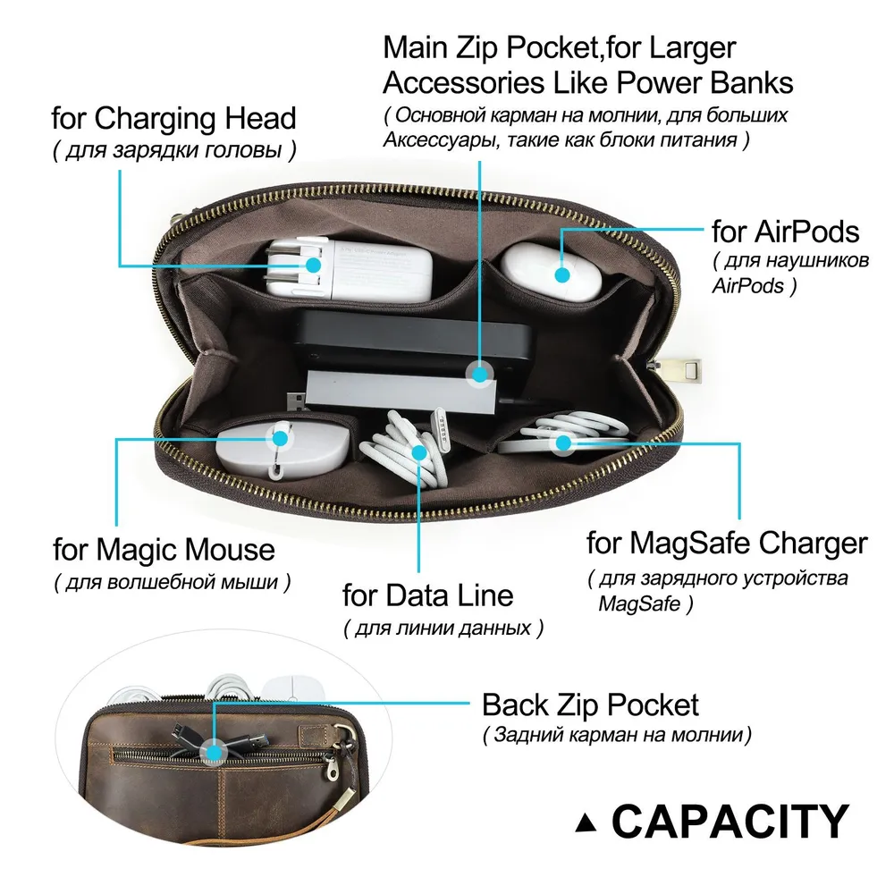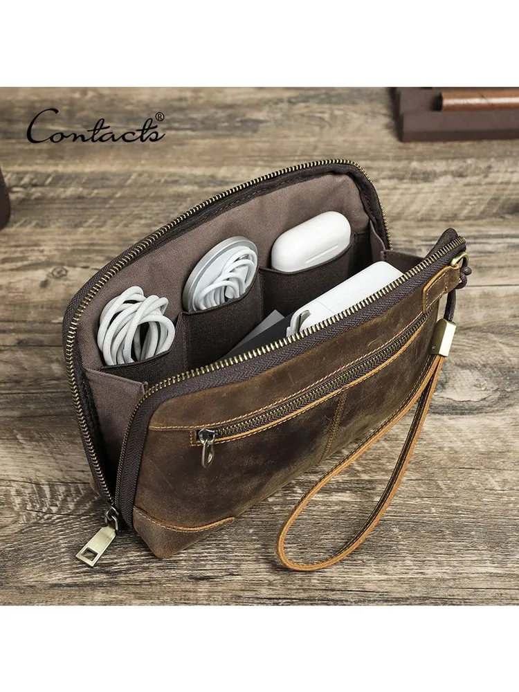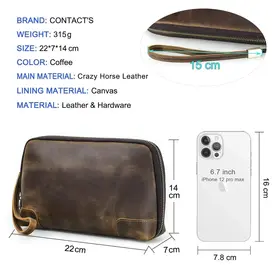 ### Продукт: Кожаный мужской клатч CONTACT'S для хранения электронных аксессуаров и кошелек **Описание продукта:** Эта элегантная и функциональная сумка выполнена из высококачественной натуральной кожи и предназначена для хранения электронных аксессуаров. С размерами 22x14x7 см и весом 315 грамм, она удобна для переноски и оснащена удобным ремешком для запястья. **Основные характеристики:** 1. **Высококачественная кожа:** Мужской органайзер изготовлен из цельнозернистой кожи, которая отличается долговечностью и уникальным внешним видом. Со временем кожа становится ещё красивее и приобретает благородную патину, сочетая прикосновения роскоши и антиквариата. 2. **Вместимость:** Мини-сумка для мужских гаджетов оснащена 5 небольшими карманами для размещения мышей, кабелей, зарядных устройств MagSafe, зарядных головок и наушников. Основное отделение на молнии вмещает другие аксессуары, такие как пауэрбанки и зарядные устройства. 3. **Компактные размеры:** С размерами 22x14x7 см, сумка легко помещается в рюкзак, сумку или багаж. Она компактна и легка, что делает её идеальным выбором для путешествий. 4. **Портативность:** Коричневая кожаная сумка подходит для ночевок, отдыха, деловых поездок, путешествий за границу и повседневной жизни. Она организует ваши электронные аксессуары, демонстрируя ваш идеальный стиль и джентльменский вкус. 5. **Отличный подарок:** Коричневая мужская сумка станет прекрасным подарком на День святого Валентина, День отца, День благодарения, Рождество и Новый год для вашего отца, мужа, брата, сына или других членов семьи.