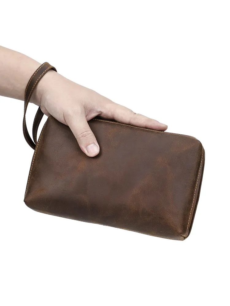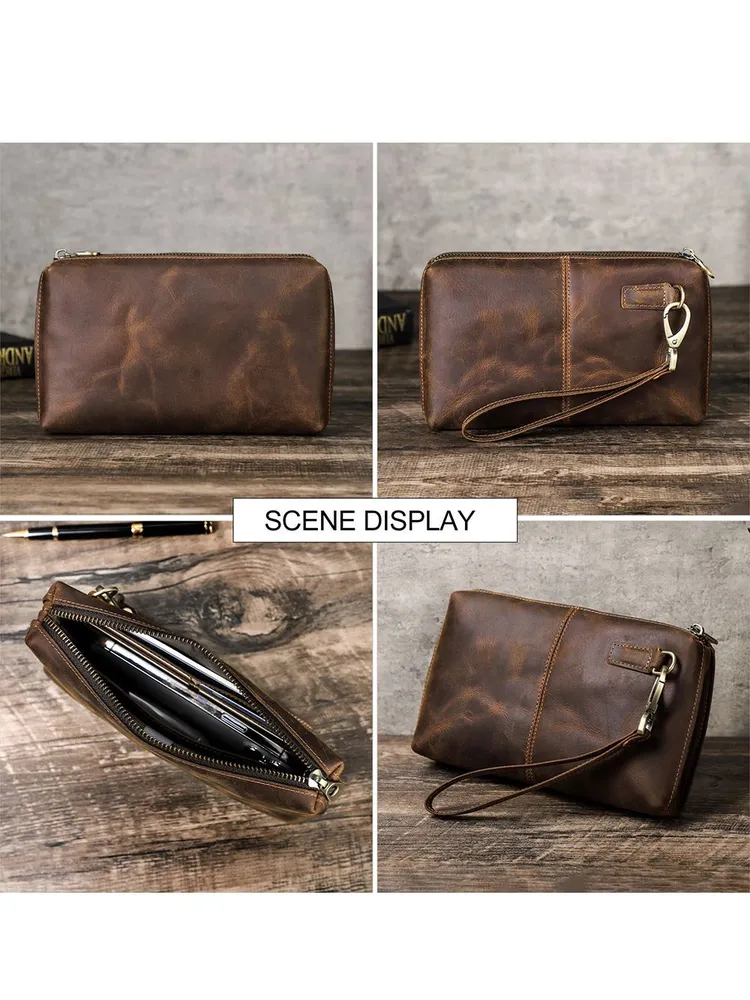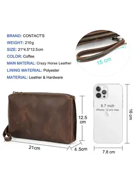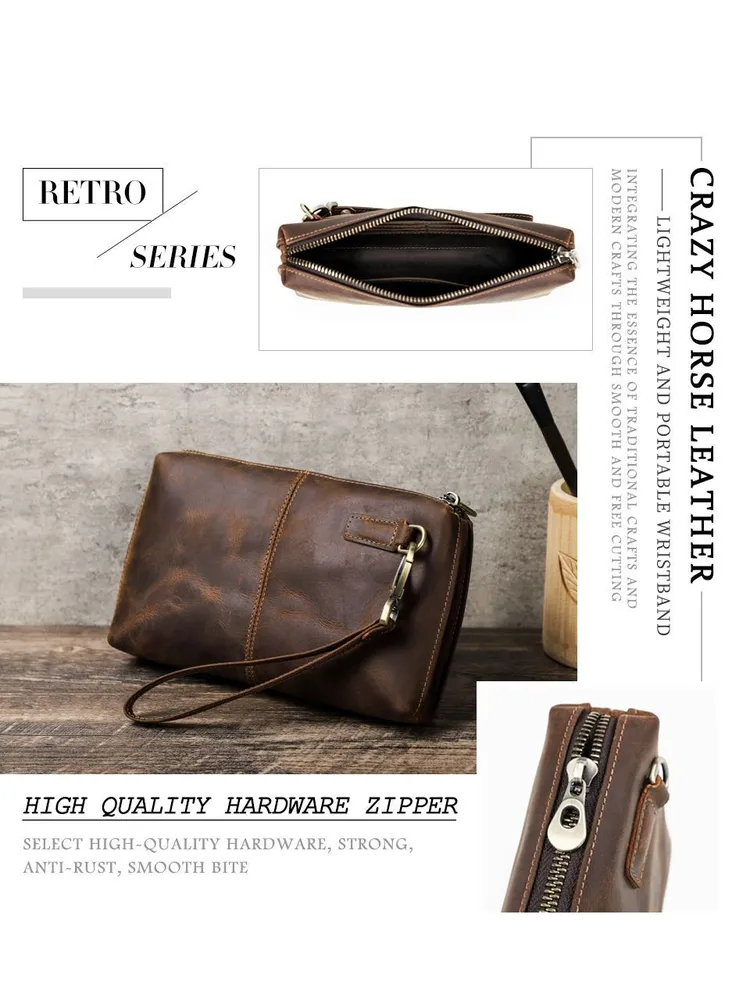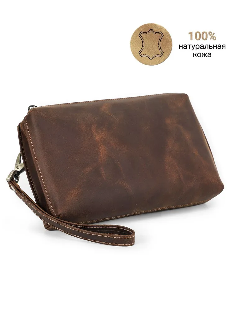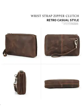 ### Продукт: Мужская кожаная сумка-клатч из натуральной кожи с RFID защитой **Описание продукта:** Эта изысканная мужская сумка-клатч выполнена из высококачественной натуральной кожи в винтажном стиле. Благодаря своей универсальности и функциональности, она станет идеальным аксессуаром для современных мужчин. **Основные характеристики:** 1. **Винтажный дизайн:** Клатч выполнен в ретро-стиле, что придает ему уникальный и элегантный вид. 2. **Высококачественные материалы:** Натуральная кожа обеспечивает долговечность и эстетичность, защищая содержимое от повреждений. 3. **Большая вместимость:** Сумка имеет достаточно места для хранения всех необходимых вещей, включая длинный кошелек и другие аксессуары. 4. **RFID защита:** Встроенная RFID защита предотвращает несанкционированное считывание данных с ваших банковских карт и документов. 5. **Удобный ремешок:** Сумка оснащена удобным ручным ремешком, что обеспечивает дополнительное удобство при использовании.