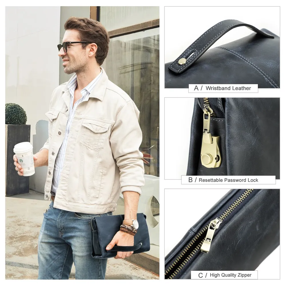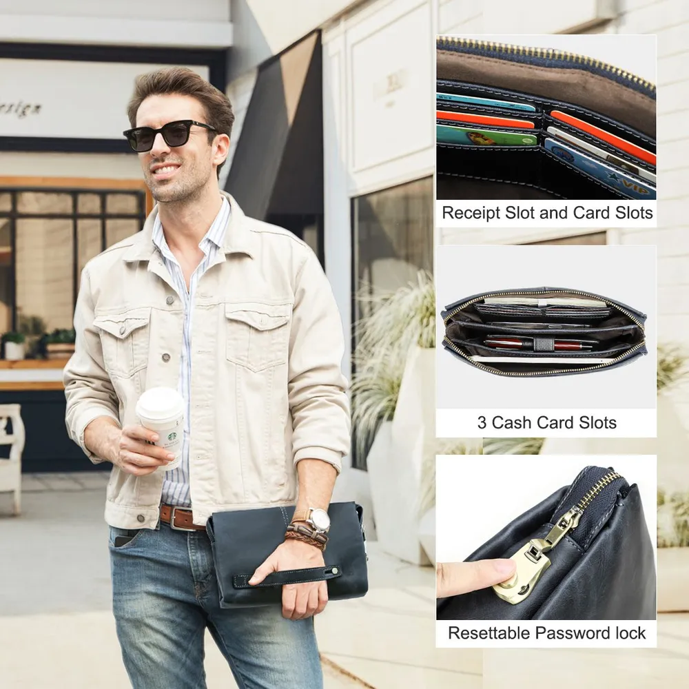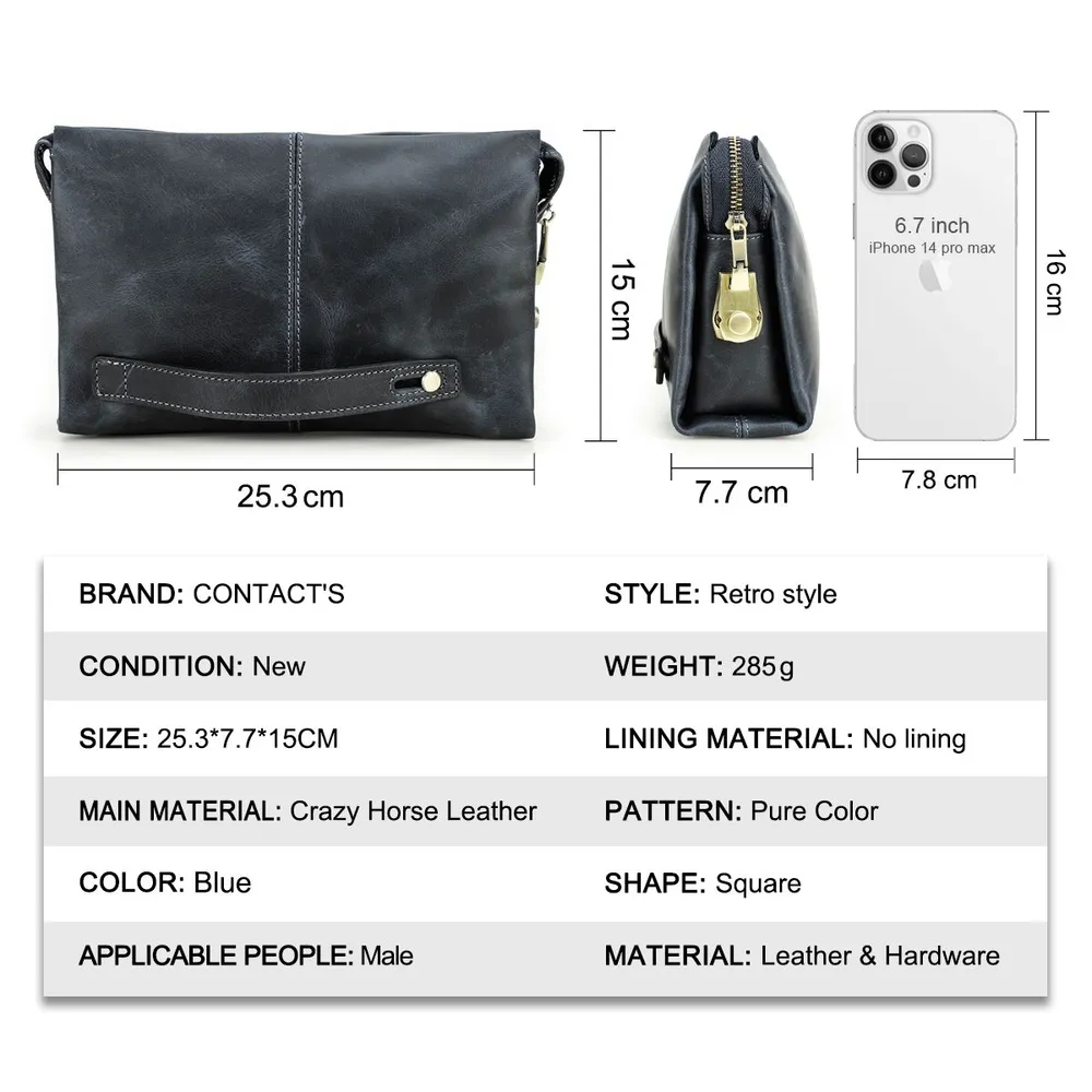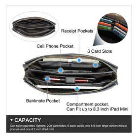 ### Продукт: Клатч из натуральной кожи с паролем CONTACT'S **Описание продукта:** Этот стильный кожаный клатч оснащен паролем для обеспечения дополнительной безопасности ваших вещей. С размерами 25.3x15x7.7 см и весом 340 грамм, он идеально подходит для повседневного использования и деловых встреч. Клатч представлен в двух элегантных цветах: кофейном и синем. **Основные характеристики:** 1. **Высококачественная натуральная кожа:** Клатч выполнен из прочной и эстетически привлекательной натуральной кожи, что обеспечивает его долговечность и стильный внешний вид. 2. **Парольный замок:** Клатч оснащен надежным замком с паролем, который обеспечивает безопасность ваших личных вещей и документов. 3. **Удобный размер и легкий вес:** С размерами 25.3x15x7.7 см и весом 340 грамм, клатч удобен для ношения и не создает лишней нагрузки. 4. **Два элегантных цвета:** Клатч доступен в классическом кофейном и стильном синем цветах, что позволяет выбрать вариант по своему вкусу. 5. **Боковой ремешок:** Клатч оснащен боковым ремешком для удобного ношения на запястье. 6. **Многофункциональный внутренний дизайн:** Внутри клатча предусмотрено 6 слотов для карт, что позволяет удобно разместить все необходимые карты и документы.