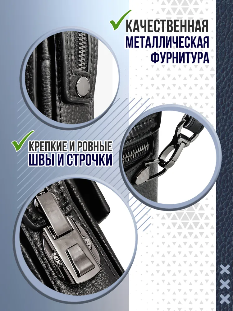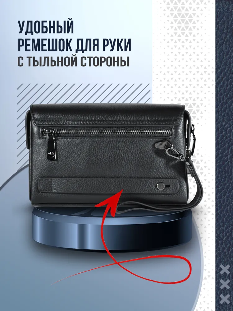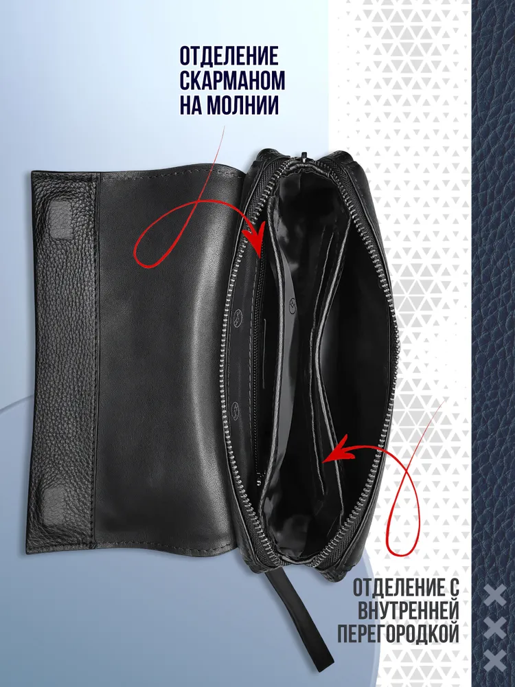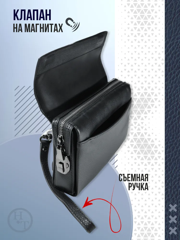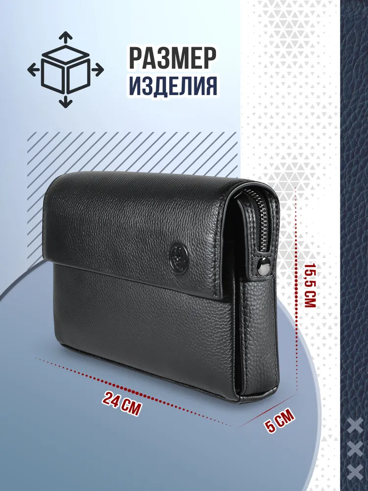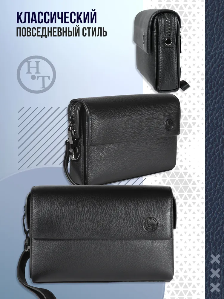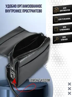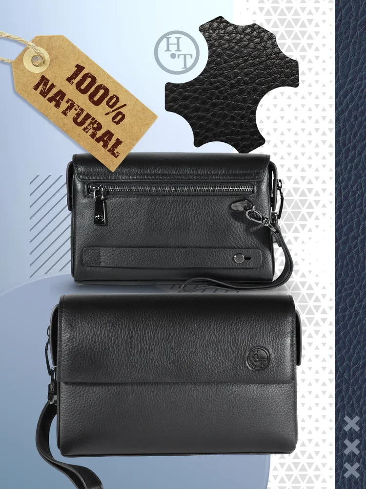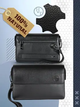 Клатч мужской HT 1559-4 изготовлен из высококачественной натуральной кожи чёрного цвета, фурнитура из металлического сплава. Барсетка имеет одно основное отделение на молнии, в котором один врезной карман на молнии для документов, открытый накладной карман для телефона и карман для мелочей. Снаружи с лицевой стороны под клапаном расположен карман во всю длину. С обратной стороны расположен врезной карман на молнии и ручка-захват для удобного ношения в руке. В комплекте кожаный ремешок на запястье. Закрывается клатч на молнию с кодовым замком и дополнительно прикрывается клапаном на магнитах. Стильный, практичный мужской портмоне - клатч позволит навести порядок в собственных карманах. Отличный подарок для любимого.