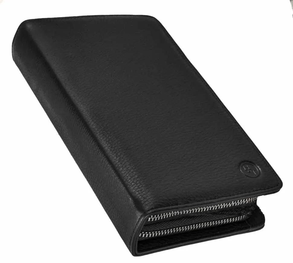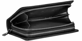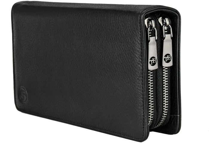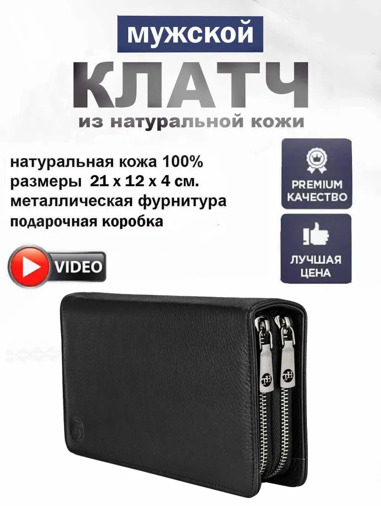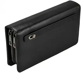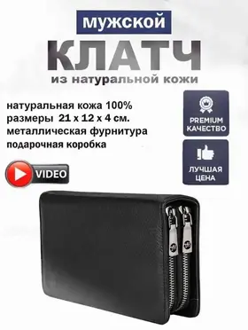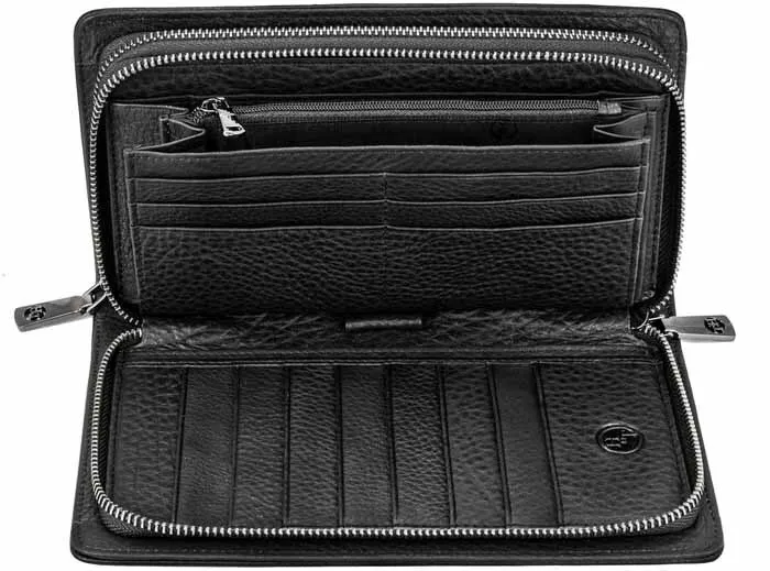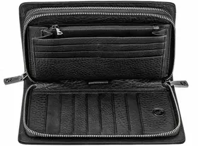 Объемный мужской клатч черного цвета, из натуральной кожи с зернистой фактурой. Держишь в руках – и чувствуешь качество, солидная вещь. Внутри комфортно разместятся документы для авто, паспорт, наличность и пластиковые карточки. Не нужно думать, куда все это распихать по карманам, все под рукой, в одном месте. Всего для карточек 19 отделений. Хватит на все случаи жизни, и дисконтные, и кредитки, и визитки. Отделение для наличности разделено карманом-перегородкой на молнии, который удобно использовать для монет. Больше не нужно рыться по карманам в поисках мелочи, все аккуратно сложено. В соседнем отделении потайной карман. Для самых ценных вещей, о которых знаешь только ты. Оба отделения закрываются на молнии. Надежно, ничего не выпадет и не потеряется. На обратной стороне модели прижимной хлястик для ладони. Удобно держать в руке, не выскользнет. В комплекте фирменная коробка для хранения. Чтобы клатч не пылился и всегда выглядел как новый. Размеры: ширина – 22 см, высота – 13 см, толщина – 5 см. Вроде и не маленький, но в руке лежит удобно. В общем, отличный аксессуар для тех, кто ценит порядок и стиль. 3017