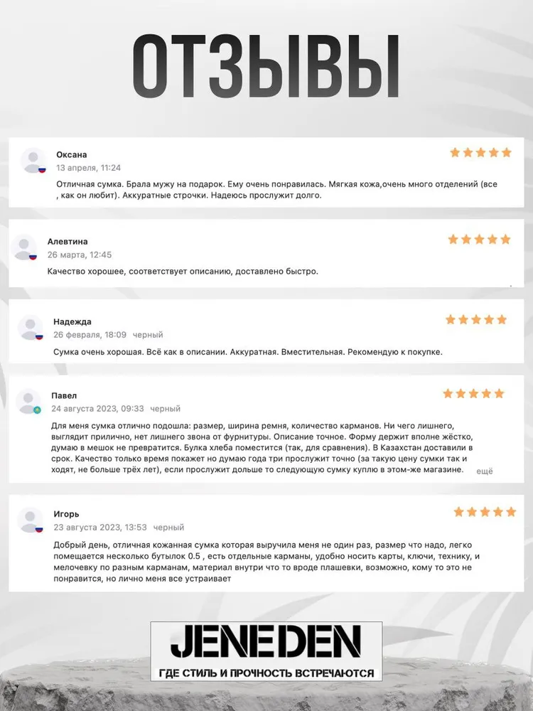 Натуральная кожа Сумка JENEDEN из натуральной воловьей кожи. Элегантность и долговечность в каждой детали. Идеально подходит как для офисного стиля, так и для повседневного использования. Большие размеры позволяют взять с собой все необходимо Подарок Сумка идеально подходит для подарка премиум качества мужчине на любой праздник. Изготовлена из влагостойкого материала, который защищает ваши вещи от влаги и непогоды. Идеальный выбор для любого времени года. Длительная служба Натуральная кожа и качественная сборка гарантируют долговечность и надежность сумки. Следите за своим стилем годами. Идеальный выбор Сумка JENEDEN – это не просто сумка, это ваш стиль и удобство в каждый день. Выбирайте качество и надежность.