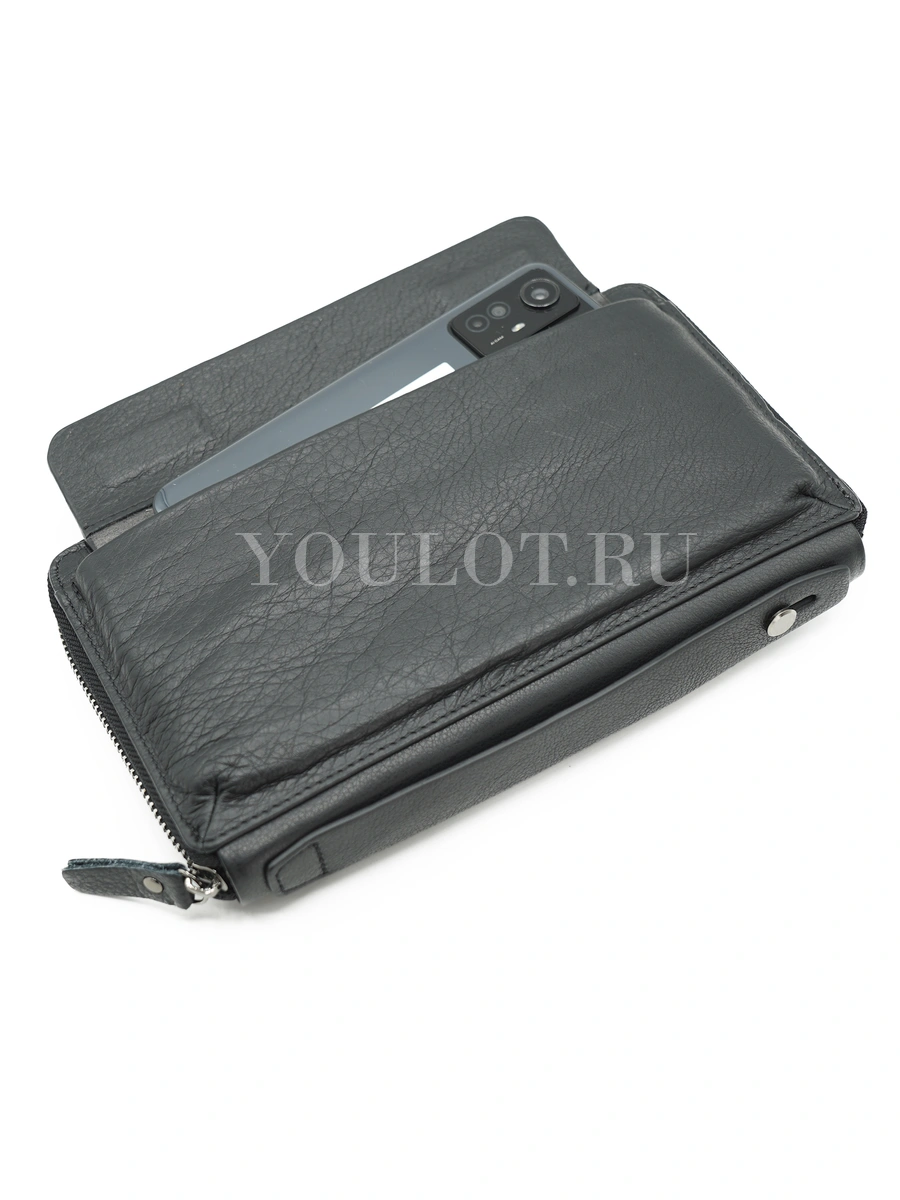 Для карт предусмотрены шесть индивидуальных слотов, а отдельный карман для визиток избавит от беспорядка. На лицевой стороне расположен карман для смартфона с магнитным замком — он обеспечивает быстрый доступ к телефону и надёжно фиксирует его внутри. Практичная ручка снизу делает клатч удобным для ношения в руке и подчёркивает его статусный характер.