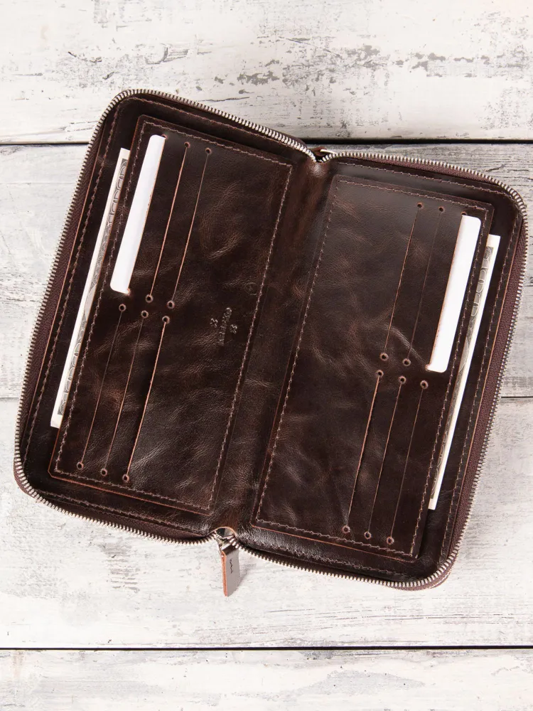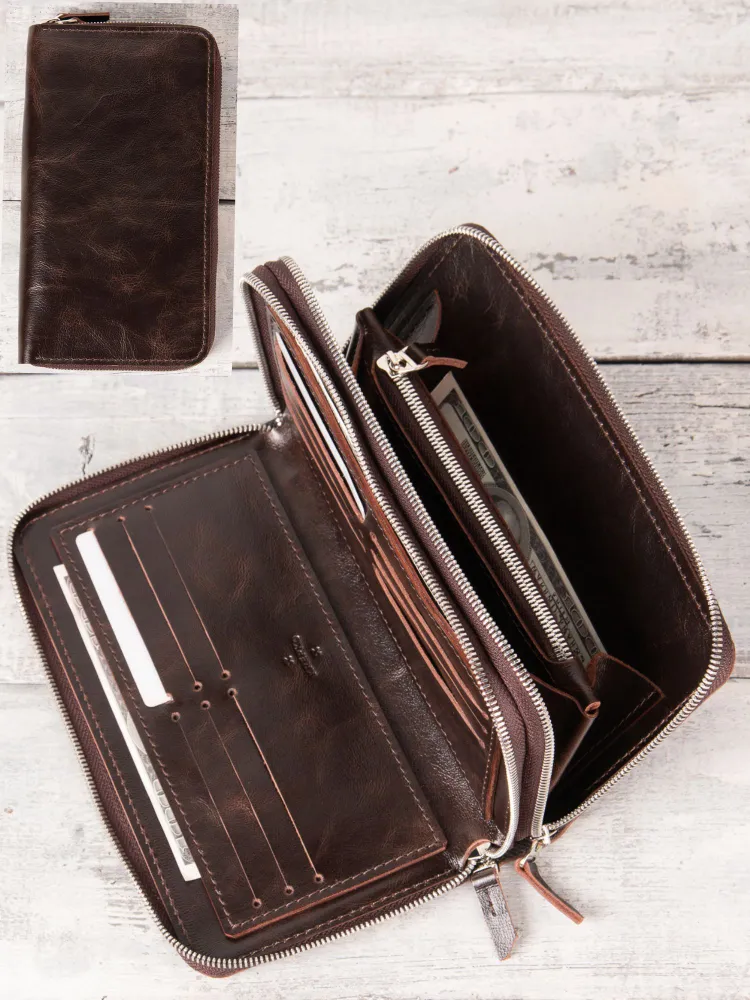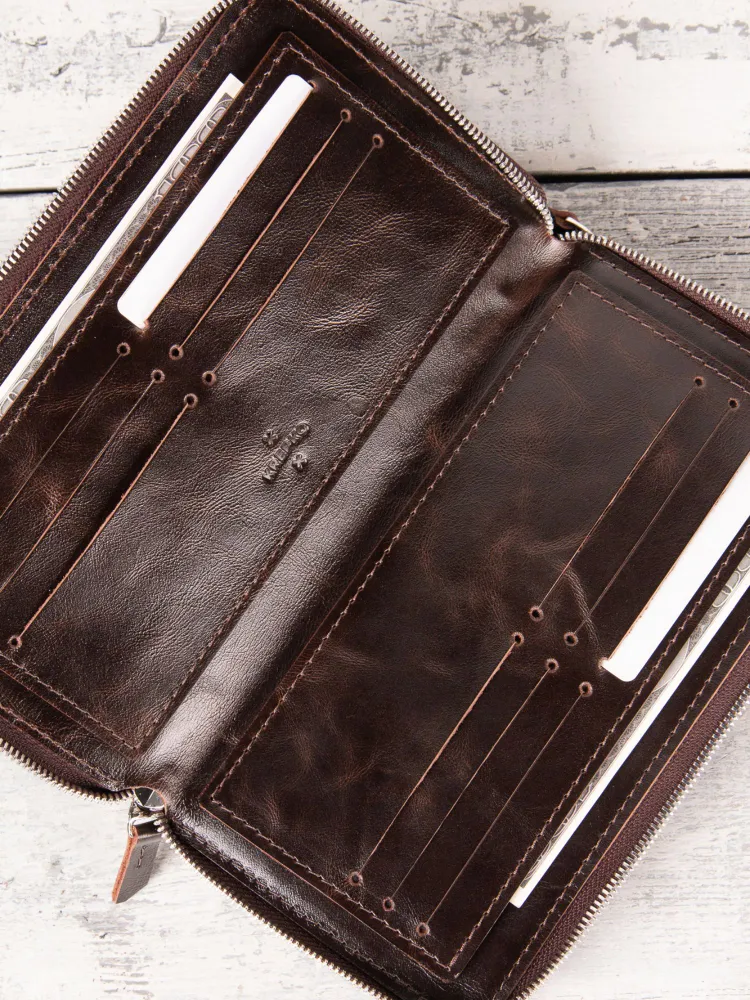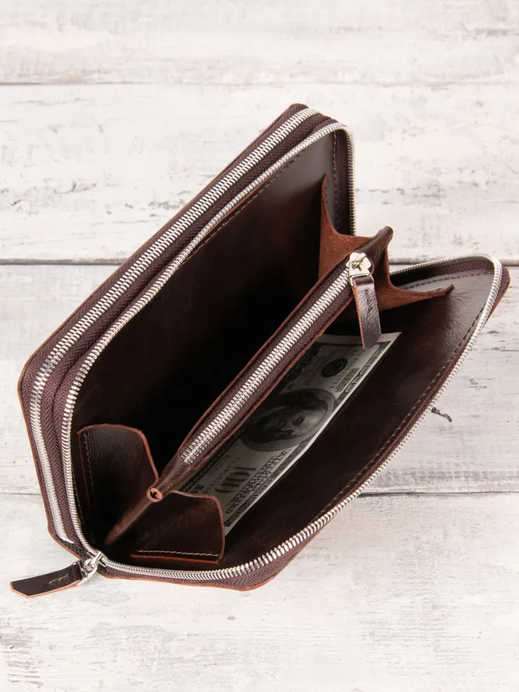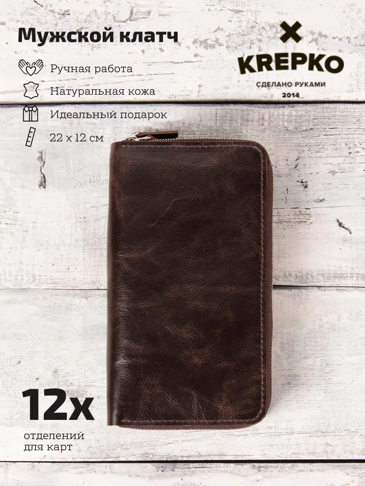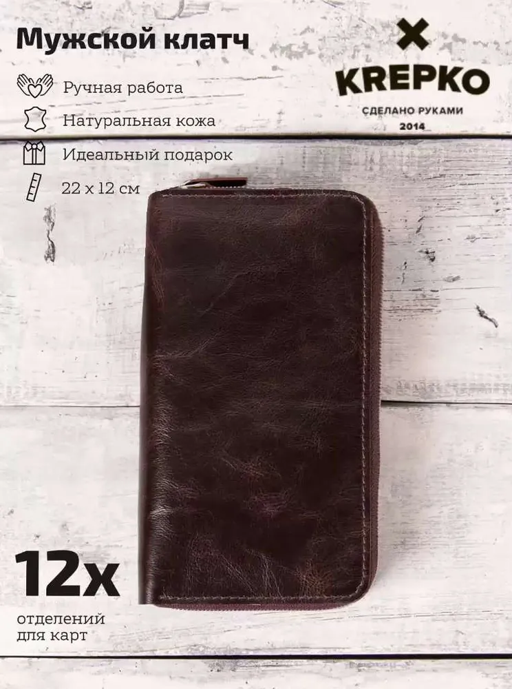 Портмоне из натуральной кожи от KREPKO Кожаный органайзер KREPKO — мужской клатч-портмоне на двух молниях ручной работы. Вместительные отделения для карт, визиток, купюр, автодокументов, паспорта. Компактный размер: 22×12 см. Стильный и надежный аксессуар для порядка. Отличный подарок на 23 февраля, Новый год, ДР! Купите премиум-функционал! Характеристики ‣ Материал: Натуральная кожа премиум-класса (ручная работа) ‣ Отделения: Карты, визитки, купюры, автодокументы, паспорт ‣ Закрытие: Две молнии для безопасности ‣ Размер: 22×12 см — карманный клатч ‣ Дизайн: Компактный, вместительный ‣ Уход: Протирать влажной тканью Для офиса и автомобиля. Преимущества ‣ Функциональность: Все документы и карты в идеальном порядке. ‣ Долговечность: Премиум-кожа сохраняет вид десятилетиями. ‣ Удобство: Две молнии, компактный мужской формат. ‣ Стиль: Эстетика для ценителей качества. ‣ Подарок: Мужу, брату, коллеге на любой праздник. Надежный спутник водителя! Добавьте в корзину — подарок готов! Уникальность натуральной кожи Натуральная кожа pull up - это высококачественный материал, который изготавливается из цельных кожевенных шкур высшего качества. Его называют "тянущейся" или "скрученной" кожей, так как она легко поддаётся механическим воздействиям и при этом сохраняет свою эластичность и прочность. Преимущества кожи Pull Up ‣ Износостойкость: Служит годами без потери вида. ‣ Уникальность: Естественный рисунок — каждое изделие эксклюзивно. ‣ Натуральные оттенки: Не выцветает, подходит для аксессуаров и мебели. ‣ Дышащие свойства: Комфорт в жару/холод, легкий уход (протирать тканью). ‣ Главное — красота и долговечность: инвестиция в стиль на годы.