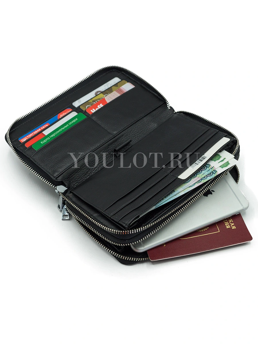 • Первое отделение включает 18 карманов для пластиковых карт, три отделения для купюр и отделение на молнии для мелочи.