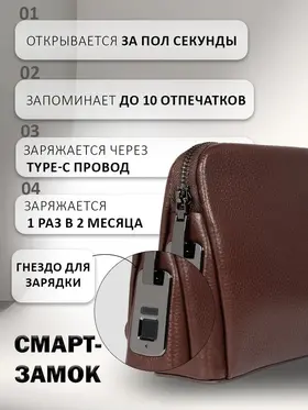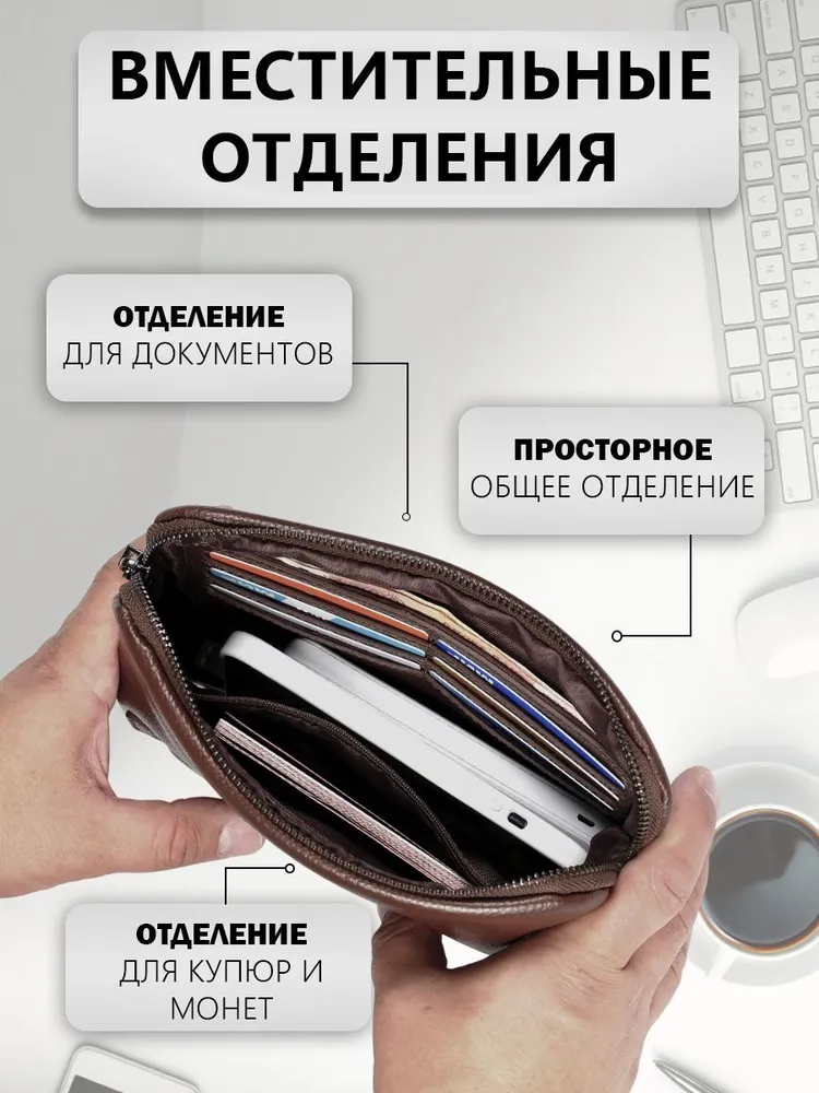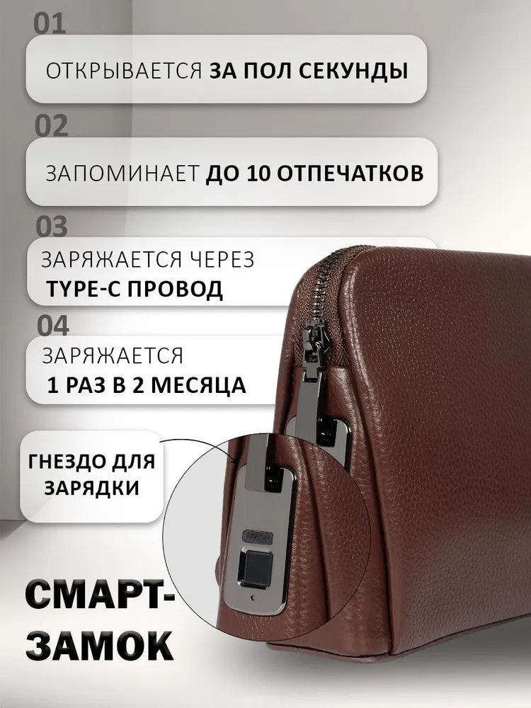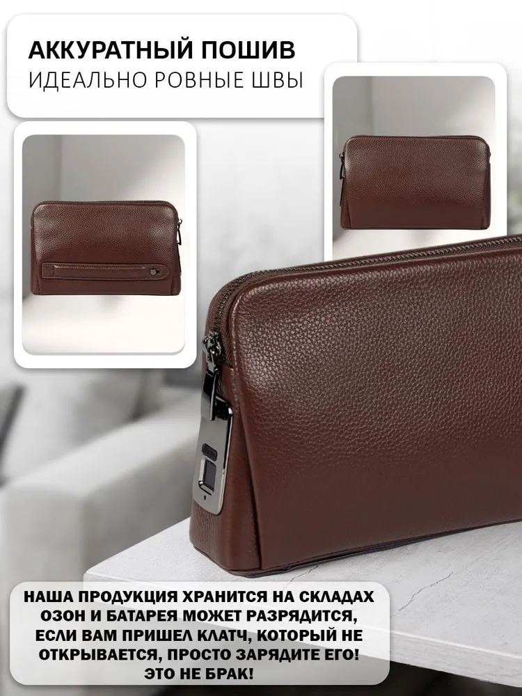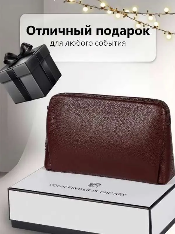 СТИЛЬНЫЙ Мужской коричневый клатч-сумка из натуральной кожи - это стильный и практичный аксессуар, который подойдет как для повседневного использования, так и для особых случаев. Клатч имеет элегантный дизайн и прочную конструкцию, что делает его надежным и удобным в эксплуатации.. КАЧЕСТВЕННЫЕ МАТЕРИАЛЫ Портмоне изготовленный из высококачественной натуральной кожи, выглядит роскошно и утонченно. Кожа имеет приятный на ощупь текстурный рисунок, придающий аксессуару особый шарм и привлекательность. Благодаря использованию только лучших материалов, клатч обладает превосходным качеством и долговечностью. ИННОВАЦИОННЫЕ ТЕХНОЛОГИИ Замок от отпечатка пальца - это инновационная технология, обеспечивающая безопасность и конфиденциальность ваших ценностей. Теперь вам не нужно беспокоиться о безопасности денег, кредитных карт или важных документов, хранимых в клатче. Просто прикоснитесь к замку пальцем, и он откроется только для вас. КОМФОРТ Прочный ремень на запястье обеспечивает комфортное и надежное ношение клатча. ИДЕАЛЬНЫЙ ПОДАРОК Подарочная упаковка делает этот клатч идеальным подарком для мужчины. Выполненная в элегантном стиле, упаковка придает портмоне особый шарм и праздничный вид. Подарите этот клатч-сумку своему другу, брату или коллеге, и он обязательно оценит ваш добрый жест и внимание к его стилю.