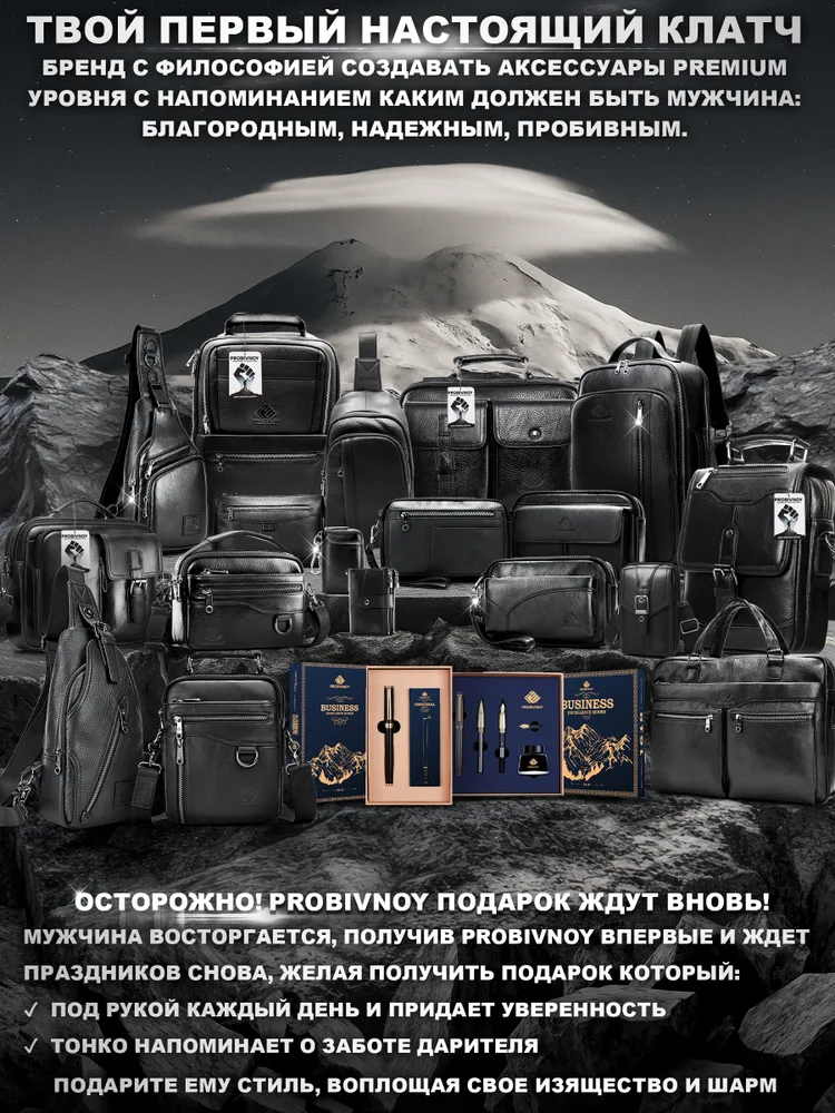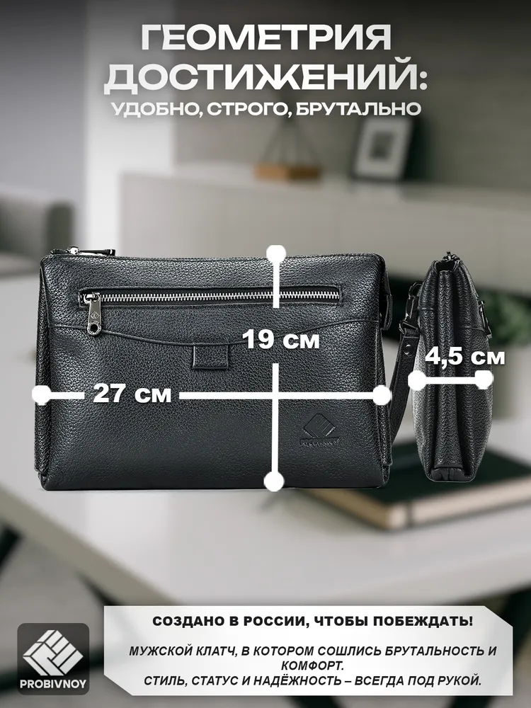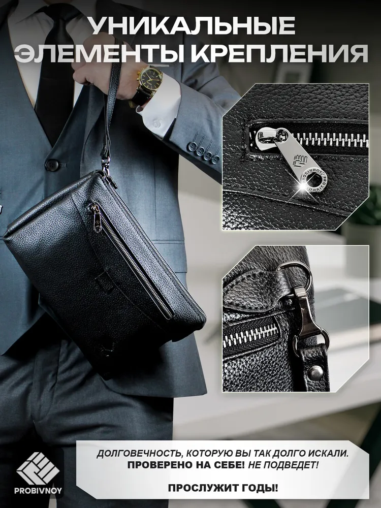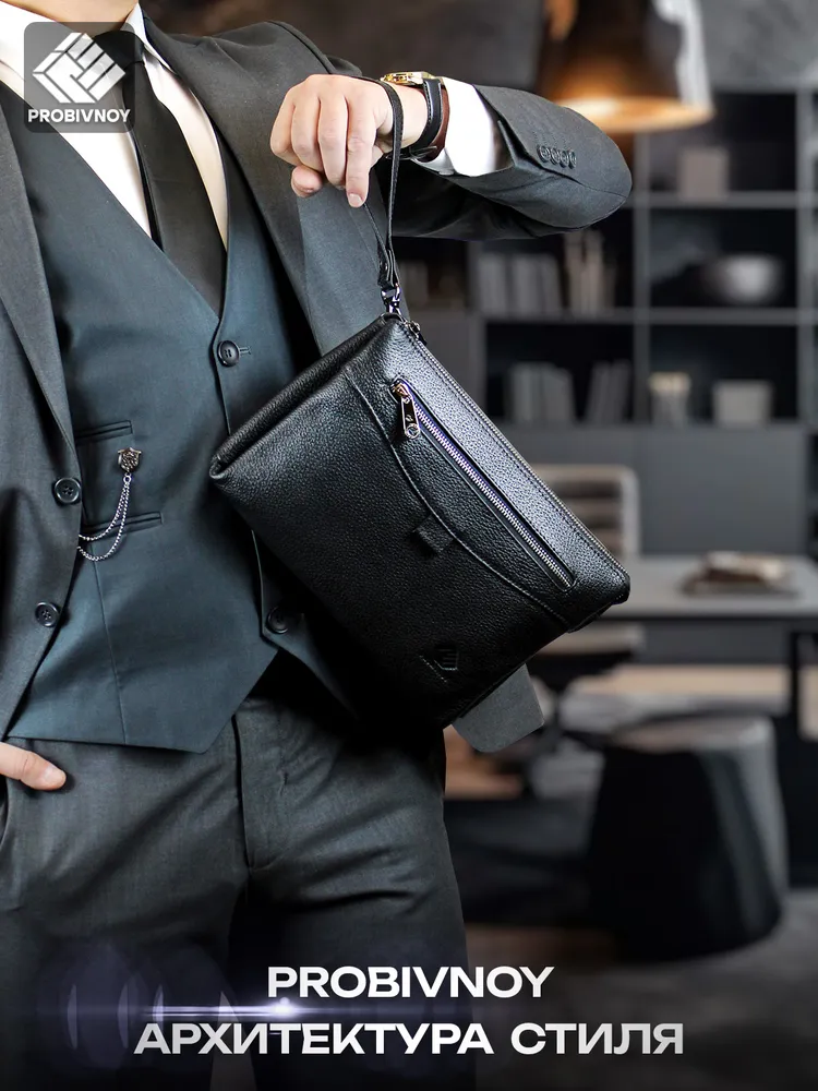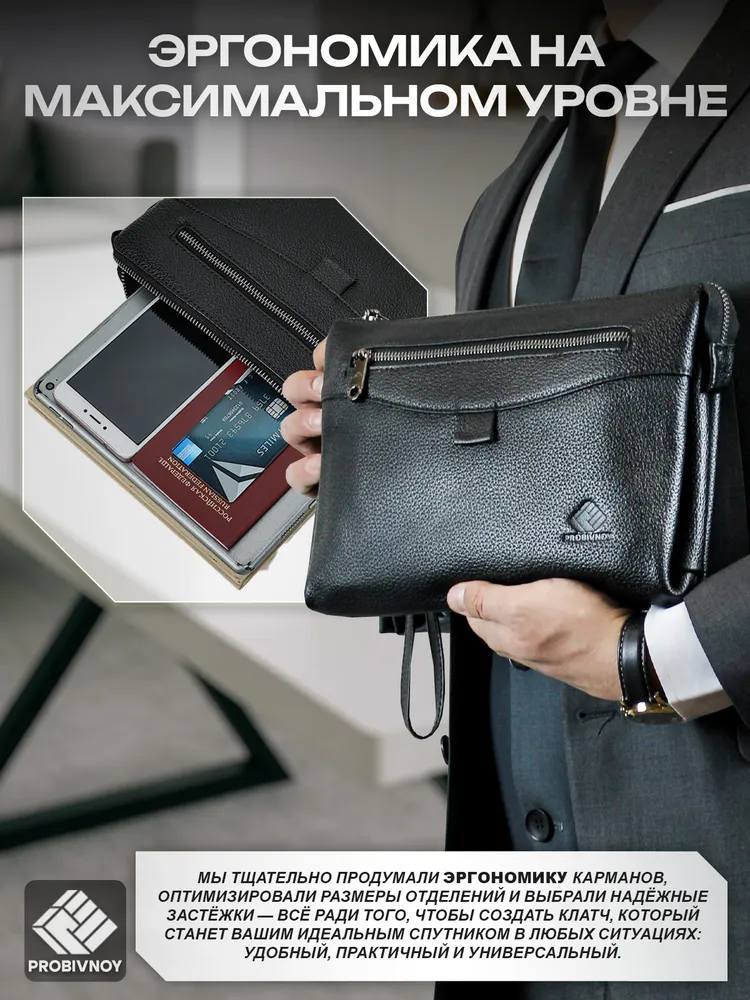 Стильный клатч мужской натуральная кожа черный от бренда PROBIVNOY – это идеальное сочетание функциональности и статусного внешнего вида. Наш клатч мужской из натуральной кожи изготовлен из отборных кожевенных материалов. Этот клатч мужской кожаный прекрасно подойдет как мужской клатч под документы для деловых встреч, так и в качестве клатча мужского для телефона и повседневных мелочей. Удобный мужской кожаный органайзер с продуманными отделениями позволит содержать все необходимое в идеальном порядке. Для ценителей классики предлагаем элегантные барсетки мужские кожаные из коллекции PROBIVNOY. Барсетка мужская натуральная кожаная выполнена в лучших традициях кожевенного мастерства – это не просто аксессуар, а мужская барсетка натуральная, которая подчеркнет ваш статус. В ассортименте представлена барсетка из натуральной кожи мужская различных размеров, включая компактную барсетку мужскую натуральную кожаную и вместительную мужскую кожаную сумку-планшет. Особое внимание заслуживает кожаная сумка-конверт с минималистичным дизайном. Каждый аксессуар бренда Пробивной – будь то мужской кожаный кошелек-клатч, стильное портмоне или ультратонкий slim-портфель из кожи – это воплощение безупречного качества и внимания к деталям. Российское производство гарантирует долговечность и премиальную фактуру каждого изделия. ПРОБИВНОЙ - это об идеальных подарках вашим близким. Этот элитный клатч мужской для документов станет отличным презентом для: мужчины — мужу, отцу, брату, сыну или коллеге ; девушки — для стильных и практичных женщин ; начальника — статусный аксессуар для руководителя клатч мужской для телефона. Эта сумка для документов мужская А5 натуральная кожа станет идеальным подарком на 23 Февраля, День рождения, Новый год, юбилей или выпускной - практичный презент для защитника Отечества, стильный аксессуар для успешного человека или роскошный подарок на особую дату. Выбирайте PROBIVNOY – выбирайте аксессуары, которые созданы чтобы подчеркнуть ваш стиль и статус!
