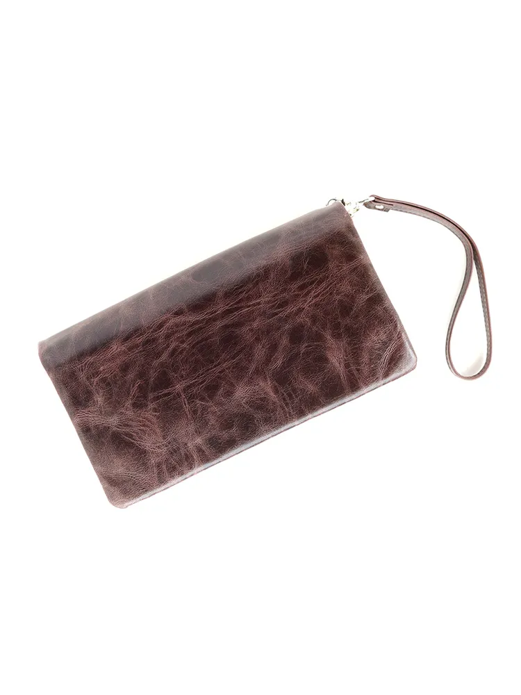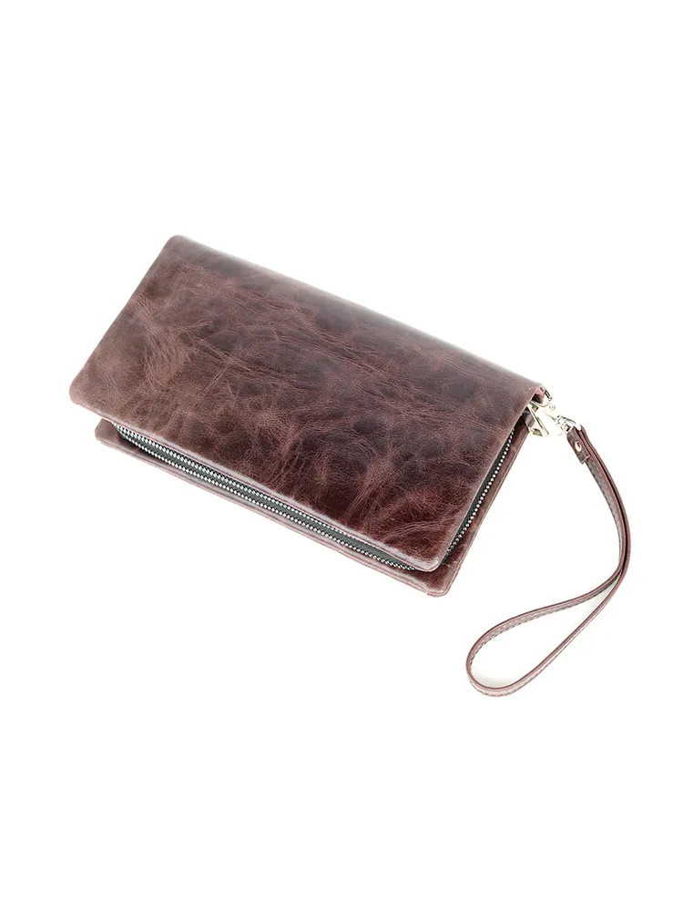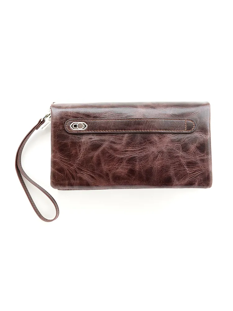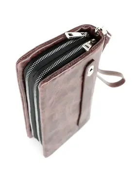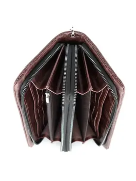 Мужской клатч на 2 металлические молнии с большим количеством отделений. В первом отделении 2 больших отделения под купюры, 2 маленьких отделения, и 12 отделов под пластиковые карточки. Второе отделение содержит 2 больших отделения с перегородкой закрывающееся на молнию под мелочь, 2 небольших отделения под купюры и 12 отделений под пластиковые карточки. Есть ручка для фиксации на руке, и ремешок для ношения клатча на запястье. Размер клатча 22,5х12,5х5