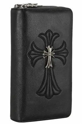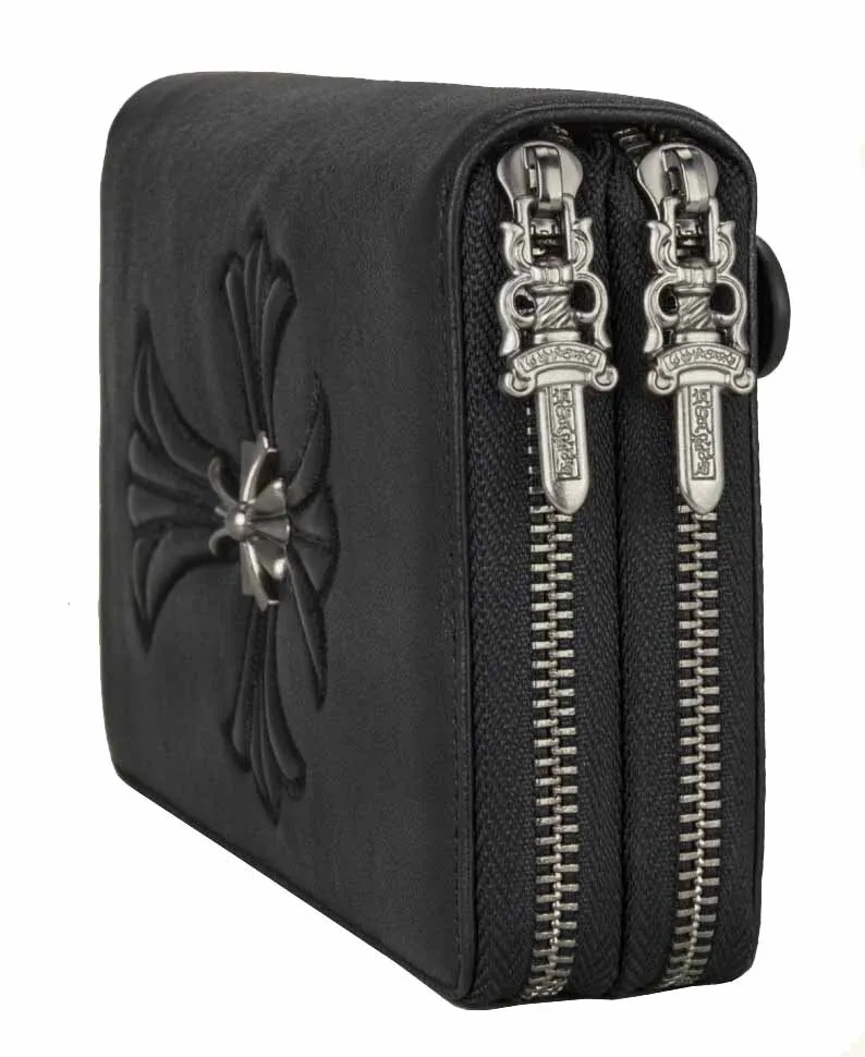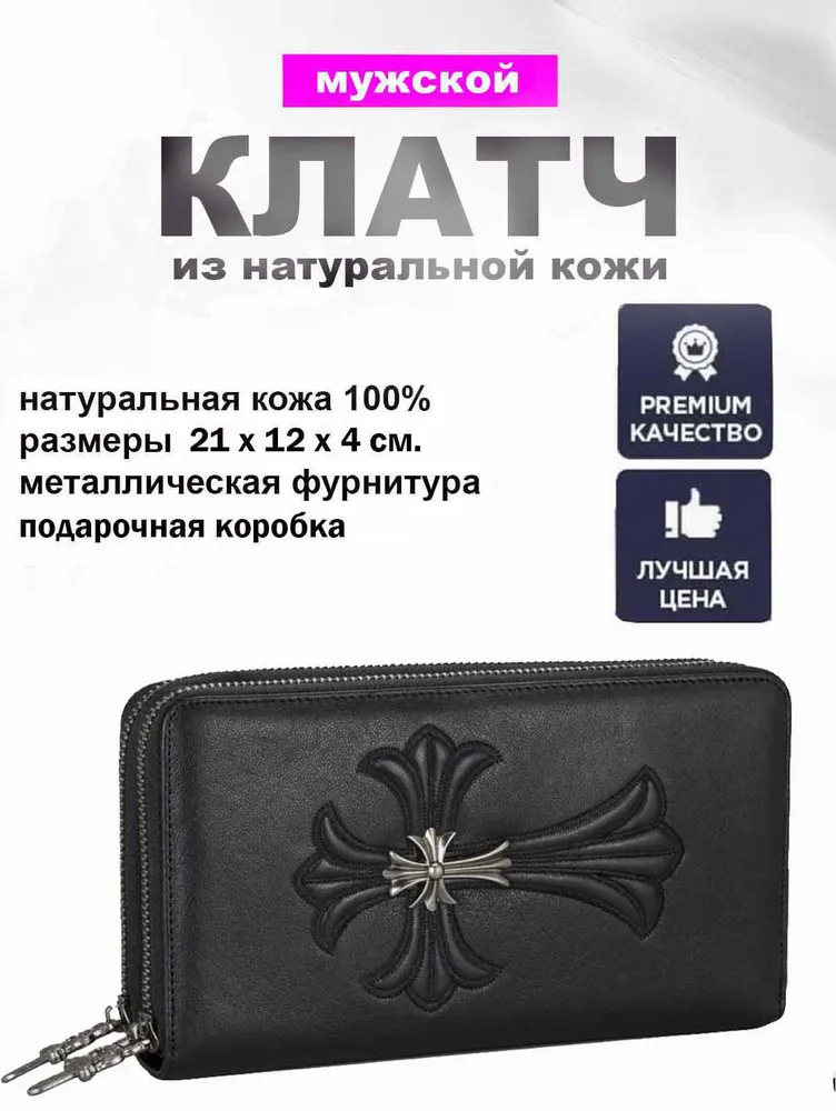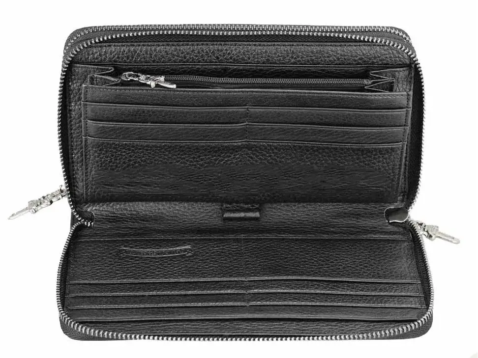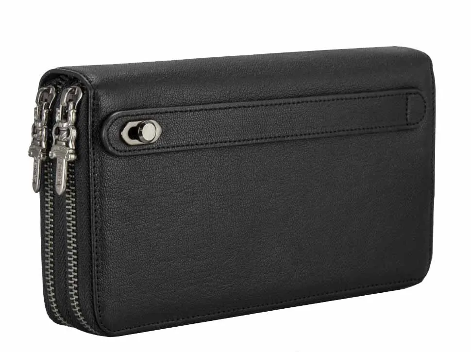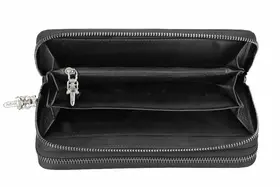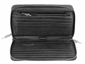Изделие изготовлено из 100% натуральной кожи чёрного цвета. Имеет два основных отделения на молнии. Одно вмещает в себя 2 отделения для купюр, 2 кармана свободного применения, карман на молнии для монет и 16 кармашков для пластиковых карт, второе - 3 отделения для купюр, 2 кармана свободного применения и карман для монет на молнии. Снаружи с обратной стороны расположена ручка. В комплект входит фирменная коробка для оптимального хранения изделия. Размеры: ширина - 22 см, высота - 13 см, толщина - 5 см. 2976