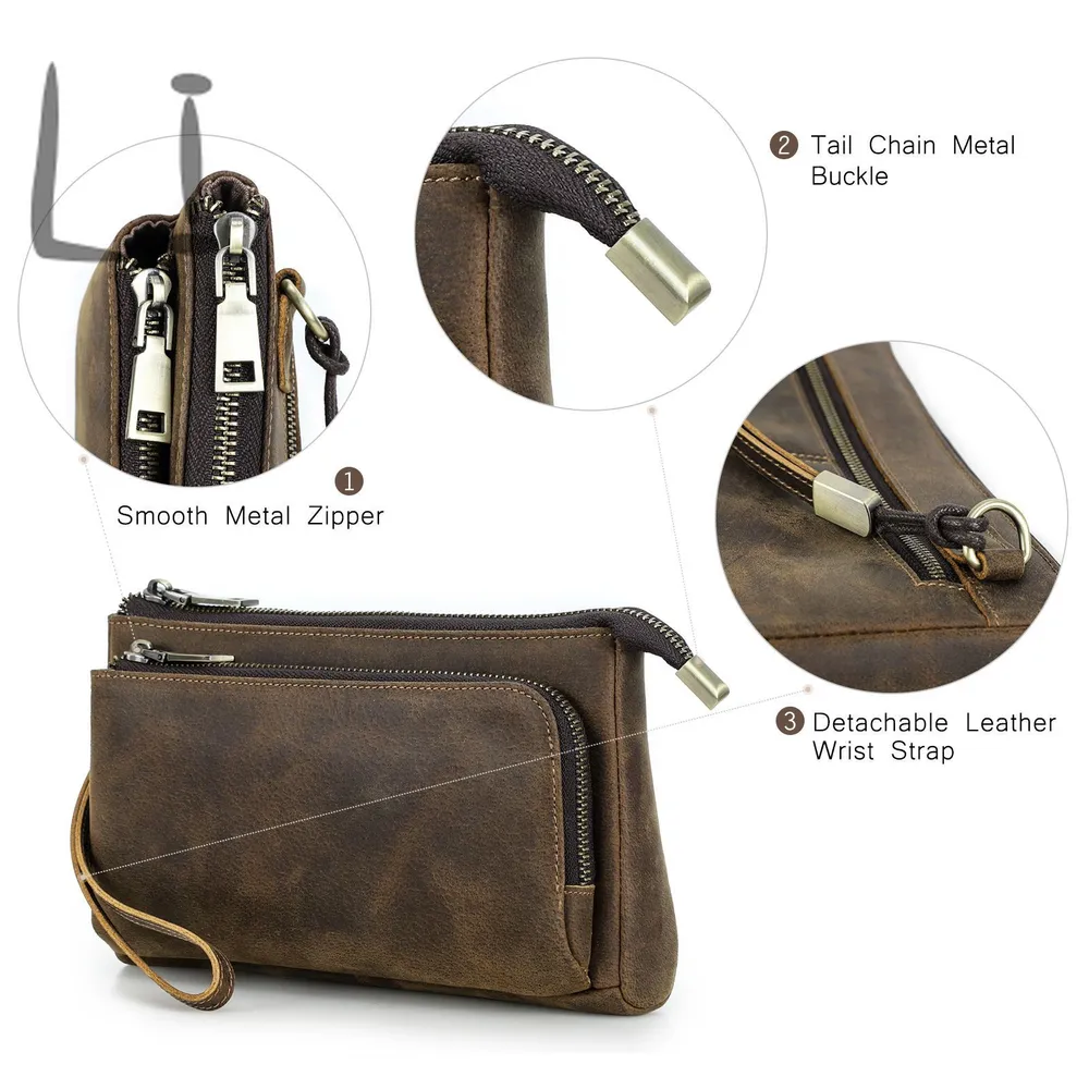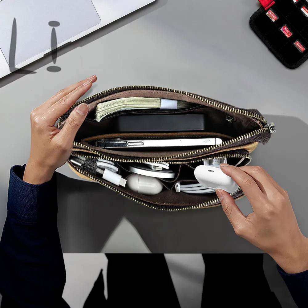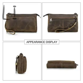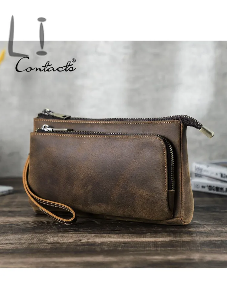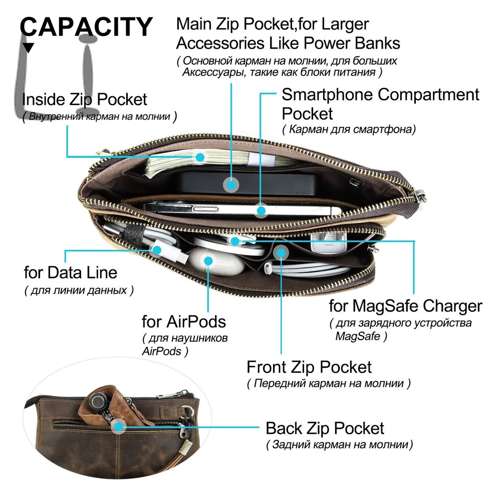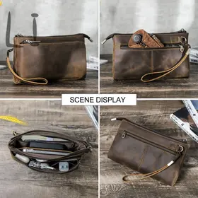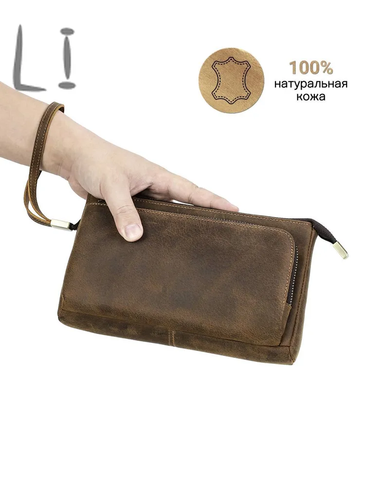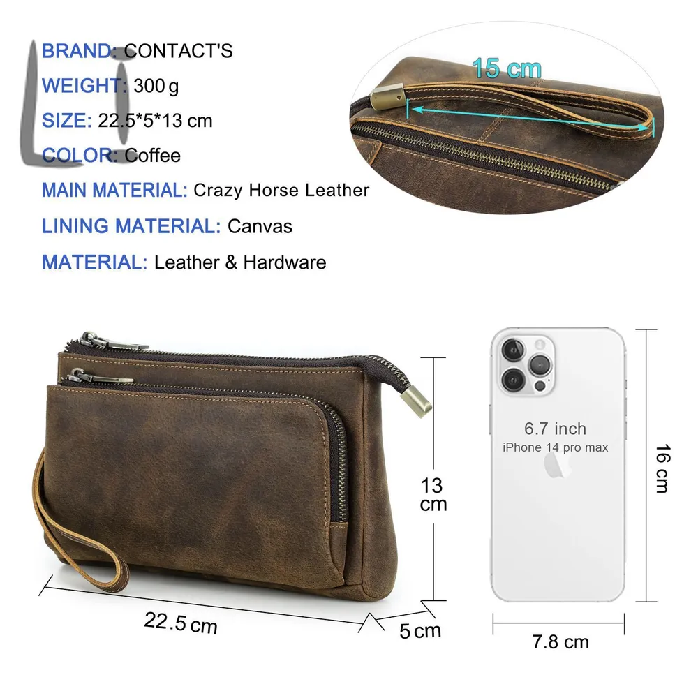 ### Продукт: Кожаный мужской клатч CONTACT'S для хранения электронных аксессуаров **Описание продукта:** Эта элегантная и функциональная сумка выполнена из высококачественной натуральной кожи и предназначена для хранения электронных аксессуаров. С размерами 22.5x13x5 см и весом 300 грамм, она удобна для переноски и оснащена удобным ремешком для запястья. Доступна в стильном кофейном цвете. **Основные характеристики:** 1. **Высококачественная кожа:** Мужская сумка изготовлена из натуральной кожи, что придает ей уникальный и роскошный внешний вид. Со временем кожа становится еще красивее и лучше, приобретая благородную патину. 2. **Вместимость:** Клатч предназначен для хранения различных электронных аксессуаров. В переднем кармане на молнии есть 5 открытых отделений, где можно разместить кабели, AirPods, зарядные устройства MagSafe и другие мелкие предметы. Основной карман вмещает мобильные телефоны и другие аксессуары, такие как зарядные устройства. 3. **Компактные размеры:** С размерами 22.5x13x5 см, сумка легко помещается в рюкзак, сумку или багаж. Она компактна и легка, что делает её идеальным выбором для повседневного использования. 4. **Портативность:** Коричневая кожаная сумка идеально подходит для ночевок, отдыха, деловых поездок, путешествий и повседневной жизни. Она организует ваши электронные аксессуары для путешествий, демонстрируя ваш идеальный стиль и джентльменский вкус.