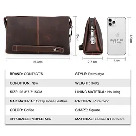 ### Продукт: Клатч из натуральной кожи с паролем CONTACT'S **Описание продукта:** Этот стильный кожаный клатч оснащен паролем для обеспечения дополнительной безопасности ваших вещей. С размерами 25.3x15x7.7 см и весом 340 грамм, он идеально подходит для повседневного использования и деловых встреч. Клатч представлен в двух элегантных цветах: кофейном и синем. **Основные характеристики:** 1. **Высококачественная натуральная кожа:** Клатч выполнен из прочной и эстетически привлекательной натуральной кожи, что обеспечивает его долговечность и стильный внешний вид. 2. **Парольный замок:** Клатч оснащен надежным замком с паролем, который обеспечивает безопасность ваших личных вещей и документов. 3. **Удобный размер и легкий вес:** С размерами 25.3x15x7.7 см и весом 340 грамм, клатч удобен для ношения и не создает лишней нагрузки. 4. **Два элегантных цвета:** Клатч доступен в классическом кофейном и стильном синем цветах, что позволяет выбрать вариант по своему вкусу. 5. **Боковой ремешок:** Клатч оснащен боковым ремешком для удобного ношения на запястье. 6. **Многофункциональный внутренний дизайн:** Внутри клатча предусмотрено 6 слотов для карт, что позволяет удобно разместить все необходимые карты и документы.