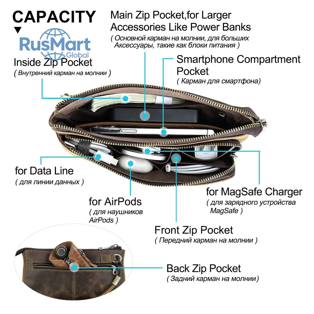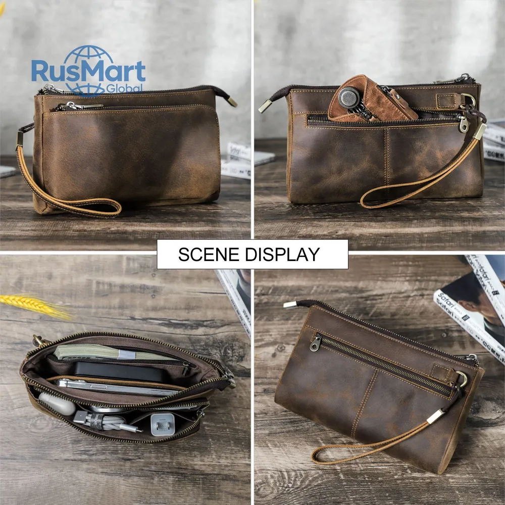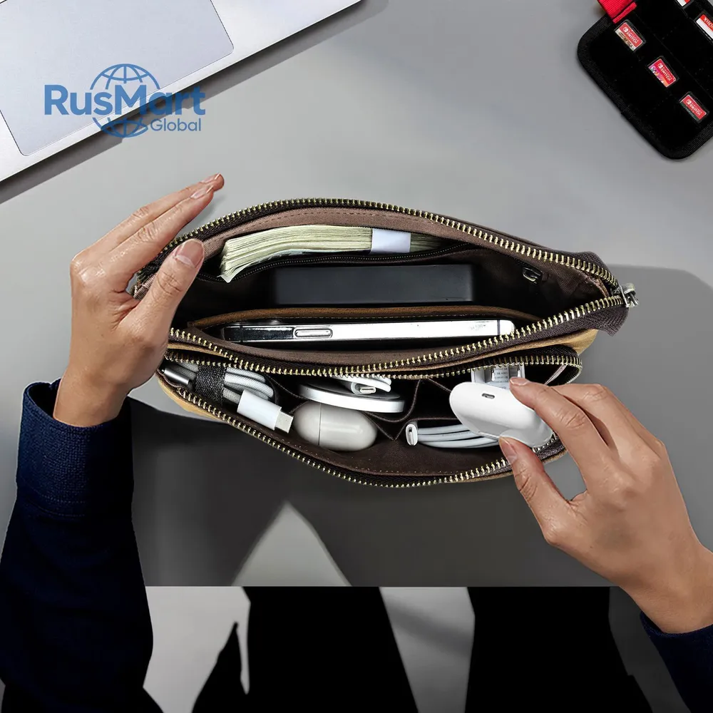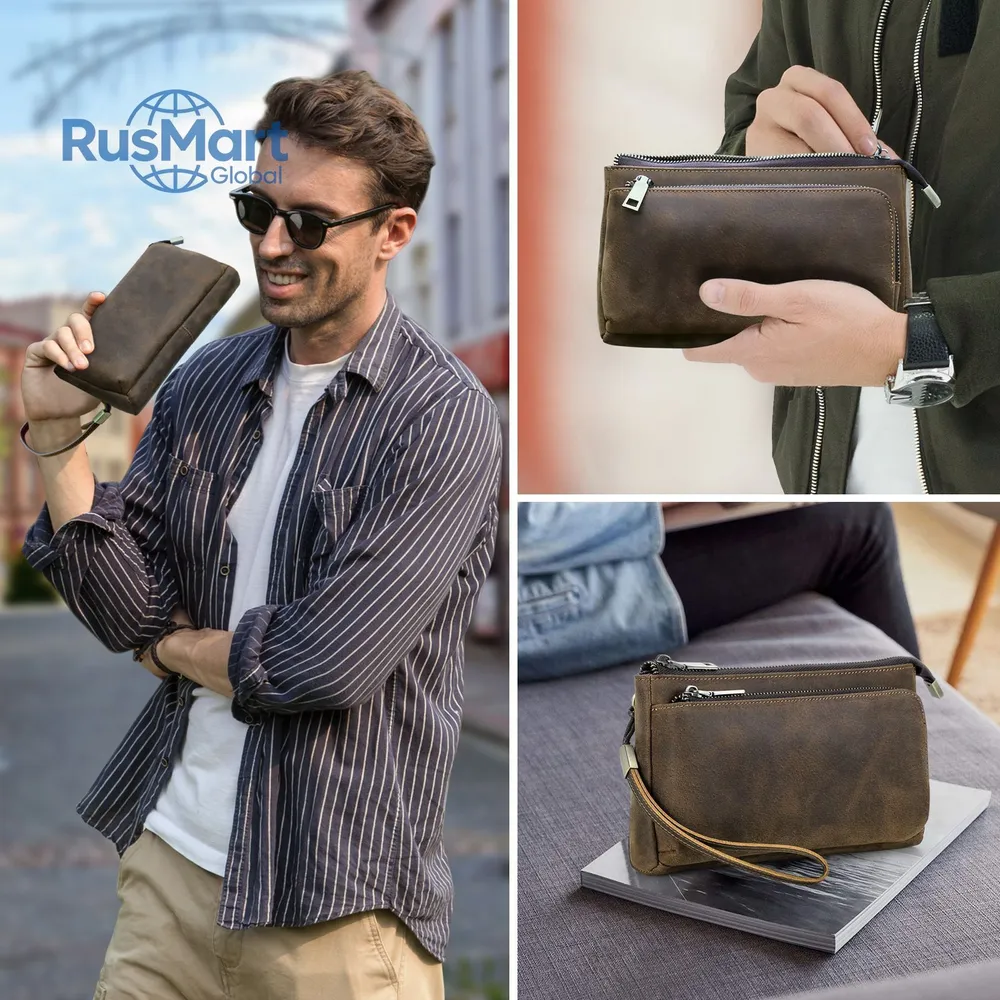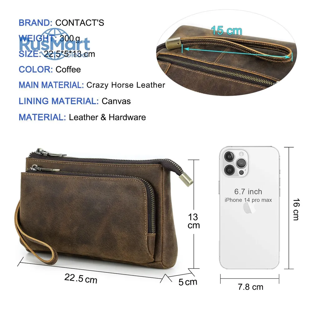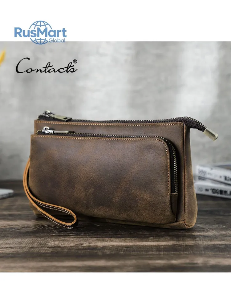 ### Продукт: Кожаный мужской клатч CONTACT'S для хранения электронных аксессуаров **Описание продукта:** Эта элегантная и функциональная сумка выполнена из высококачественной натуральной кожи и предназначена для хранения электронных аксессуаров. С размерами 22.5x13x5 см и весом 300 грамм, она удобна для переноски и оснащена удобным ремешком для запястья. Доступна в стильном кофейном цвете. **Основные характеристики:** 1. **Высококачественная кожа:** Мужская сумка изготовлена из натуральной кожи, что придает ей уникальный и роскошный внешний вид. Со временем кожа становится еще красивее и лучше, приобретая благородную патину. 2. **Вместимость:** Клатч предназначен для хранения различных электронных аксессуаров. В переднем кармане на молнии есть 5 открытых отделений, где можно разместить кабели, AirPods, зарядные устройства MagSafe и другие мелкие предметы. Основной карман вмещает мобильные телефоны и другие аксессуары, такие как зарядные устройства. 3. **Компактные размеры:** С размерами 22.5x13x5 см, сумка легко помещается в рюкзак, сумку или багаж. Она компактна и легка, что делает её идеальным выбором для повседневного использования. 4. **Портативность:** Коричневая кожаная сумка идеально подходит для ночевок, отдыха, деловых поездок, путешествий и повседневной жизни. Она организует ваши электронные аксессуары для путешествий, демонстрируя ваш идеальный стиль и джентльменский вкус.