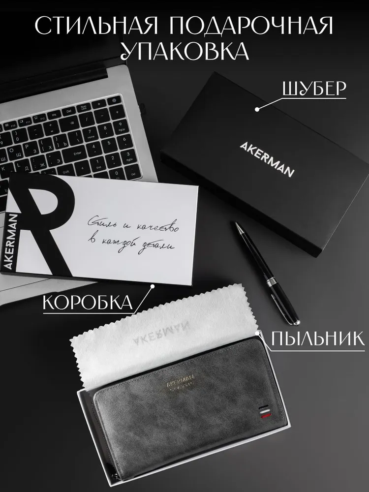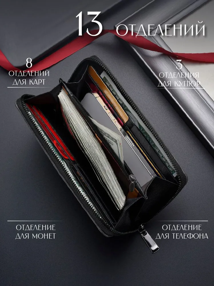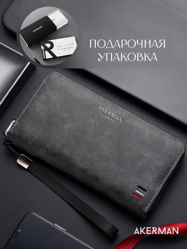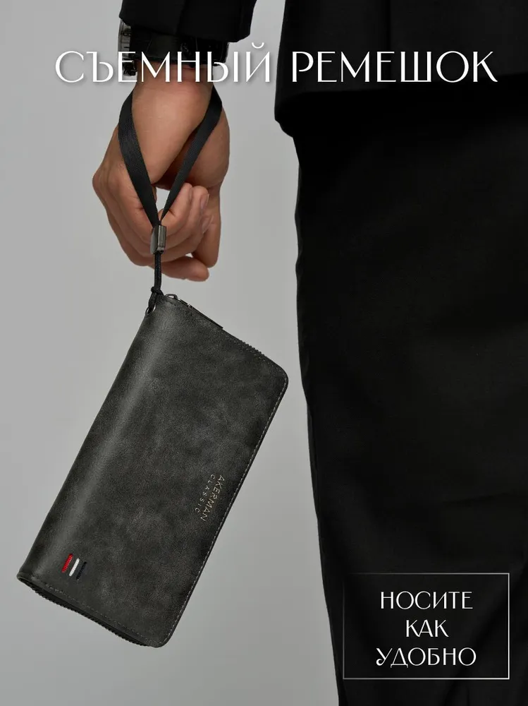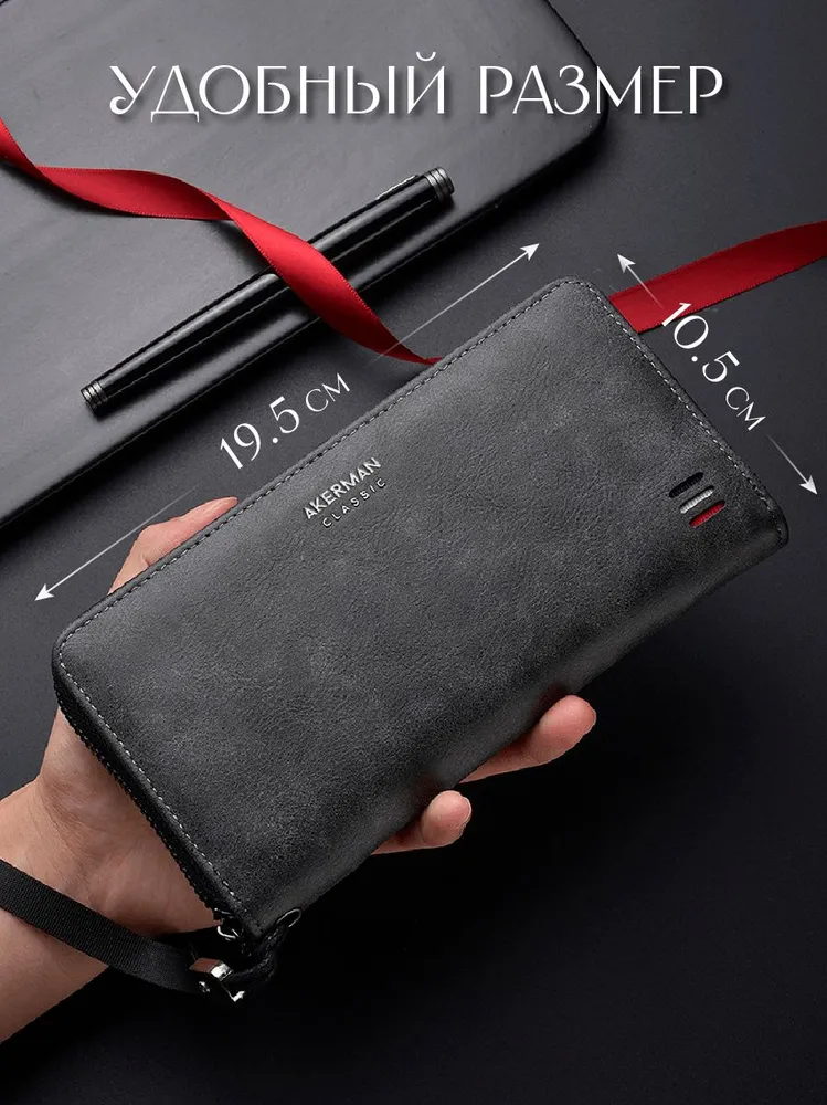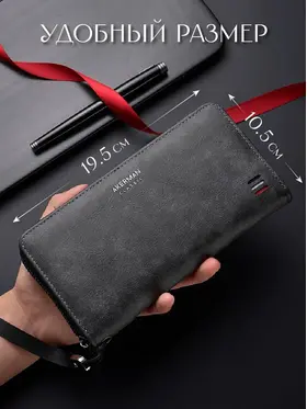 Стильный мужской кошелек портмоне из искусственной кожи Этот кошелек изготовлен из высококачественной искусственной кожи, которая выглядит роскошно и прослужит долгие годы. Материал легко чистится и не теряет своего внешнего вида со временем. Удобство и функциональность В портмоне 14 отделений, в которых у вас будет место для всех ваших карточек, денег и мелочи. Благодаря удобному размеру в нём можно хранить телефон, паспорт и водительские документы. Стильный дизайн Этот кошелек не только функционален, но и стильно выглядит. Он дополнен элегантным ремешком на запястье, который придает образу завершенность. Будьте уверены, что с таким аксессуаром вы будете выглядеть стильно в любой ситуации. Подарочная упаковка Стильная упаковка из крафтового картона позволяет не только безопасно доставить товар, но и презентовать его в качестве подарка.