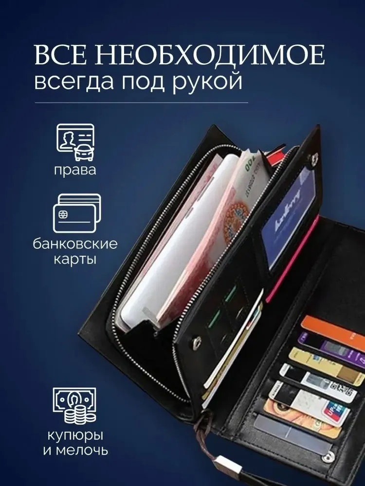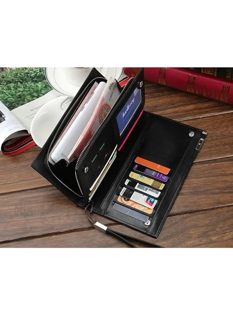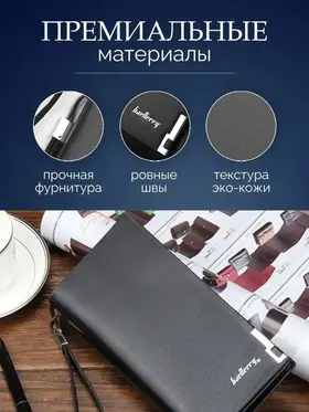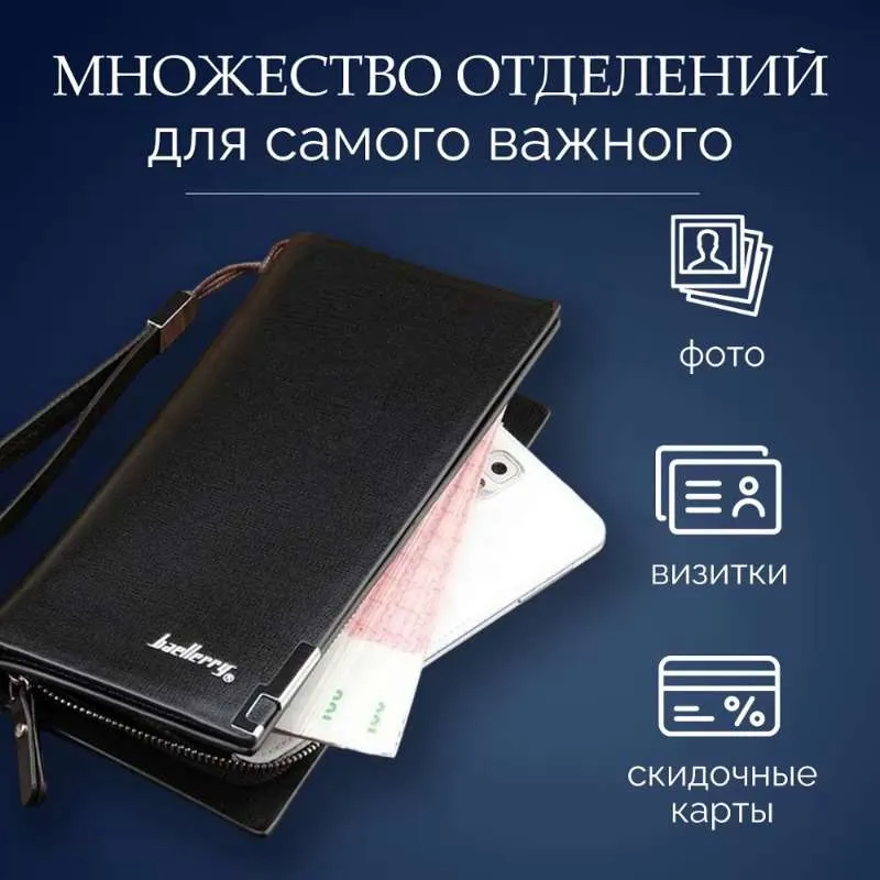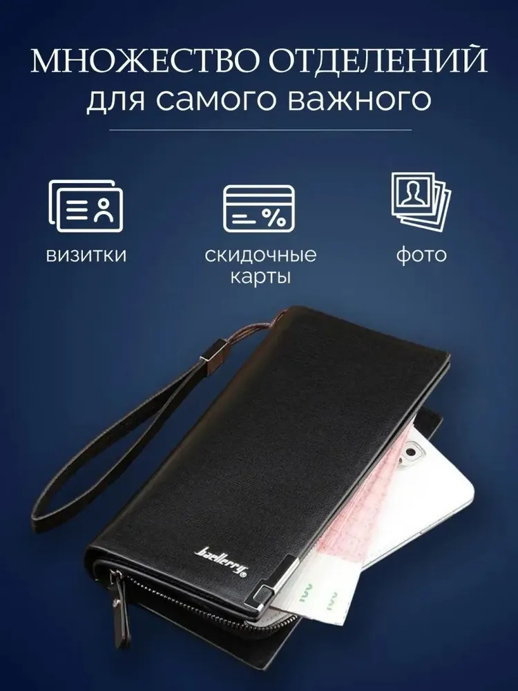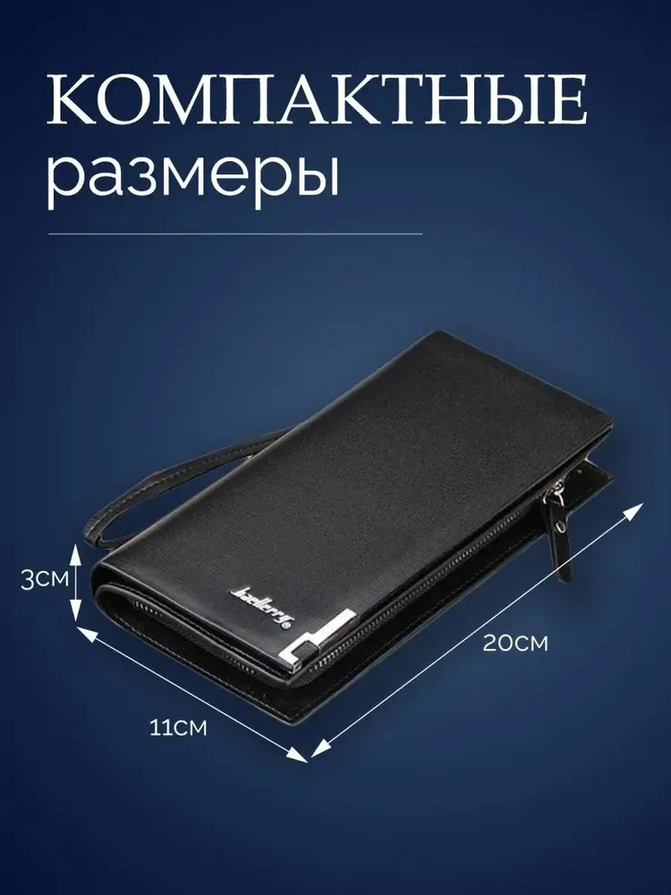Портмоне Baellerry Кошелек - это аксессуар для купюр, которые входят в развернутом виде. Портмоне - это более статусный аксессуар, имеет больше отделов для пластиковых карт, для визиток. Бумажник по функциональности не отличается от портмоне. Может иметь отделение для монет. Данная модель кошелька идеальный вариант для подарка мужчине. Премиальное качество Кошелек от бренда Baellerry предлагает кожаное стильное мужское портмоне для настоящих мужчин. Кошелек мужской изготовлен из высококачественного и износостойкого материала - экокожи. Мужской клатч для документов имеет несколько отделов, один из них на молнии, что предотвратит выпадение наличных денежных купюр или мелочи. Есть два потайных кармана для паспорта, для водительских прав и для автодокументов. Портмоне мужское имеет 12 отделений под банковские, кредитные карты и визитки. Также мужской бумажник имеет отделы для симкарт. Для удобного ношения есть ремешок-петля, что позволит не забыть или потерять мужское портмоне. Дополнит деловой, классический, спортивный стиль.