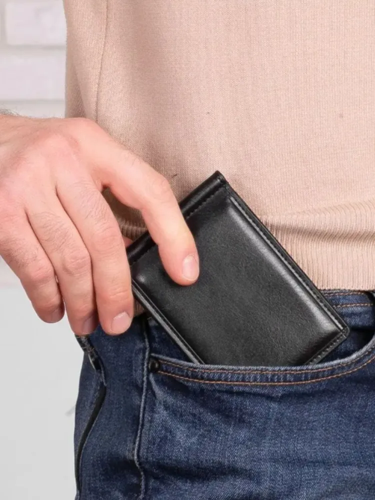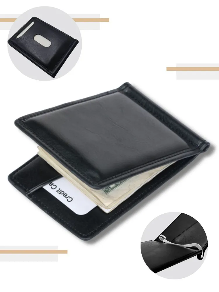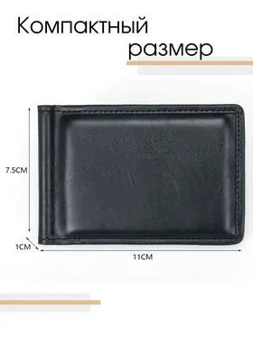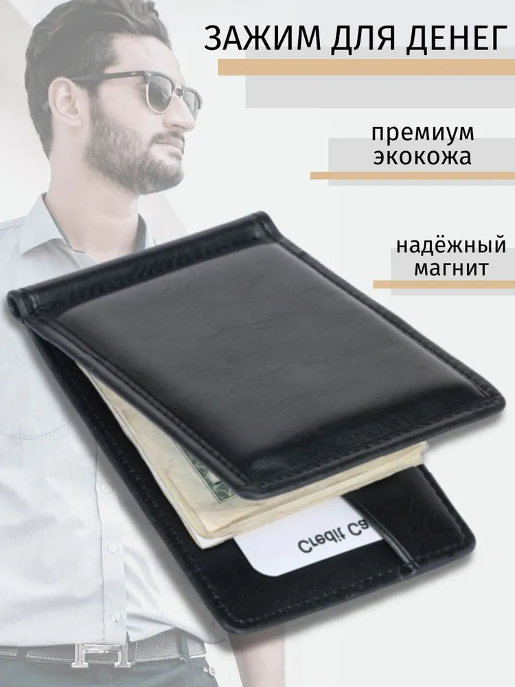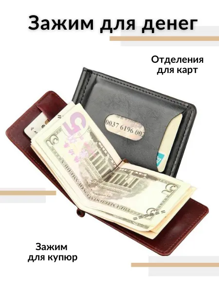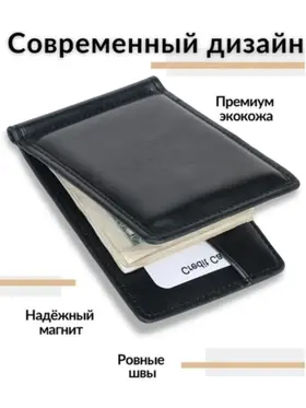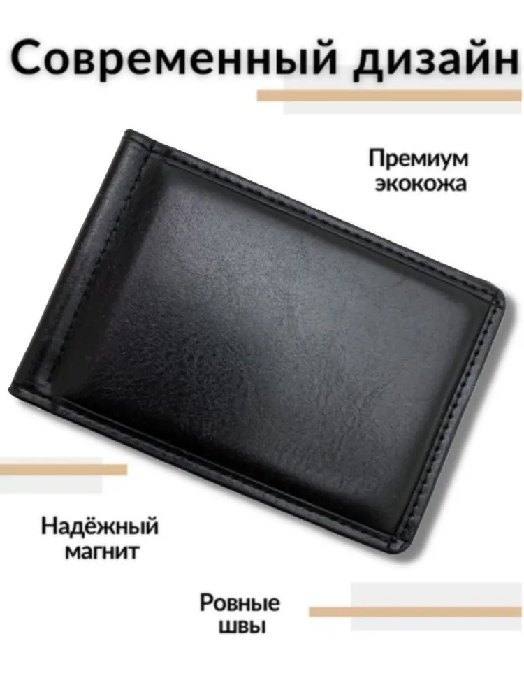 Зажим для денег очень удобный и приятный на ощупь, а его компактный размер позволяет без затруднений носить его с собой в любом кармане. Компактный и элегантный мини кошелёк, выполненный из качественной экокожи. Маленький мужской кошелек имеет несколько отделений для визиток и пластиковых карт, одно отделение для купюр на металлическом зажиме и одно классическое. Стильный кошелек из кожи не будет открываться при большом наполнении, потому что имеет надежный магнитный фиксатор. Такой кожаный мини портмоне отлично подойдёт для тех, кто предпочитает строгий стиль и минимализм. Отличный подарок на любой праздник.