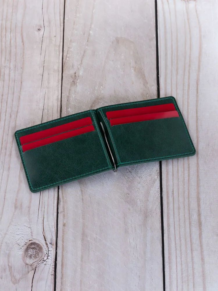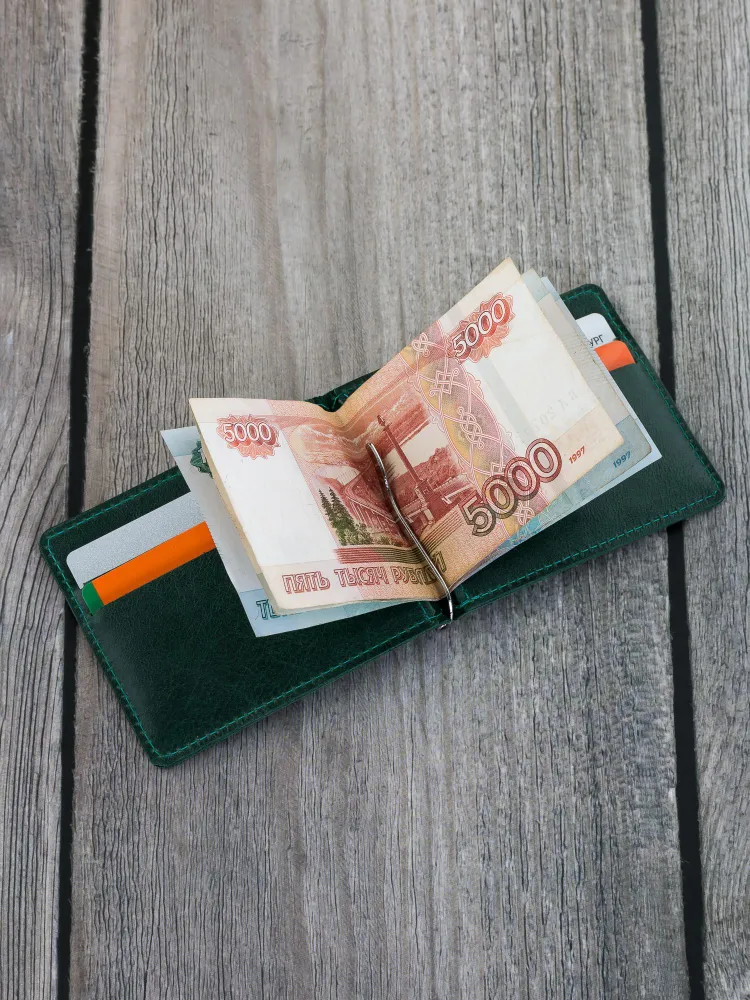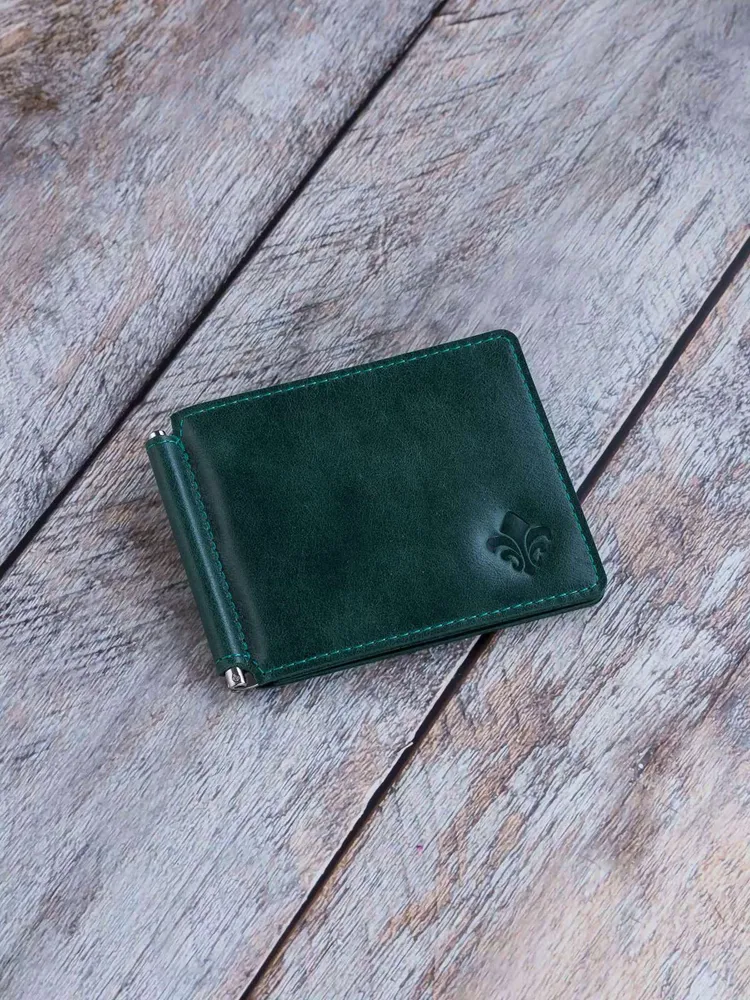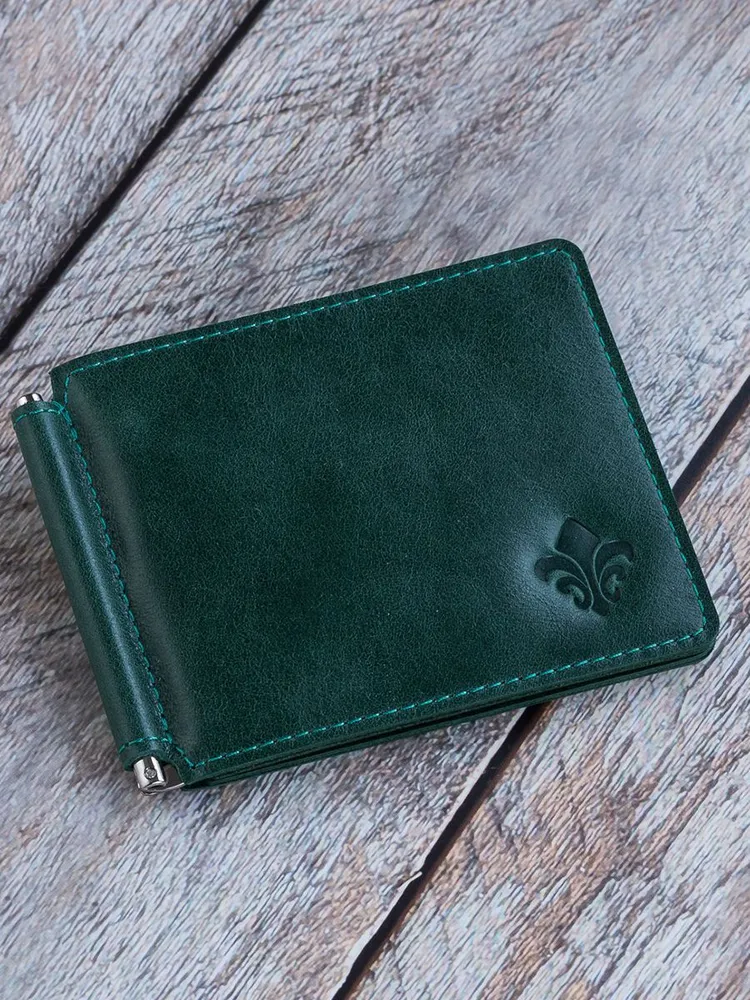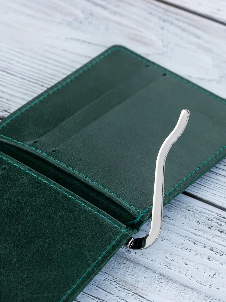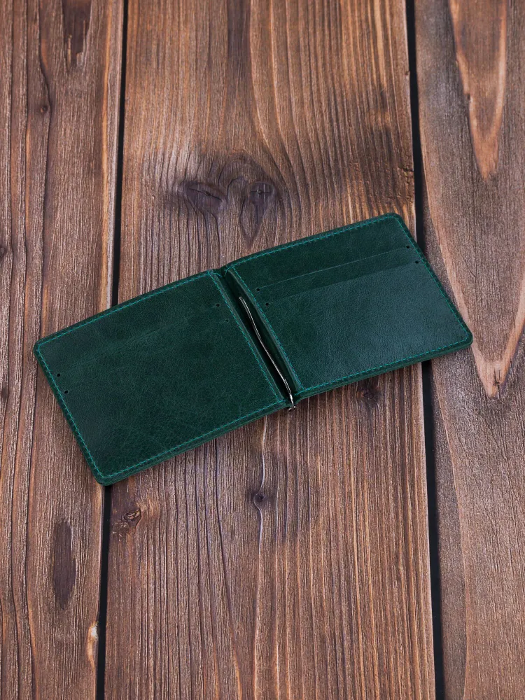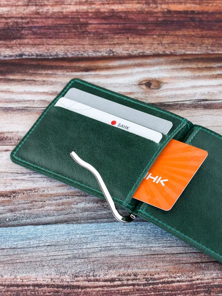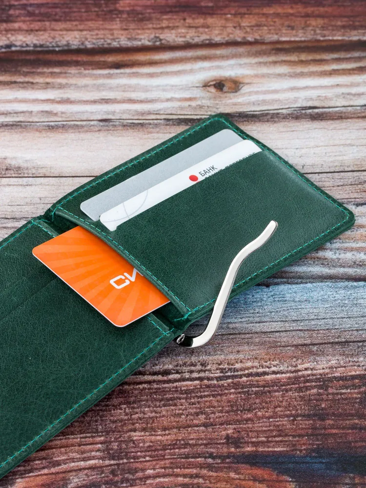 Зажим для купюр из натуральной кожи зеленого цвета Зажим для денег выполнен из мягкой натуральной кожи с эффектом "дымка" и украшен тиснением с логотипом бренда. Внутри установлен металлический зажим для купюр который откидывается в 2 положения (до середины и полностью раскрывается). Внутри прижима для купюр 4 кожаных кармана для кредитных или скидочных карт и 2 скрытых кармана в которые помещается по 1-3 пластиковой карте. Упакован зажим для банкнот в закрывающуюся коробку из плотного картона с логотипом. Для дополнительной сохранности внешнего вида коробка убирается в полиэтиленовый, прозрачный пакет с клеевым слоем. Размер 11х8,5см. Производство: Россия, Санкт-Петербург.