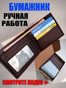 Элегантный кожаный бумажник Перед отправкой надёжно упаковывается в пупырчатую плёнку и отправляется до покупателя целым и невредимым ! Универсальный стильный органайзер для документов и денег Элегантный кожаный кошелек-бумажник сочетает практичность и минималистичный дизайн, подходящий как мужчинам, так и женщинам. Прочный материал обеспечивает долговечность, сохраняя форму даже после длительного использования. Внутри предусмотрено достаточное количество отделений для комфортного размещения карт, денежных купюр и важных бумаг. Компактные размеры позволяют легко поместить аксессуар в сумку или брючину. Отличный выбор для тех, кто ценит порядок и стиль в повседневном образе Бумажник из качественной экокожи . Изготавливается полностью вручную . Благодаря качественной искусственной коже и ручному прошиванию , кошелёк в разы превосходит аналоги по прочности и долговечности . Максимально удобное и практичное изделие , в него помещается все самое необходимое современному человеку . Предусмотрены 4 отделения для карт и 2 для купюр . Лаконичный дизайн бумажника подчеркнет ваш стиль и индивидуальность , а компактный размер не создаст дискомфорта при ношении . Подарочная картонная упаковка с древесным стружкой наполнителем делает бумажник - кошелёк идеальным подарком для себя или для тех , кого вы цените . Характеристики : Изготовление - 100% ручная работа . Габариты - Высота 9 см , ширина 11,5 см . Порадуйте качеством себя или своих близких