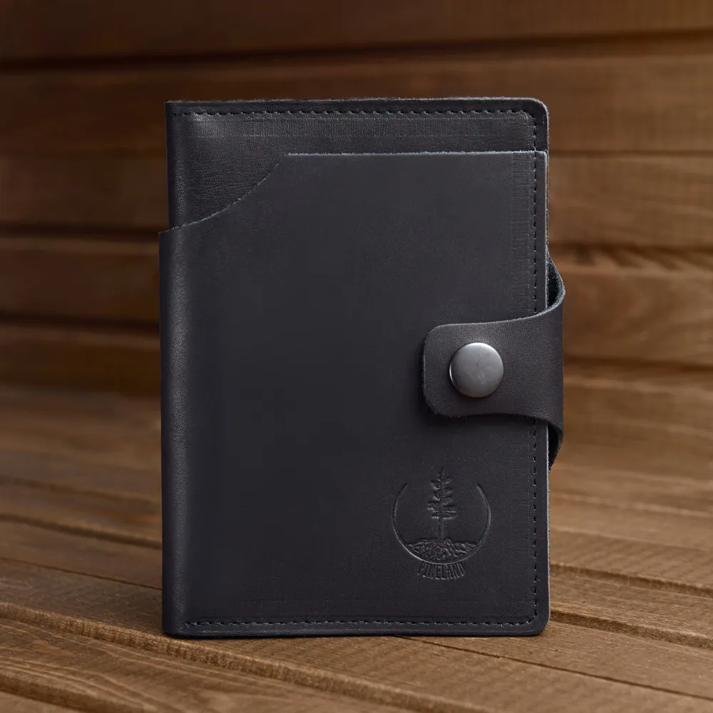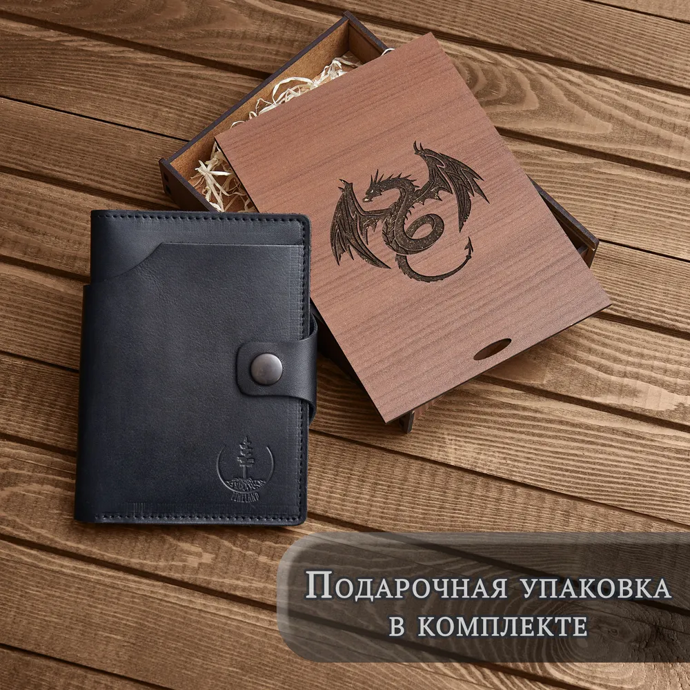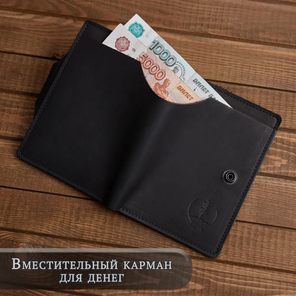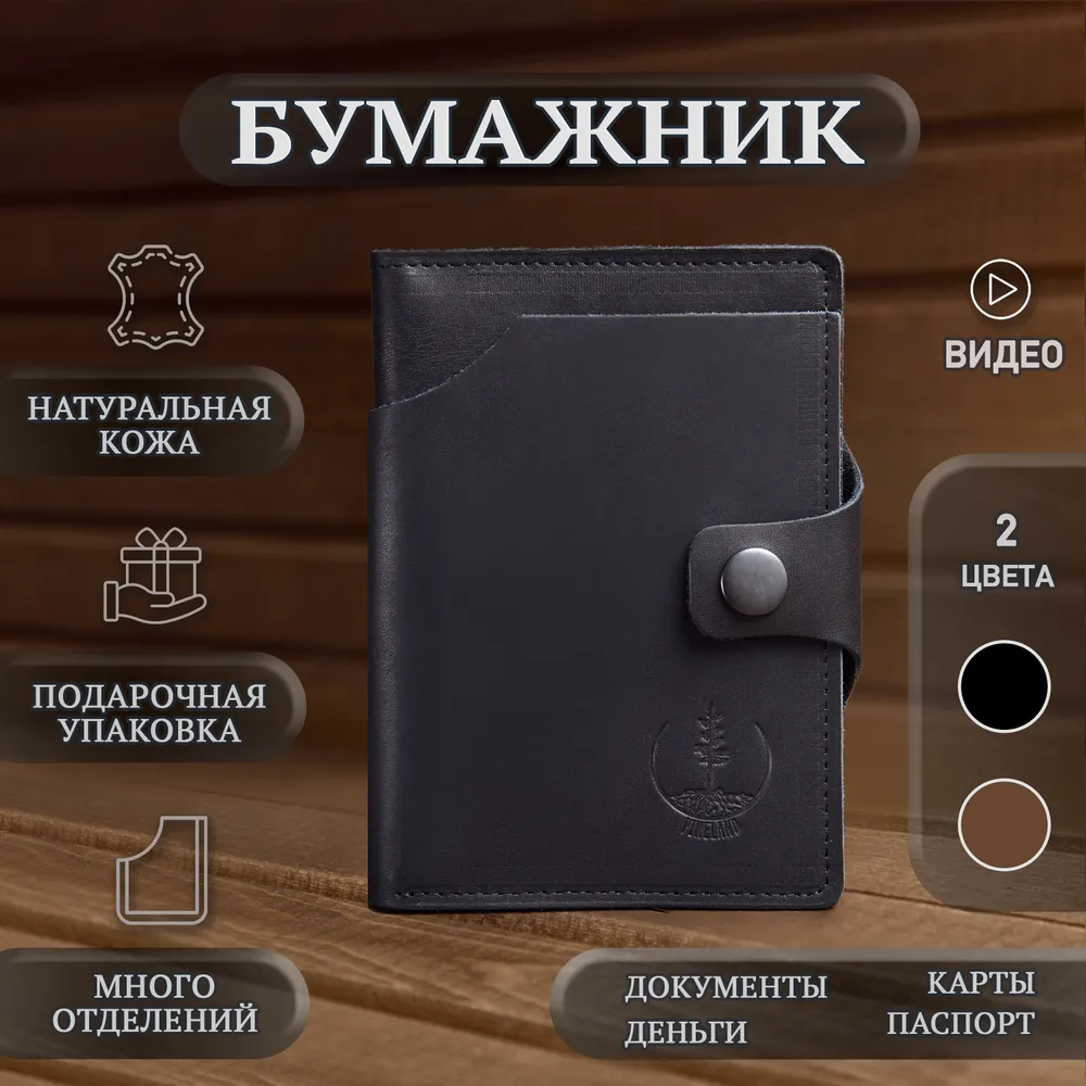 Черный кошелек 3 в 1! - Бумажник для автодокументов - Портмоне для купюр - Держатель для карт Только купюры, карты и документы - все самое важное ВСЕГДА С СОБОЙ 100% ручная работа! Модели мы придумываем сами. Крафтовые изделия – всегда уникальны и неповторимы. Это то, что даст вам ощущение вашего лучшего выбора. Прочные швы и надежные металлические кнопки. Бережное тиснение с логотипом. Подарочная упаковка для вас Когда каждая деталь имеет значение. Подарочная деревянная коробка в комплекте. Мы бережем ваше время. Бумажник в подарочной коробке настолько продуман, что вам остается только подарить Только натуральная кожа - на меньшее не соглашайтесь! Натуральная кожа KPC Crust - это всегда особенные ощущения в руках. Никакой ткани! Только натуральная кожа внутри. Каждый кошелек ВРУЧНУЮ заботливо обработан натуральным защитным покрытием. Воск придает вашему портмоне богатый внешний вид. Вместительный, но компактный!Емкий карман для денег Заряжен на успех! Чаще держите в руках достойный бумажник. Ваш вместительный кошелек для денег - для тех, кто любит брать все самое важное с собой. Портмоне из натуральной кожи размером всего 10х14. И пусть в нем всегда будет по-настоящему много денег! Бумажник "Земля сосен" сделан в России! Мы - небольшая кожевенная мастерская. И тем важнее и ценнее ваше доверие. Мы, как производители, всегда на связи. Гарантия на каждое изделие 6 месяцев. Бережно и с любовью делаем кошельки для вас. Верим, что труд мастерской принесет вам радость