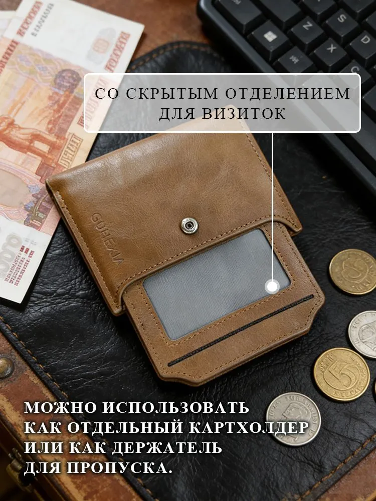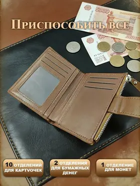 Стильный мужской кошелёк Удобное расположение отделений позволяет хранить бумажные купюры, монеты, карты, визитки, водительские права -всё в одном месте. Удобный дизайн Удобный съёмный слот можно использовать для хранения карт или визиток Стильный и функциональный Мужской кожаный кошелёк сочетает в себе функциональность и модный дизайн,. Наш кошелёк прослужит Вам не один год и всегда будет выглядеть как новый!