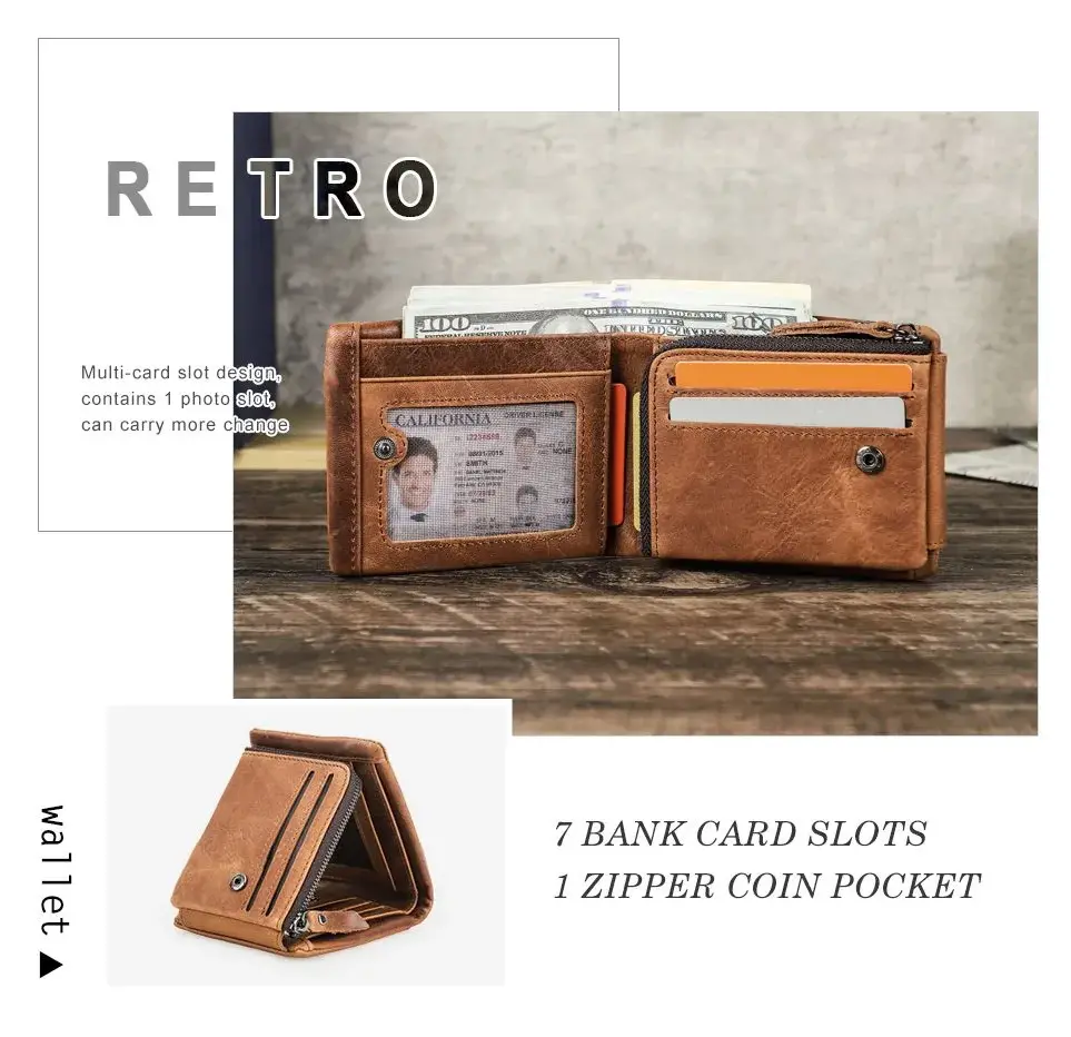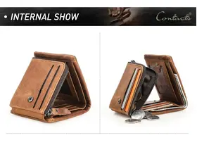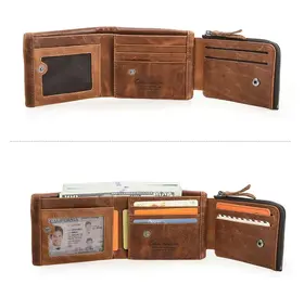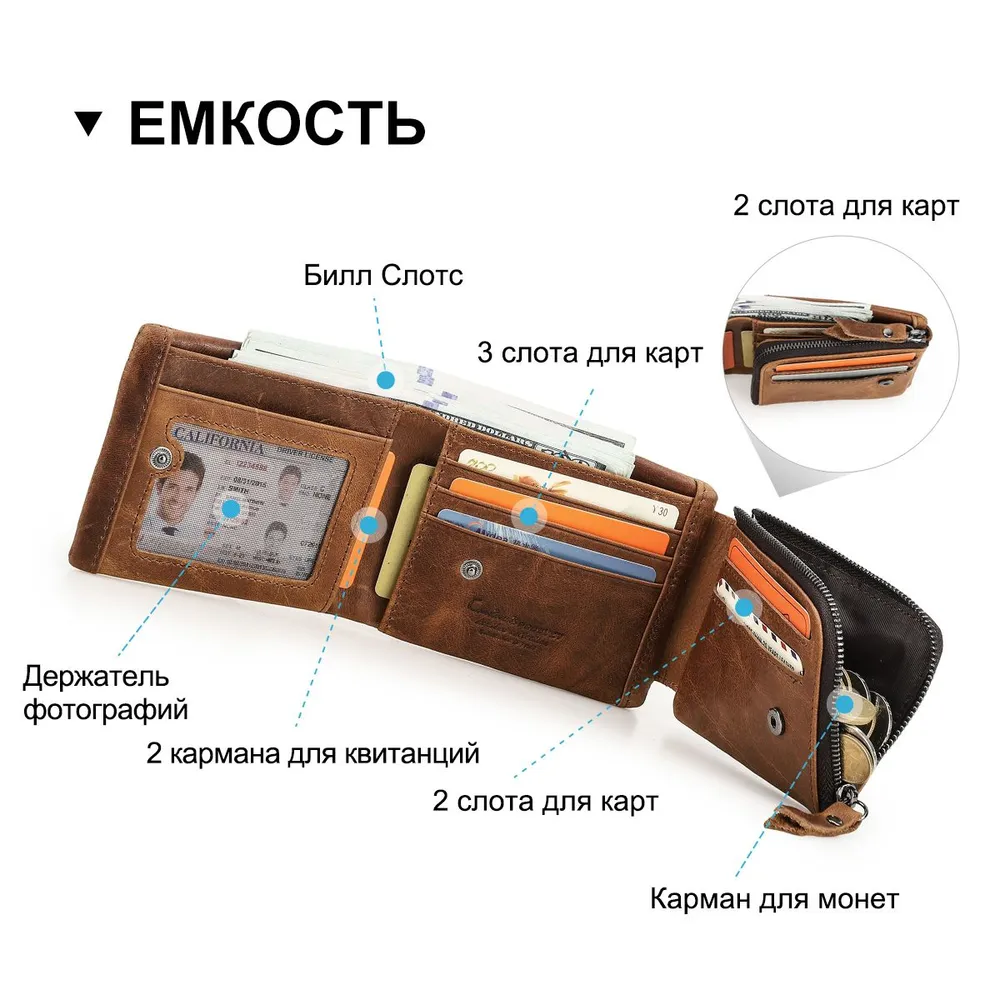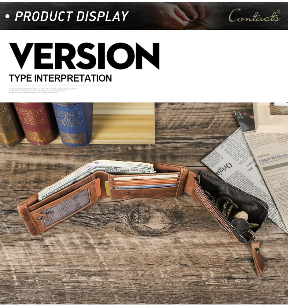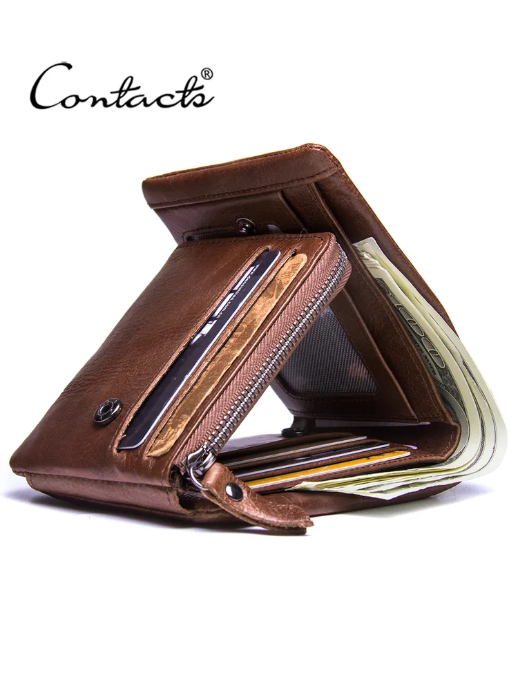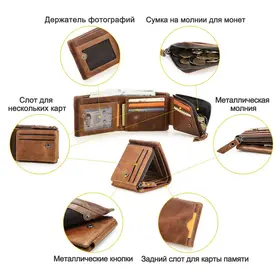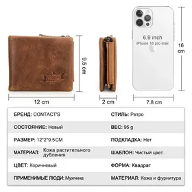 **CONTACT'S Мужской Короткий Кошелек из Натуральной Кожи** Этот мужской кошелек выполнен из натуральной кожи, отличается тройным сложением и классическим дизайном. Идеально подходит для тех, кто ценит стиль и удобство, предлагая всё необходимое для хранения карт, наличных и монет. - Тройное сложение для компактности и удобства. - Доступен в двух цветах: коричневый и черный. - Размеры: 12x2x9.5 см, вес — 90 г. - Отделения для банковских карт, зажим для наличных и отделение для монет на молнии. - Окошко для фото, чтобы всегда иметь при себе снимки близких. **Идеальный выбор для тех, кто ищет стильный и практичный аксессуар для повседневного использования.**
