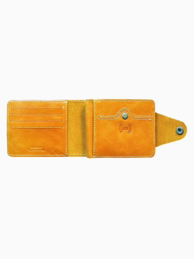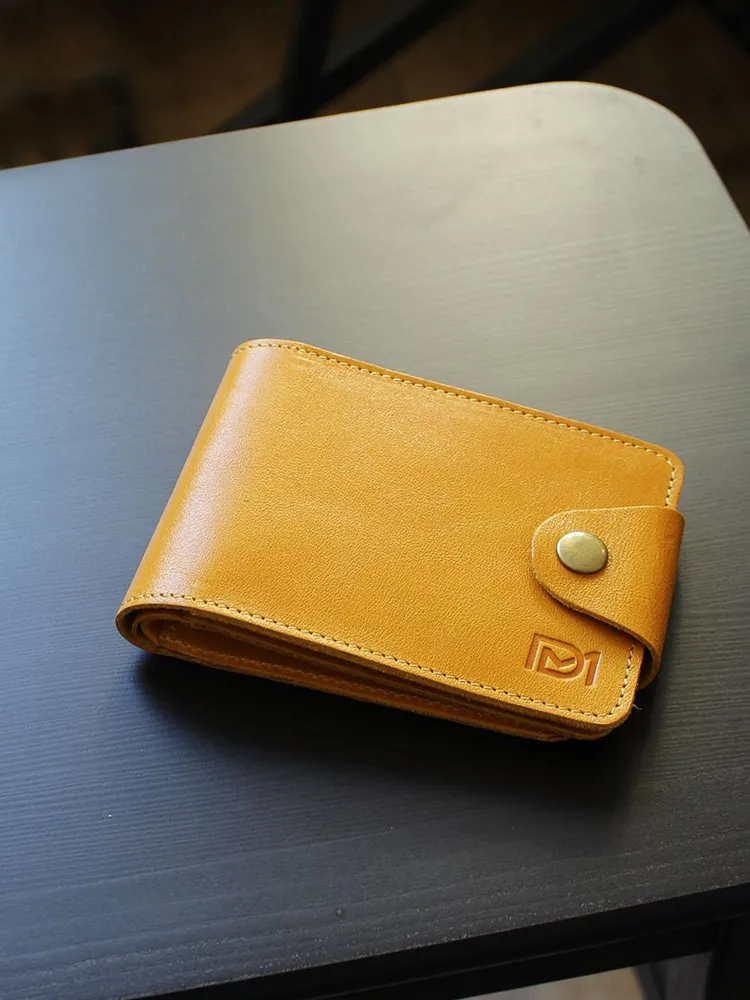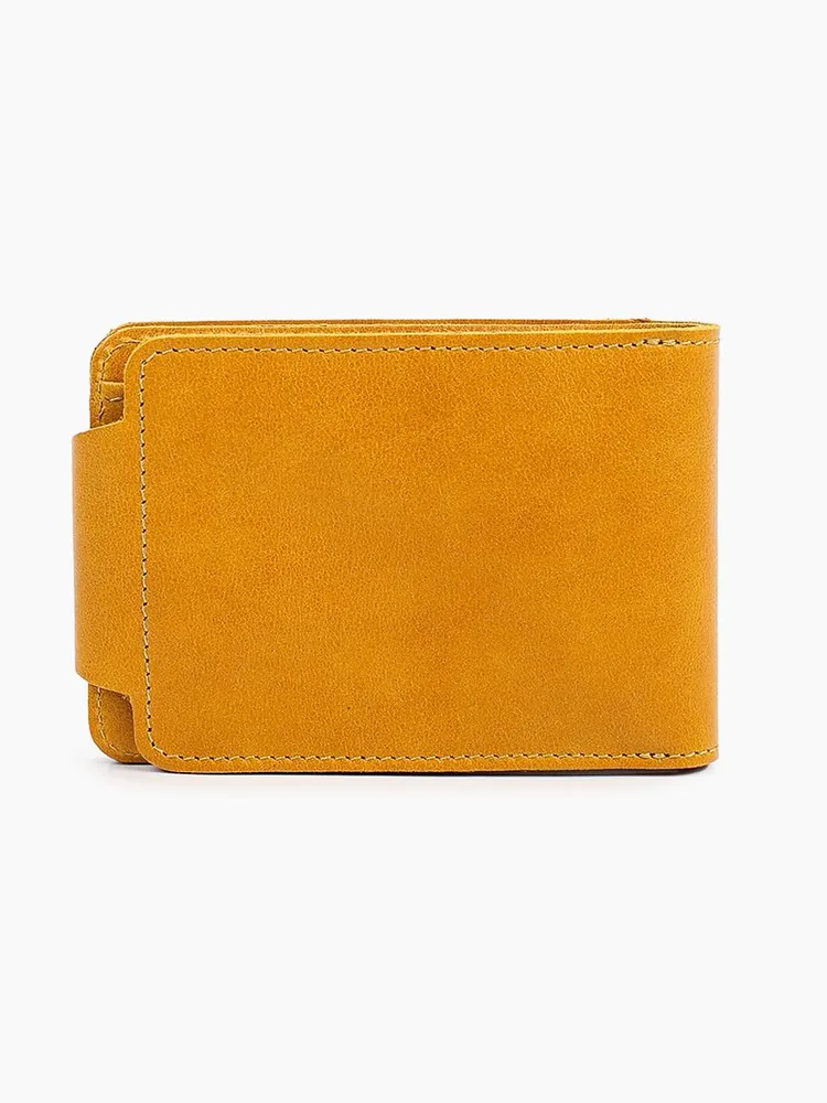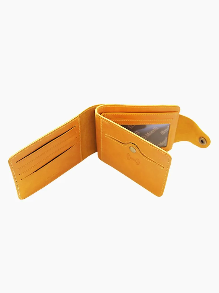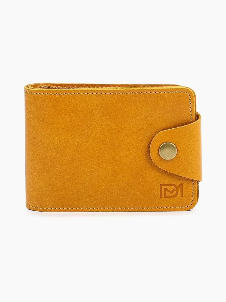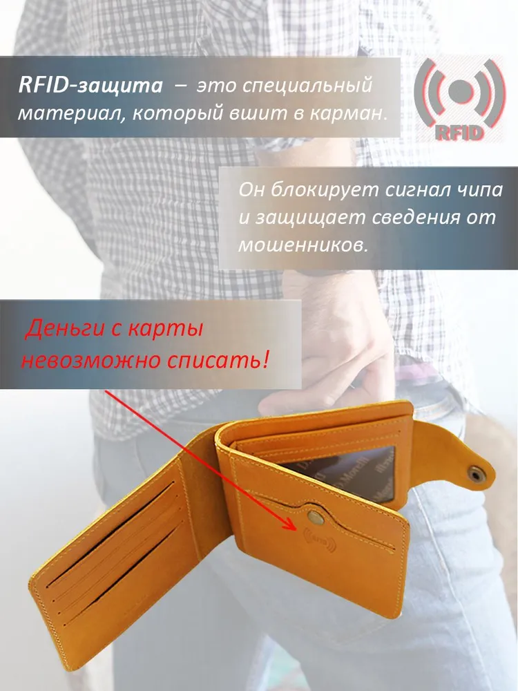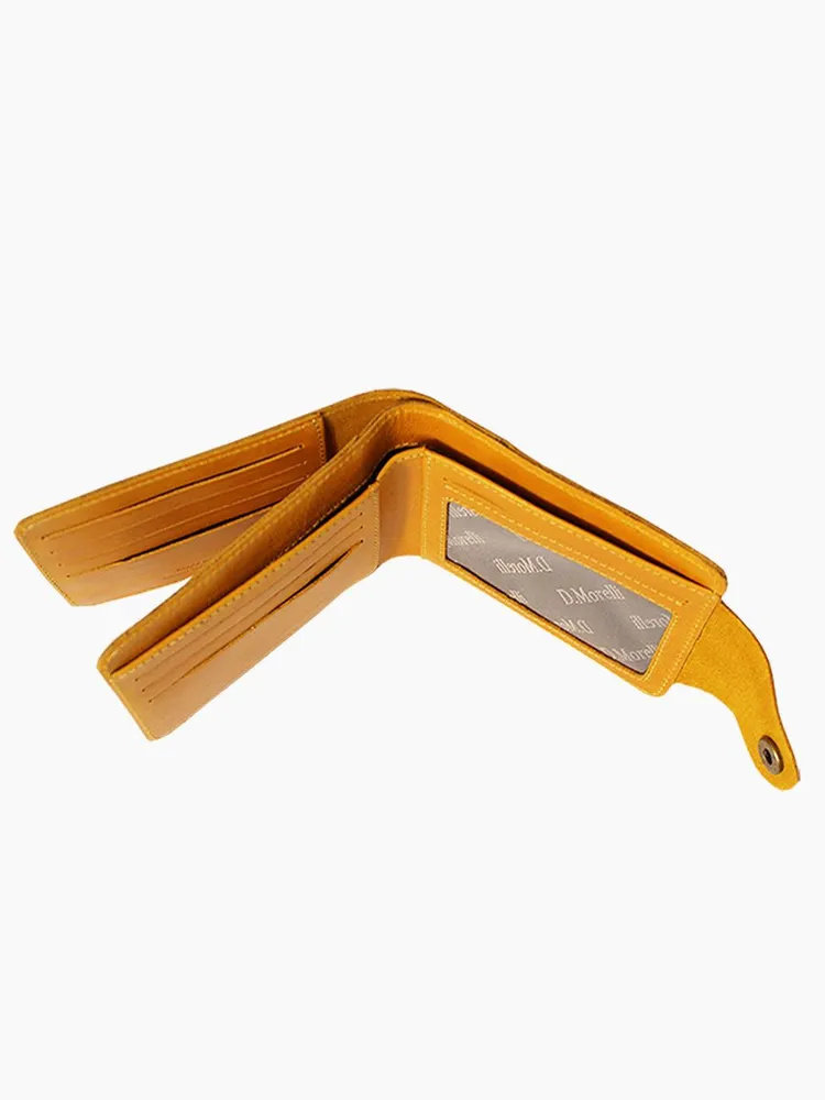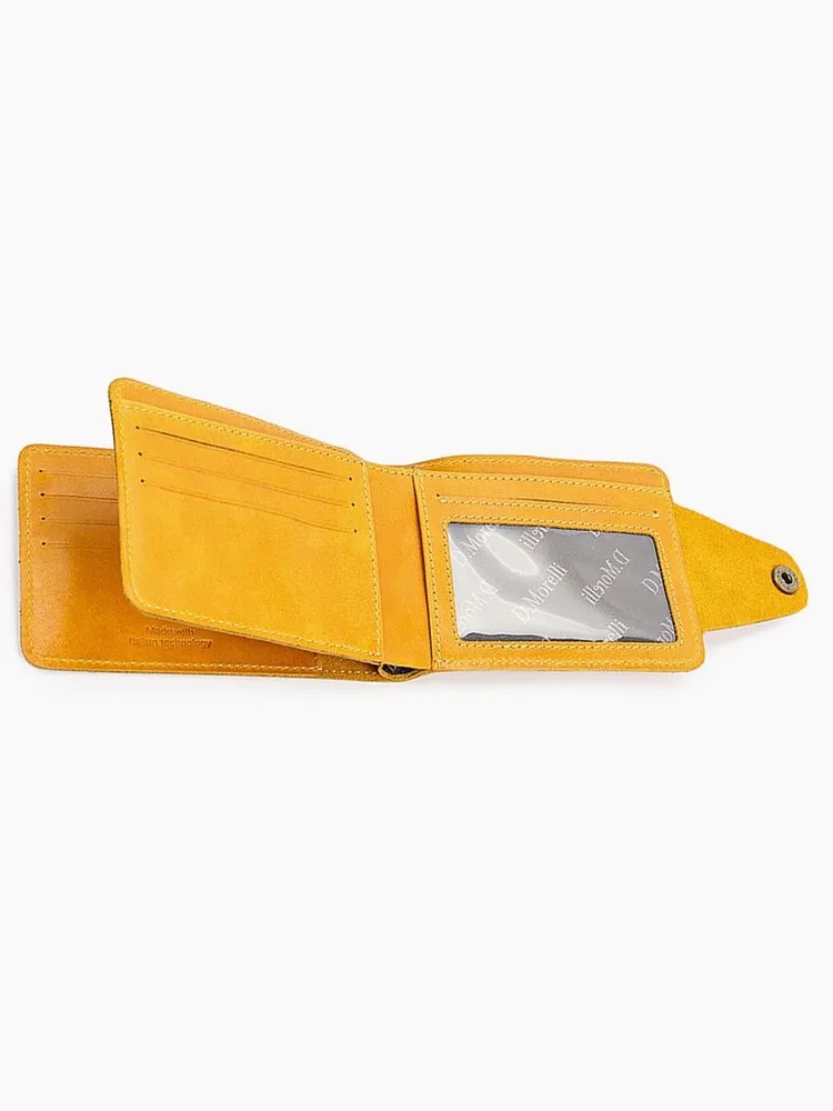 DM-P058-K402-R Портмоне с RFID-защитой Титан жёлтый Портмоне мужское в два сложения из коллекции Титан жёлтый K402-R, тм Domenico Morelli. Портмоне мужское из натуральной кожи Druid желтого цвета. Без подкладки. Закрывается на хлястик с кнопкой. Внутренний функционал: на левой стенке расположен кожаный карман с 4мя прорезными кармашками для карт; на правой стенке расположено откидное отделение, под которым имеется потайной карман, а на стенке кожаный карман и карман на кнопке с RFID-защитой (защита банковской карты от взлома). Внутри откидного отделения есть 2 кожаных кармана для карт, 3 прорезных кармашка, карман с пластиковым окном, а также отделение для купюр. Кошелёк выполнен в стиле кэжуал. Это стильный и модный аксессуар, который выгодно дополнит Ваш образ. Размер изделия 125мм*90мм, поставляется в подарочной картонной коробке.