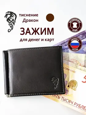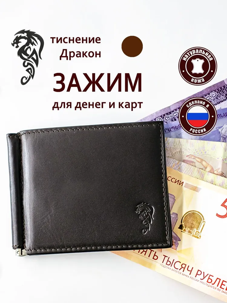 DM-ZM02-K02-D Зажим для денег Brown-3 Мужской Зажим из коллекции Brown-3 K02-D (Дракон), тм D.Morelli Зажим для денег изготовлен из натуральной гладкой кожи коричневого цвета, на лицевой стороне тиснение Дракона. Внутри шесть сборных карманов для пластиковых или визитных карт, а также два потайных кармана. Металлический зажим надежно фиксирует купюры. Размер изделия 110мм*85мм, поставляется в подарочной картонной коробке. В фен-шуй Дракон – это мудрый и надежный покровитель, он приносит в дом гармонию и счастье. Будучи символом власти и могучей воли, дракон во многом покровительствует мужчинам, символизирует мужественность, ответственность, силу духа, смелость и мудрость. Символ дракона по фен-шуй – это также финансовый успех и защита от любых негативных воздействий, проявляющихся вовне. Коричневый цвет в свою очередь связывают с землей, плодородием, богатством, и на этом основании наделяют коричневые аксессуары способностью привлекать деньги. Психологи в свою очередь считают, что коричневый цвет успокаивает, внушает чувство надежности и уверенности, что формирует финансовую стабильность своего владельца.