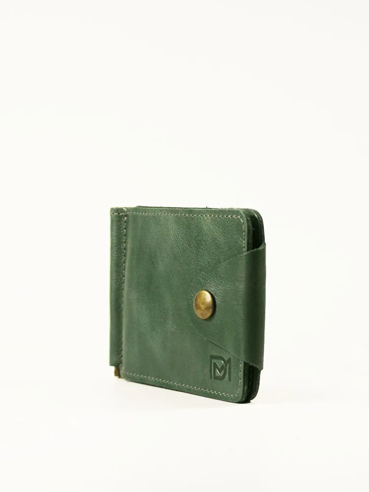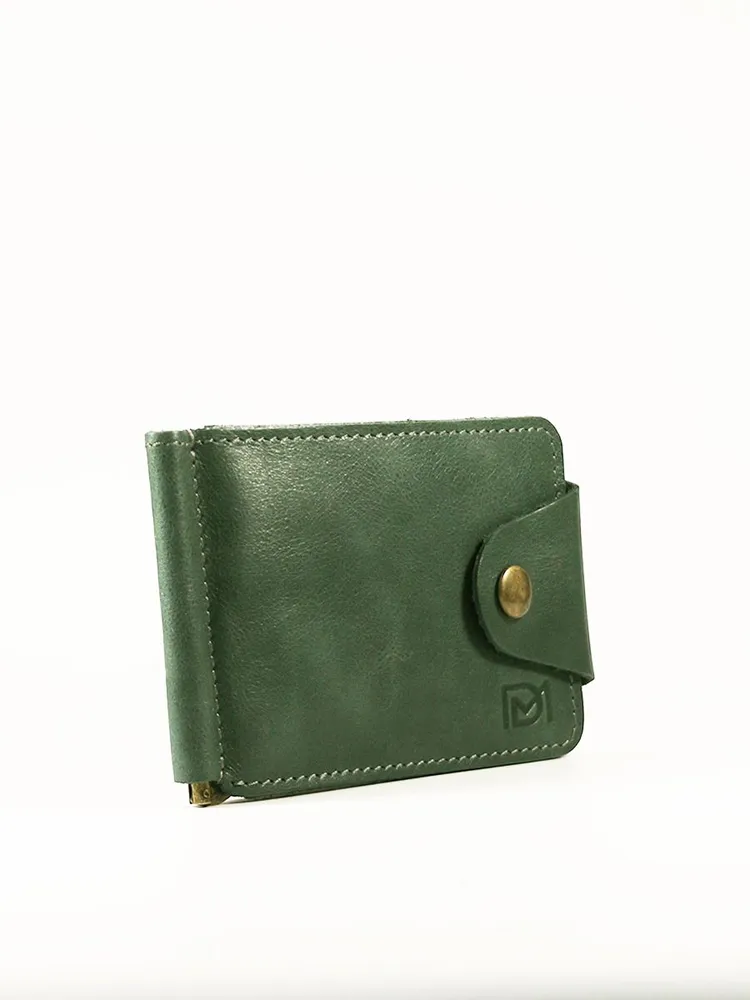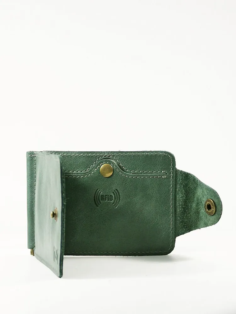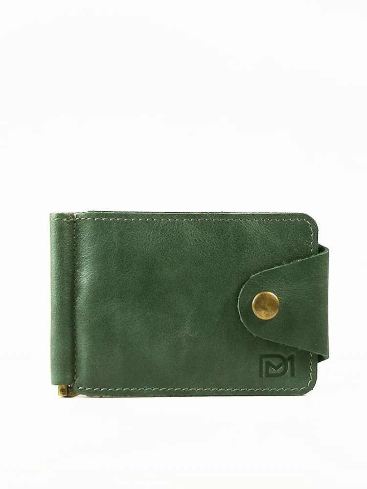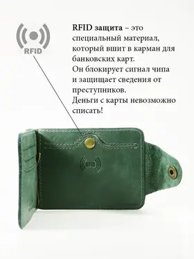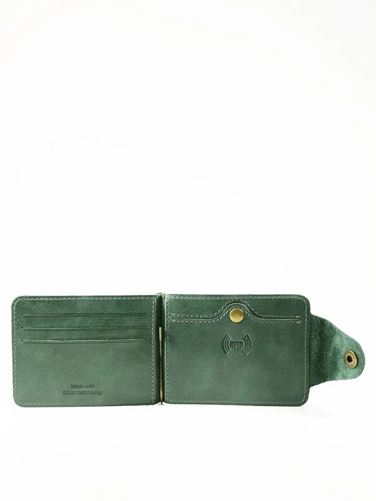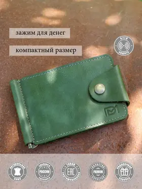 DM-ZM08-D97-R Зажим д/денег с RFID-защитой Титан зелен. Коллекция Титан зелёный D97-R, тм Domenico Morelli Мужской зажим для денежных банкнот с RFID-защитой. Выполнен из натуральной кожи Druid зеленого цвета. Закрывается на хлястик с кнопкой. Внутренний функционал: два кожаных кармана, 3 прорезных кармашка для карт, карман на кнопке с RFID-защитой (защита банковской карты от взлома), а также металлический зажим для купюр. Зажим выполнен в стиле кэжуал. Это стильный и модный аксессуар, который выгодно дополнит Ваш образ. Размер изделия 110мм*80мм. Поставляется в подарочной картонной коробке.