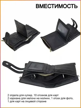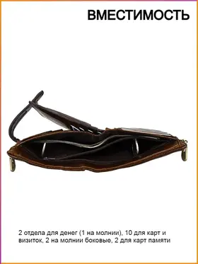 Компактный кошелек из натуральной телячьей кожи Heraclius мужской и женский идеально подходит для ежедневных прогулок, когда нужно взять с собой всё самое необходимое. В магазине кошельков EZACSE можно купить бумажник "Ираклий". Он имеет 1 отдел для денег, 10 для карт, 2 на молнии, 2 для карт памяти. - Натуральная кожа (кожаный кошелек мужской выполнен из натуральной телячьей кожи с применением высококачественной фурнитуры.) - Фабричное производство (Резка и сборка кожаного мужского кошелька ручной работы происходит на фабрике по нашему заказу) - Гарантия: 12 месяцев - Размеры: 12 х 9,5 х 3,5 (см) - Вместимость (1 отдел для денег, 10 для карт, 2 на молнии, 2 для карт памяти).