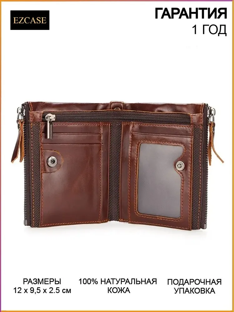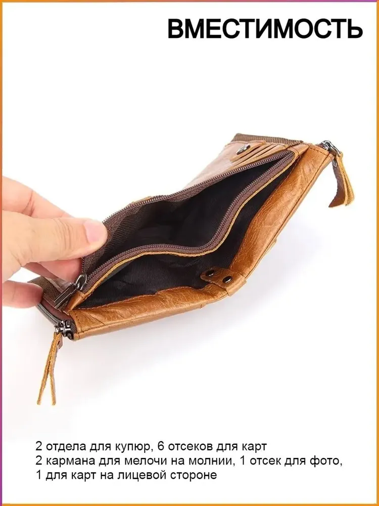 Вместительный, компактный кошелек мужской "Sakis" выполнен из натуральной телячьей кожи с применением высококачественной фурнитуры. Размеры: 12 x 9.5 x 2.5 см. Чехол для банкнот закрывается на плотную кнопку для надежной защиты содержимого. Вместимость: 2 отдела для купюр, 6 отделений для пластиковых карт, 2 отделения для мелочи на молнии, 1 отсек для фото, 1 карман на лицевой стороне. Удобный, приятный на ощупь бумажник для денег, визиток поставляется в брендовой коробочке и может служить отличным подарком мужчине и женщине. В наличии есть черный, коричневый и светло-коричневый кожаный портмоне. Это практичный, оригинальный, стильный аксессуар на каждый день, в офис, в школу, в универ, для длительных поездок и путешествий. Тонкий, мягкий мини кошелек ручной работы легко помещается в карман брюк и джинс, в сумку, рюкзак, барсетку, поясную сумку, клатч. Также в нашем магазине Вы можете купить женские кошельки, зажимы, ключницы, визитницы, обложки для автодокументов, водительский прав.