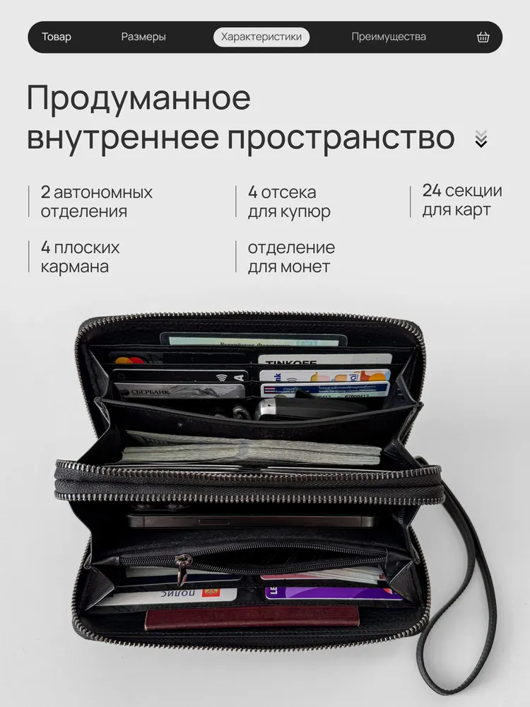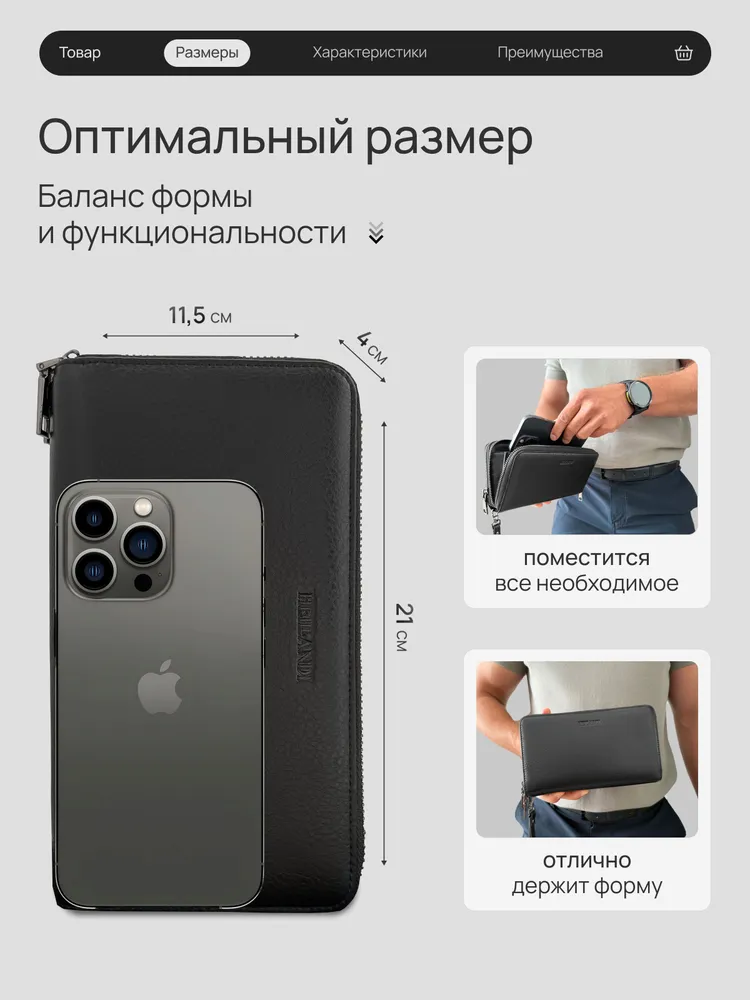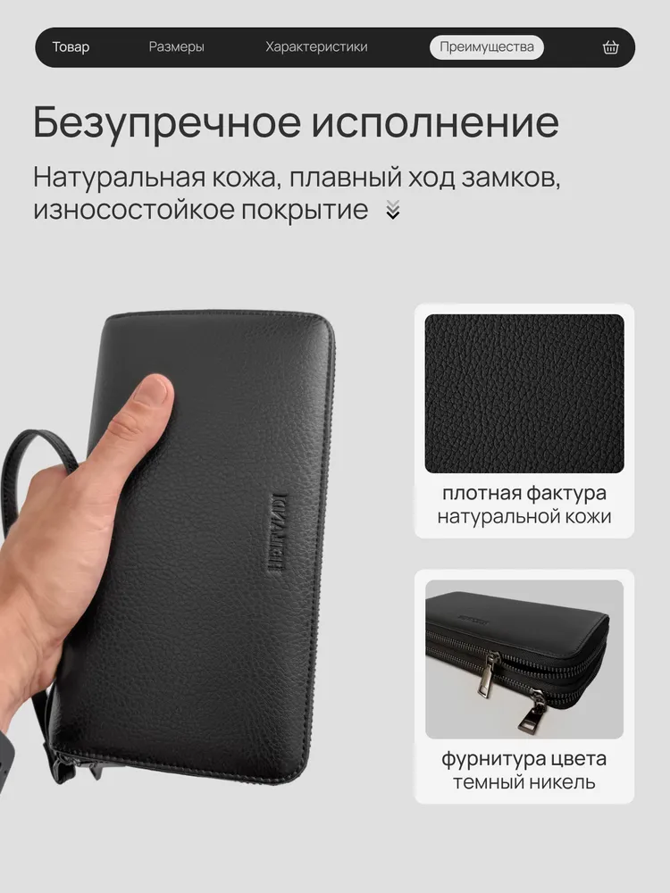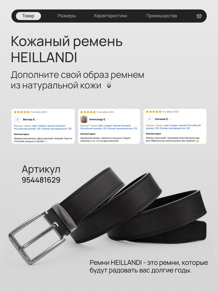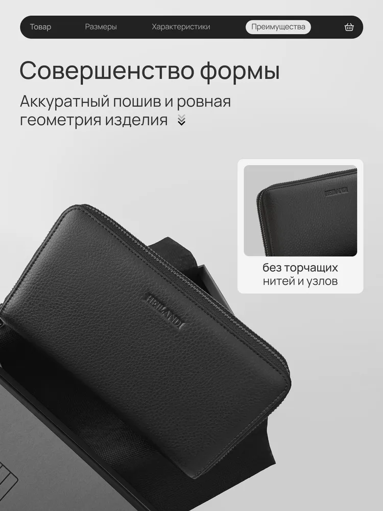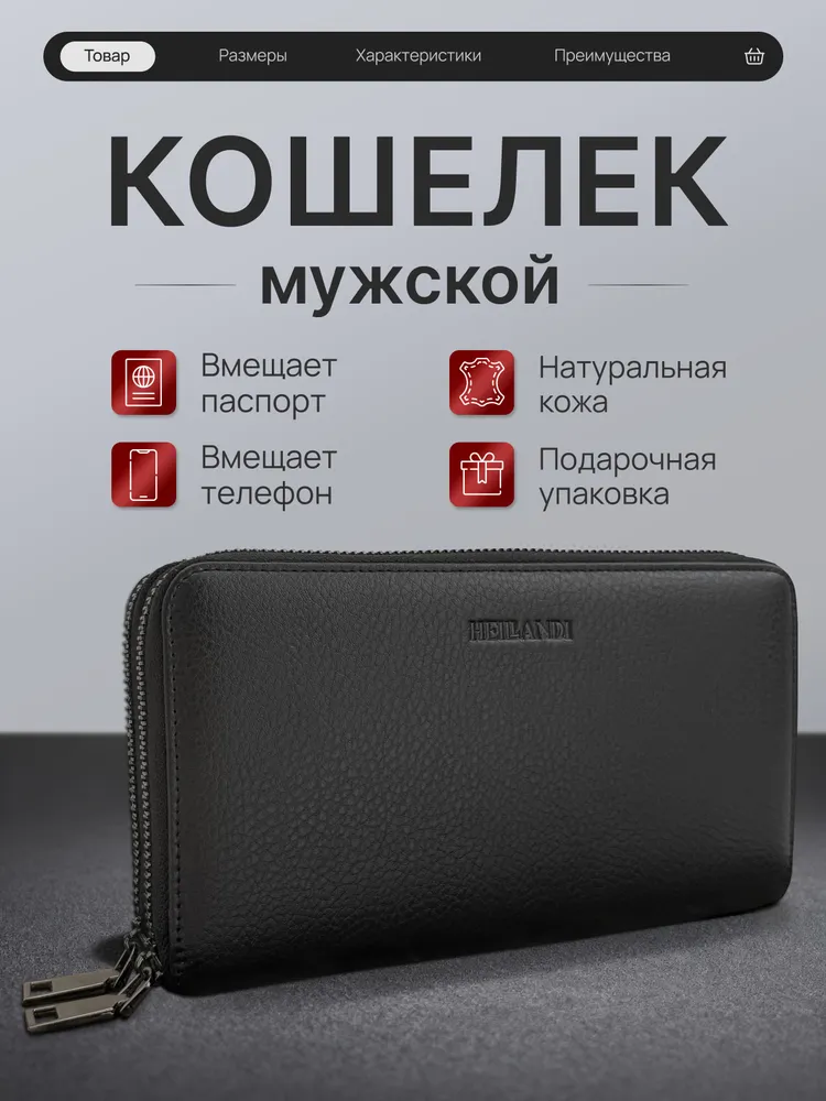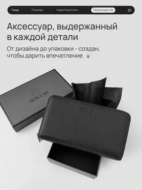 Мы вдохновлялись мужчиной, который ценит своё время, комфорт и порядок. Каждый его день — движение, задачи и быстрые решения на ходу. Кошелёк-клатч HEILLANDI — эхо этого ритма. Функциональность и детали: Размер 21 х 11,5 х 4 см - удобно держать в руке, легко помещается в портфель или бардачок автомобиля. Продуманное внутреннеепространство - 2 самостоятельных отделения на молнии; - 4 полноразмерные секции - для банкнот, телефона или ключей. В одну секцию свободно помещается пачка из 100 купюр (банковского формата); - 4 плоских кармана - для чеков и документов; - 24 слота для карт; - Карман на молнии - для монет и мелочей. Съёмный ремешок и удобная ручка-хват позволяют выбрать как носить клатч - в руке или на запястье. Материалы Кошелёк HEILLANDI выполнен из натуральной кожи крупного рогатого скота — с выразительной фактурой, приятной на ощупь и устойчивой к влаге, холоду и износу. Внутренняя отделка сочетает натуральную кожу, замшу и текстиль. Мы выбираем материалы и компоненты так, чтобы каждое изделие служило годами - сохраняя внешний вид и форму. Фурнитура отличается точной работой и долговечностью: замки двигаются плавно, без заеданий, сохраняя цвет и блеск даже после тысяч циклов открывания и закрывания. Подарочная коробка Кошелёк упакован в брендированную коробку и обёрнут в чёрный тканевый лайнер, что создаёт ощущение завершённого подарка. Мы уделяем внимание каждой детали - от кожи до момента, когда открывают коробку. Выбирайте лучшее для себя и своих близких с HEILLANDI. Ремни HEILLANDI Та же сдержанная эстетика, то же внимание к деталям. Лаконичный дизайн, натуральная кожа и простая регулировка длины - ничего лишнего, только функциональность, собранная в чистой форме.