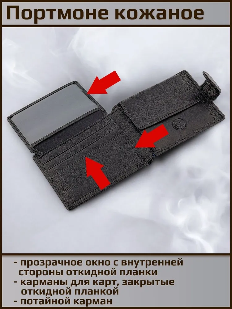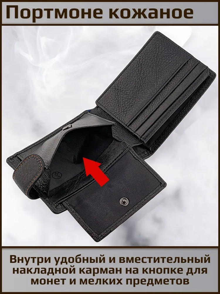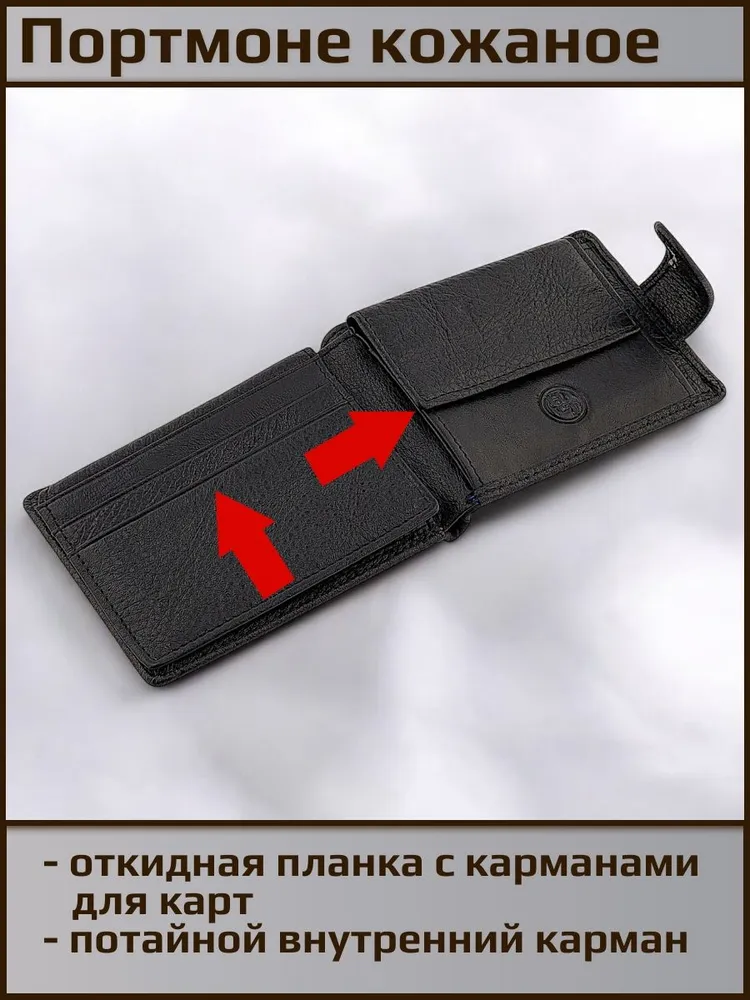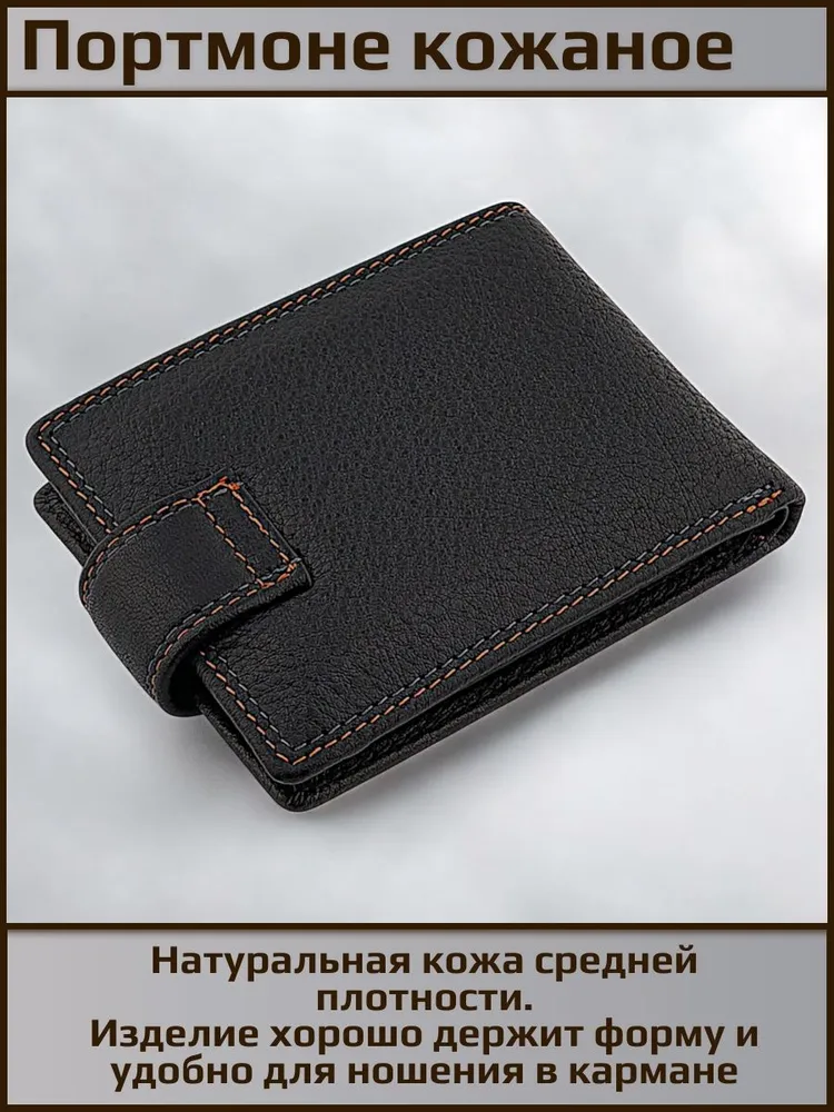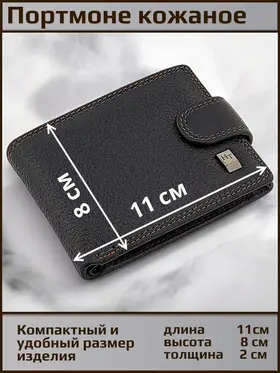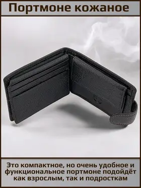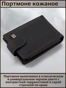 Удобное распашное небольшое портмоне из натуральной кожи. Фиксируется хлястиком с кнопкой. Внутри отделение для купюр любого достоинства, карман на кнопке для мелочи, откидная планка с прозрачным окном и отделениями для карт. Красивая прострочка черной и терракотовой нитью по краю аксессуара. Портмоне имеет очень удобный размер для повседневного использования и ношения как в кармане так и в сумке. Нужный и полезный аксессуар. Отличный и функциональный подарок.