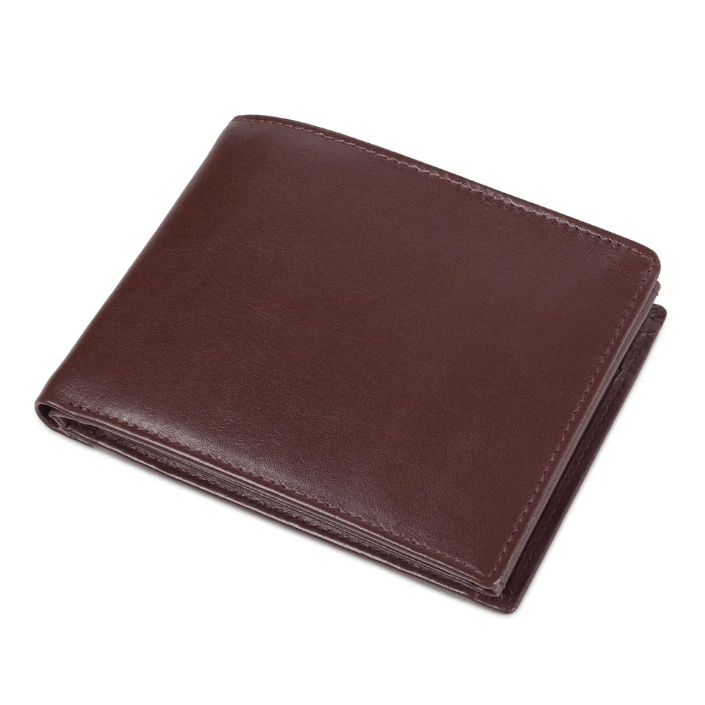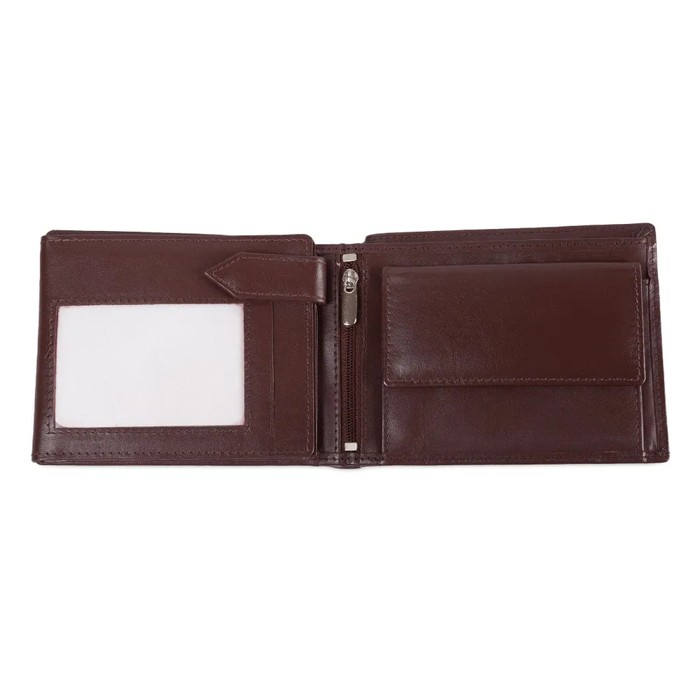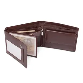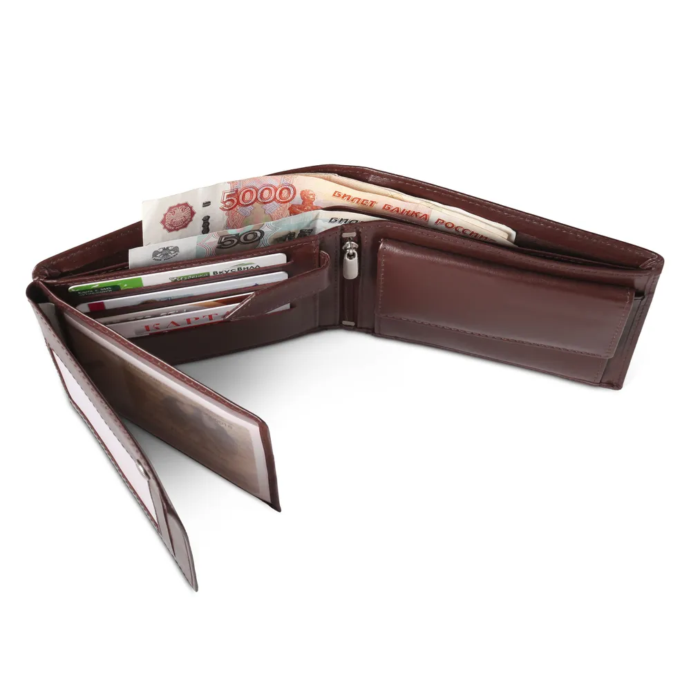 Классическое портмоне из натуральной кожи, с подарочной коробкой в комплекте. Внутри – два отделения для купюр разного номинала. 8 отделений для пластиковых карт или визиток, монетница с клапаном на кнопке, несколько отделений для хранения документов небольшого формата, и внутренний карман на молнии.