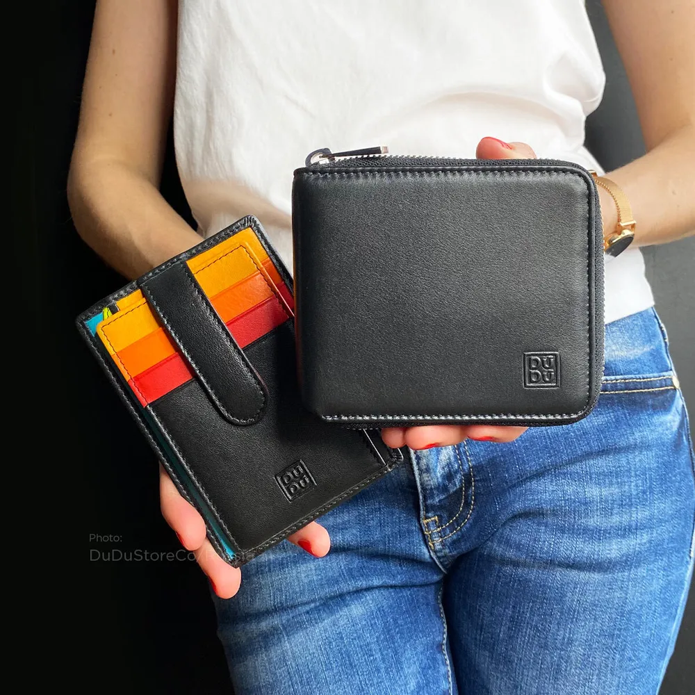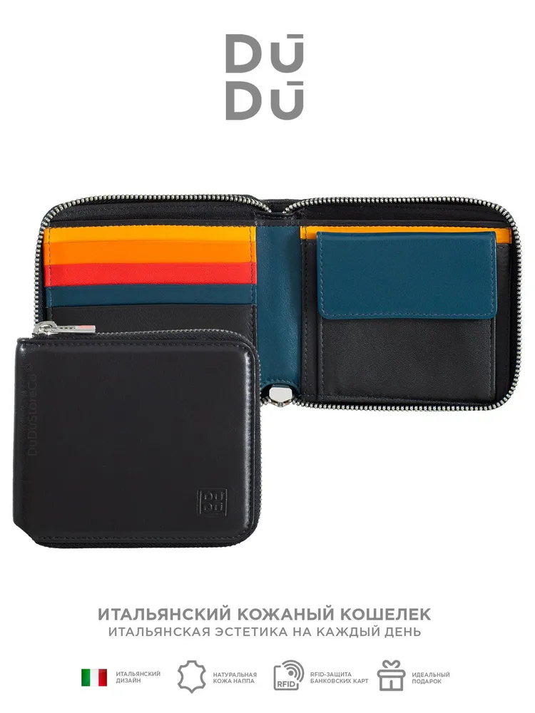 Итальянский кожаный кошелек на молнии DuDu серии Faro Итальянский кожаный кошелек DuDu серии Faro — компактный и удобный аксессуар на круговой молнии, созданный для ежедневного использования. Несмотря на небольшой размер, в нем есть все необходимое: отделения для пластиковых карт, бумажной наличности и отдельный кармашек для мелочи. С этим портмоне все самое важное всегда будет под рукой. Кошелек серии Faro идеально подойдет как для мужчин, так и для женщин. Для мужчин особенно гармонично смотрятся темные оттенки, а девушкам понравятся яркие цветовые решения, которые станут стильным акцентом в образе. Мягкая натуральная кожа Nappa делает кошелек невероятно приятным. Кошелек DuDu серии Faro оснащен системой защиты анти-RFID. Модуль RFID надёжно блокирует несанкционированное считывание данных с банковских карт, находящихся внутри аксессуара. Это сочетание стиля, практичности и безопасности. Итальянский кожаный кошелек Faro станет вашим надежным спутником каждый день – легким, стильным и удобным во всех ситуациях. Материал: натуральная кожа Nappa Размер: 11 x 9 x 2 см Вес: 150 г Описание: 6 карманов для кредитных карт, 1 карман для банкнот, 1 отделение для монет и 3 дополнительных кармана. Фирменная подарочная коробка. Итальянские цветные кошельки, сумки и аксессуары DuDuBags DuDuBags – итальянский бренд, который с любовью создает аксессуары из натуральной кожи для тех, кто ценит качество, эстетику и индивидуальность. Сумки, кошельки и мелкая кожгалантерея изготавливаются исключительно из 100% телячьей кожи Nappa – мягкая, эластичная и удивительно приятная на ощупь. Этот материал сочетает в себе прочность и нежность, благодаря чему аксессуары DuDu сохраняют свою красоту и форму на протяжении многих лет. История бренда началась в 1992 году, когда Биаджио Аддарио основал компанию, вдохновлённый идеей создавать аксессуары, способные передавать настроение и эмоции. Сегодня семейное дело продолжили его дети – Энрика и Паоло, сохраняя традиции мастерства и наполняя бренд новым дыханием. Качество и оригинальность продукции Наша компания более 10 лет является эксклюзивным представителем DuDuBags в России. Вся продукция поставляется в Россию напрямую из Италии, город Pordenone. Мы гарантируем оригинальность продукции и высокое качество. Цветные кожаные кошельки и портмоне DuDu давно покорили сердца покупателей по всему миру – от Испании и Великобритании до Франции, Австрии, Германии и многих других стран. На своей родине, в Италии, бренд представлен особенно широко, а его уникальный стиль и узнаваемый дизайн сделали DuDuBags выбором тысяч людей, ценящих качество и комфорт. Мы верим, что и вы откроете для себя особый характер наших аксессуаров и по достоинству оцените их неповторимое очарование. Только натуральная кожа Nappa Аксессуары DuDu созданы для того, чтобы каждый нашёл в них отражение своей индивидуальности. Они делают образ ярче, добавляют повседневной жизни легкости и радости, поднимают настроение и становятся стильным подарком для друзей и самых близких. Каждое изделие – это больше, чем просто аксессуар. Это элемент стиля, отражение характера и внимания к деталям. В каждом изделии сочетаются функциональность, эргономика и уникальные цветовые решения, благодаря которым DuDuBags узнаваем во всём мире. DuDuBags – это не просто аксессуары. Это стиль жизни в ярких красках Италии.