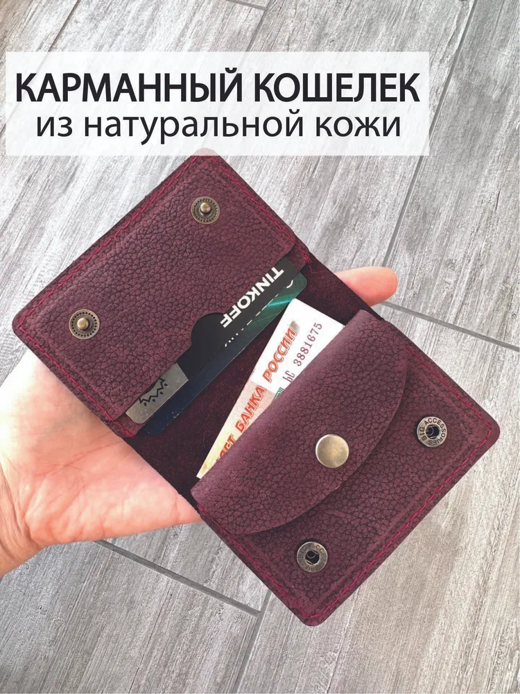 Кошелёк карманный унисекс из кожи люкс «винтаж» 100% ручная работа Качественная европейская фурнитура 2 отделений для карточек, 1 карман под мелочь, 1 отделение для купюр Размер 103/75/8 мм Кожа в стиле «винтаж» —это кожа, выделанная и обработанная специальным образом. Ее отличительные черты: ✔️внешняя состаренность - материал выглядит, будто ему не первый год. Винтажно и романтично, сохраняя в себе множество историй; ✔️матовость - эта кожа не блестит;⠀ ✔️сходство с нубуком - внешне материал очень похож на нубук, только он более плотный;⠀⠀ ✔️мягкость - по тактильным ощущениям кожа очень приятная;⠀ Тэги: карманный мини кошелек для карточек, купюр и мелочи ручной работы из натуральной кожи, для мужчин и женщин, небольшой кошелек яркого цвета на кнопке, матовая бархатистая кожа, помещается в рюкзаке сумке кармане, удобно лежит в руке, маленький кошелек кожаный.