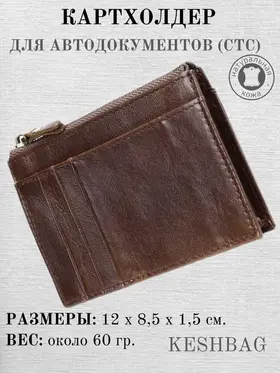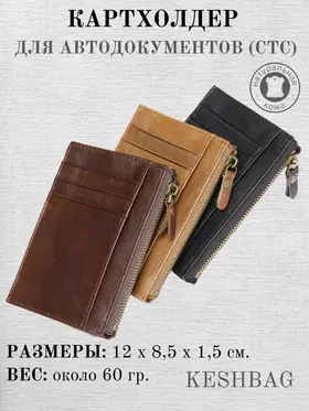 Идеальный порядок в документах для автовладельца! Наведите ревизию в своем кармане и бардачке с нашим компактным органайзером. Этот стильный кожаный картхолдер создан специально для тех, кто ценит практичность и организованность. Больше не нужно перерывать все отделения сумки в поисках нужной карточки или документа — всё будет под рукой в одном месте. Ключевые преимущества: ВСЕ ДОКУМЕНТЫ ПОД РУКОЙ: Специальные отделения идеально подходят для водительского удостоверения, СТС, СНИЛС и 6 банковских карт. Все самое важное защищено и находится в быстром доступе. ПРАКТИЧНОСТЬ: Просторный карман на надежной молнии надежно хранит монеты, мелочь или ключи, не давая им потеряться. НАДЕЖНОСТЬ И СТИЛЬ: Изготовлен из качественной натуральной кожи в классических цветах (черный, коричневый). Такой аксессуар смотрится солидно и подходит к любому стилю. КОМФОРТ ЕЖЕДНЕВНОГО НОШЕНИЯ: Несмотря на свою вместительность, картхолдер невероятно компактный и легкий (всего 60 г!). Он не создает неудобств в кармане брюк или куртки. Технические характеристики: Материал: Натуральная кожа Цвета: Классический черный, Классический коричневый Вместимость: 6 карт + 2 отделения для документов (водительское удостоверение, СТС) + 1 карман на молнии Размеры: 12 х 8,5 х 1,5 см Вес: ~60 г Подарите себе уверенность и порядок! Закажите свой идеальный органайзер прямо сейчас!