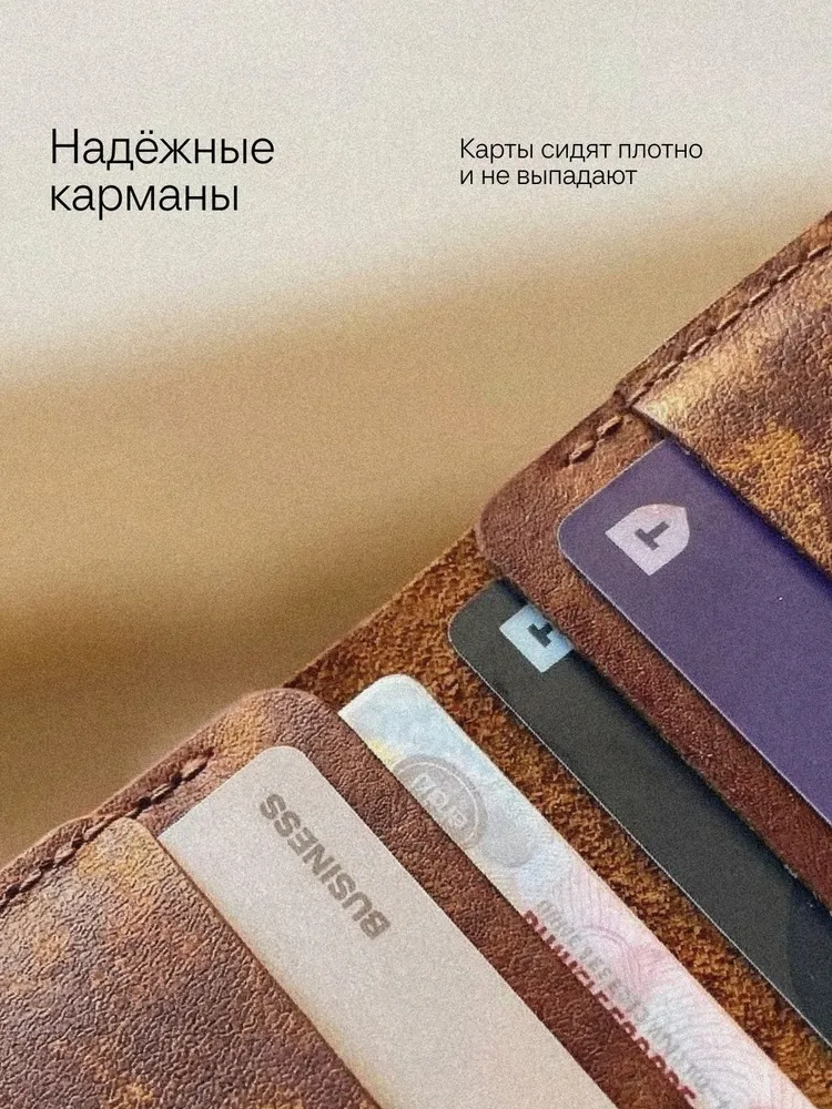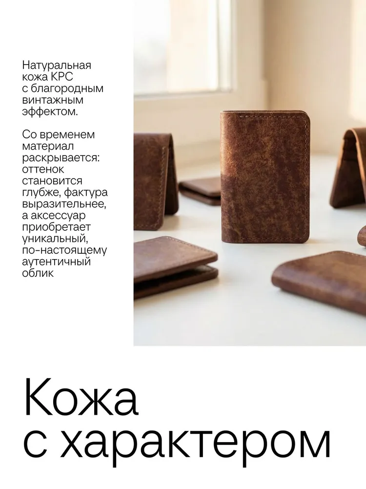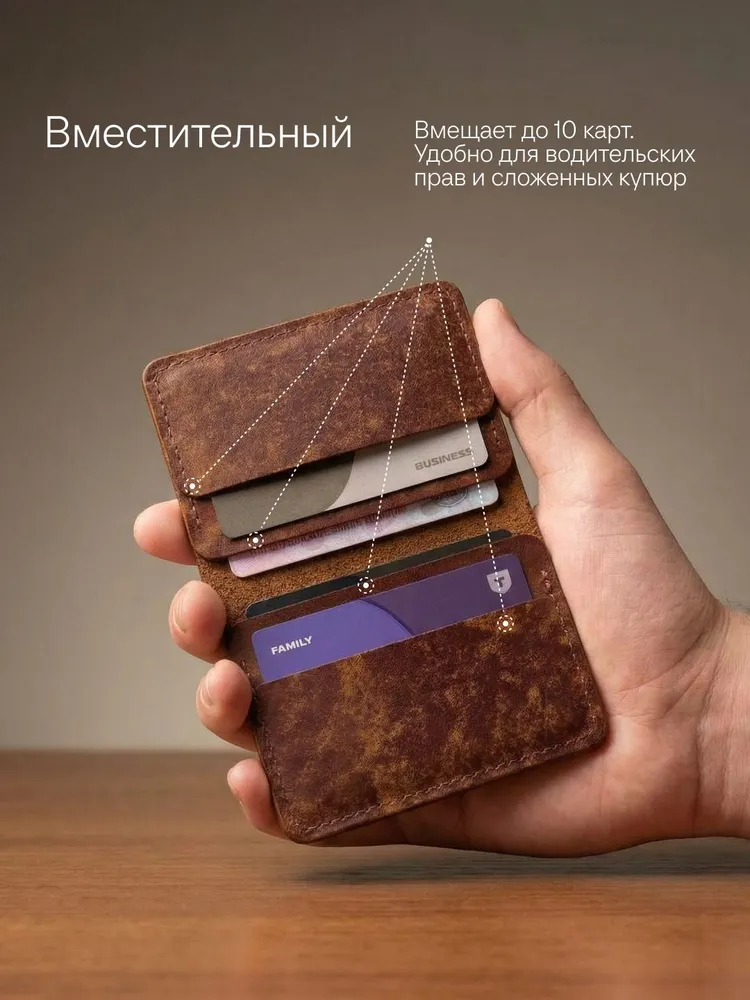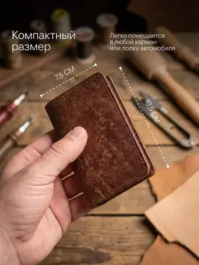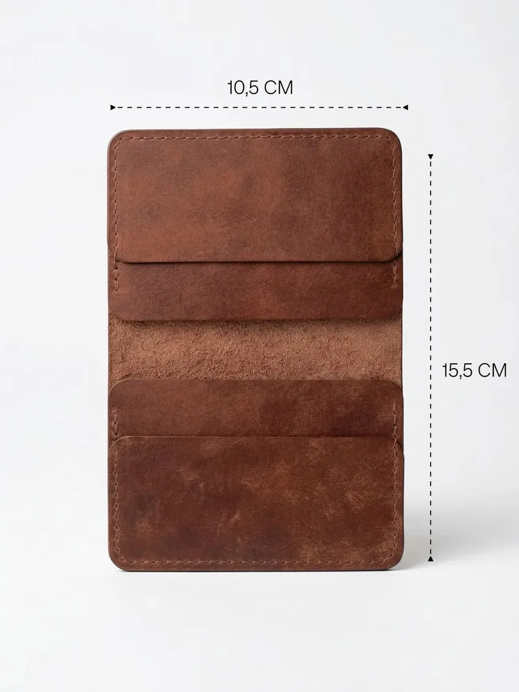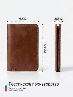 Картхолдер раскрывающийся из натуральной кожи КРС (крупно-рогатый скот): – Матовая кожа с винтажным эффектом – Коньячный/коричневый цвет – 4 отделения для пластиковых карт, водительского удостоверения, а так же сложенных купюр. – Вмещает до 10 пластиковых карт. – Размеры в сложенном виде 75х104 мм – Размеры в раскрытом виде 154х104 мм – Толщина одного слоя около 1,7 мм – Максимальная толщина около 5 мм (раскрытого) Этот мини кошелёк является универсальным решением, подходит как мужчинам так и женщинам. Отличный подарок для коллег и близких людей. Картхолдер без логотипов и текстов. Имеется место для нанесения (лазером или тиснением) логотипа компании или ФИО владельца .