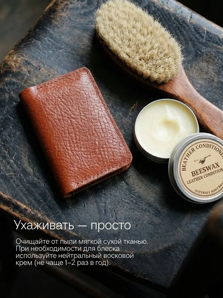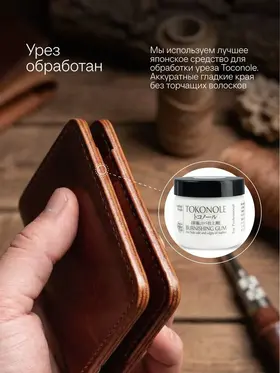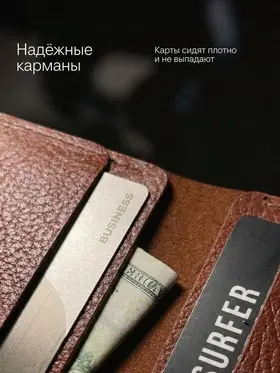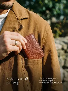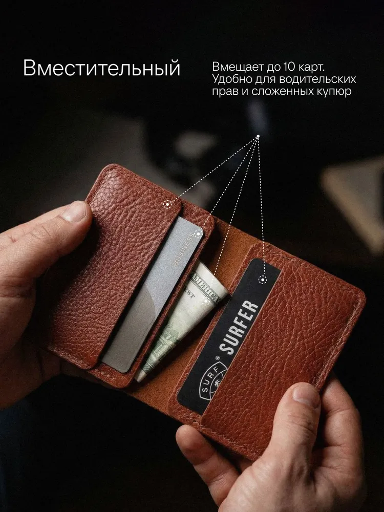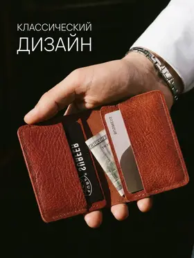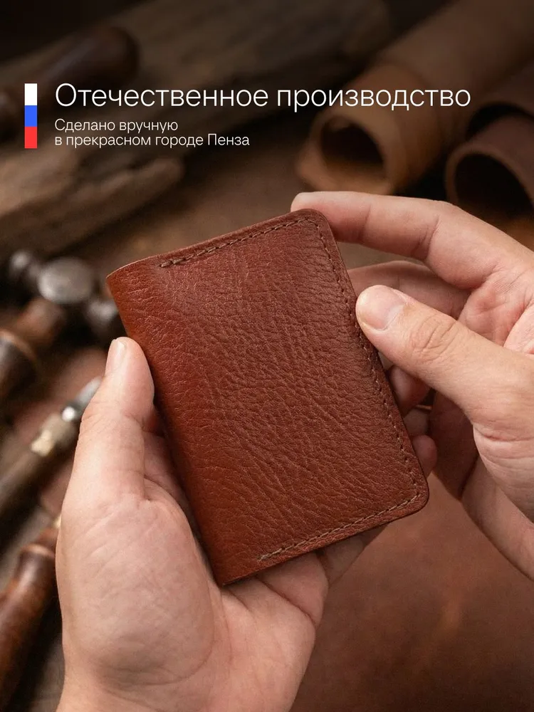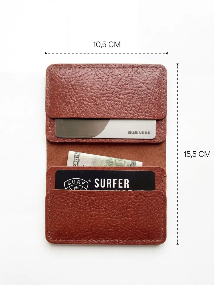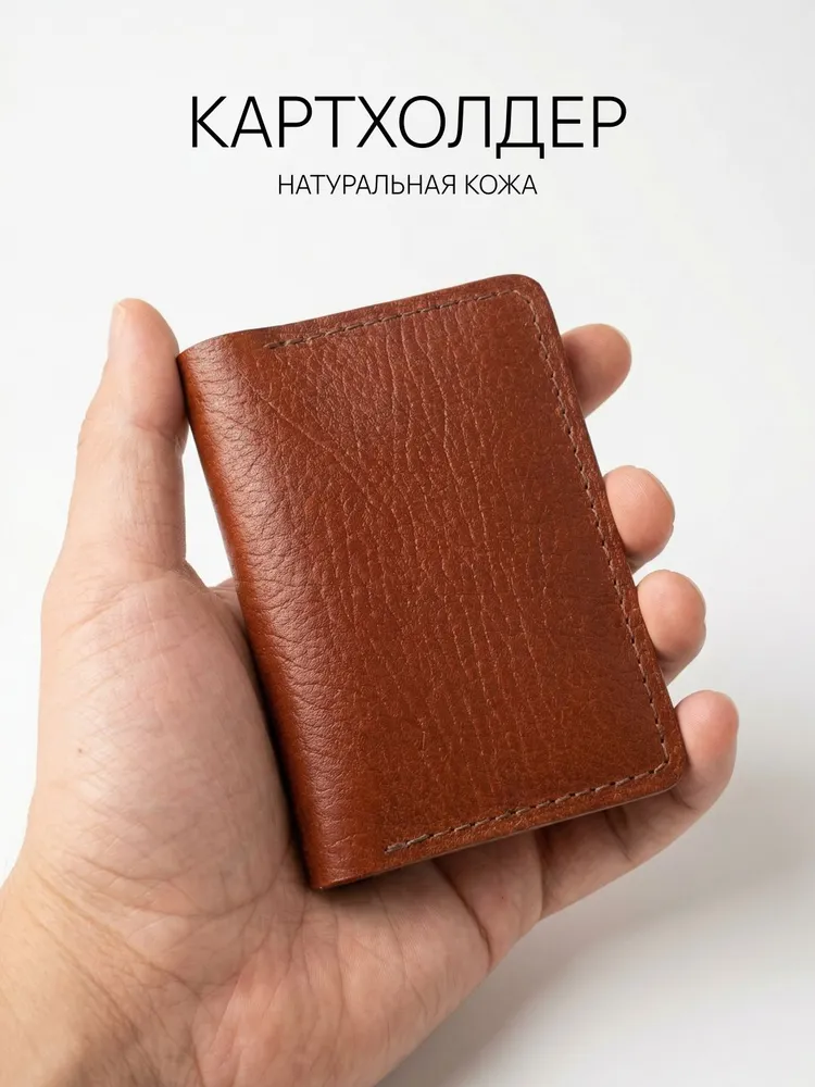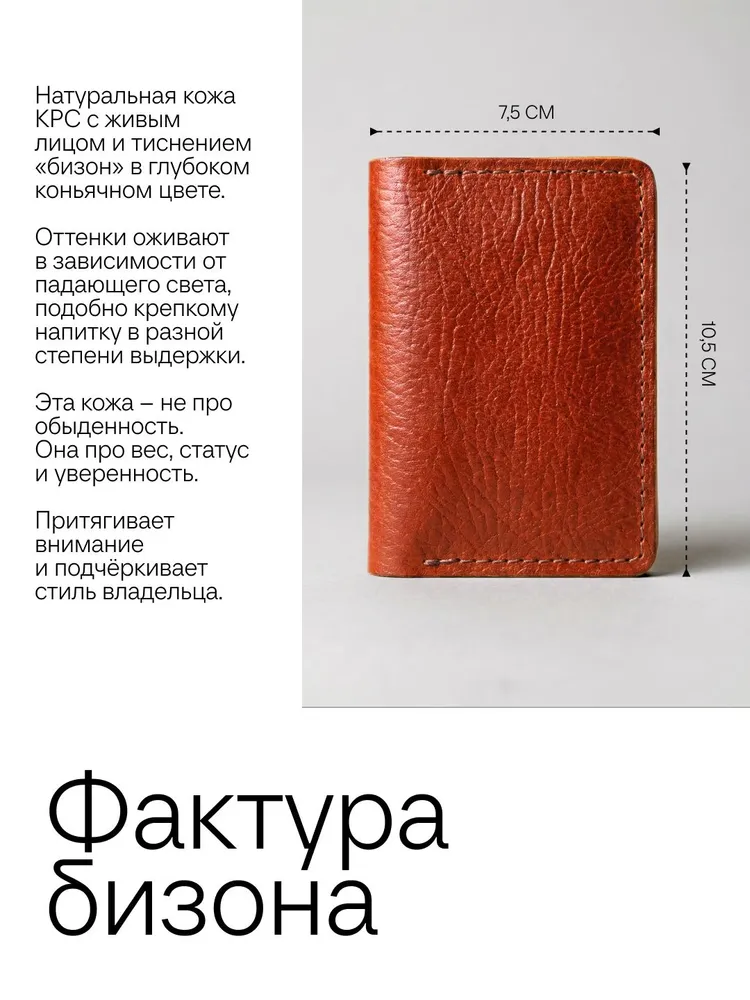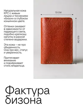 Картхолдер раскрывающийся из натуральной кожи КРС (крупно-рогатый скот): – Фактурная кожа буйвола – Коньячный цвет (меняет оттенок от коричневого до бордового в зависимости от освещения) – 4 отделения для пластиковых карт, водительского удостоверения, а так же сложенных купюр. – Вмещает до 10 пластиковых карт. – Размеры в сложенном виде 75х104 мм – Размеры в раскрытом виде 154х104 мм – Толщина одного слоя около 1,7 мм – Максимальная толщина около 5 мм (раскрытого) Этот мини кошелёк является универсальным решением, подходит как мужчинам так и женщинам. Отличный подарок для коллег и близких людей. Картхолдер без логотипов и текстов. Имеется место для нанесения (лазером или тиснением) логотипа компании или ФИО владельца .