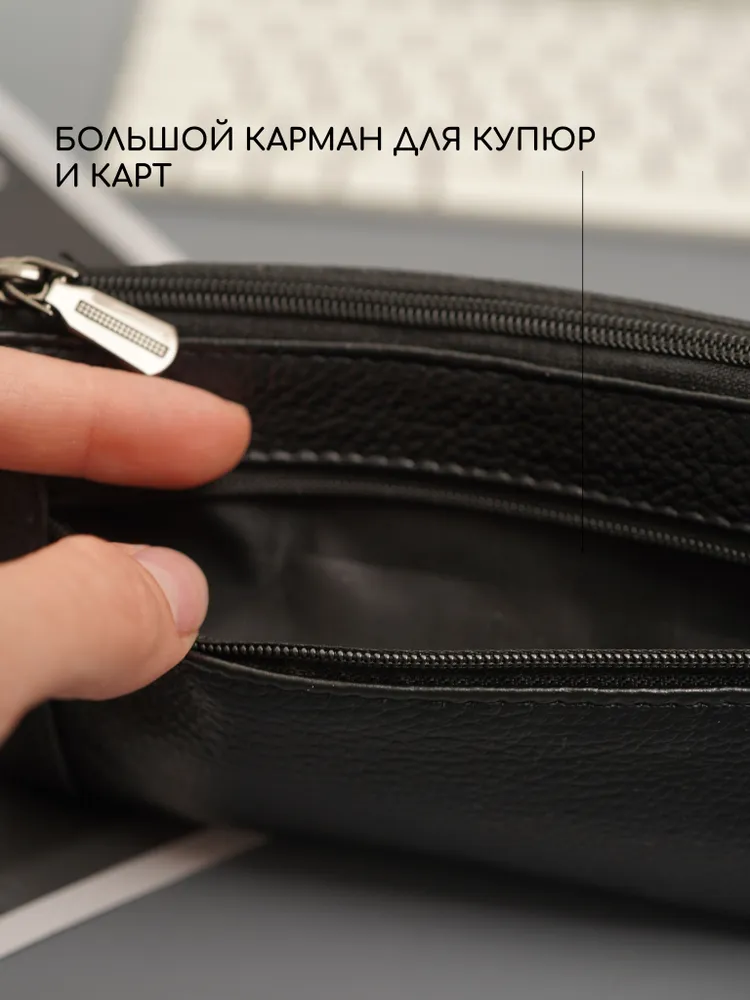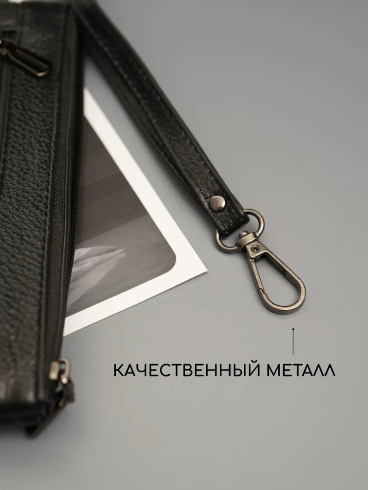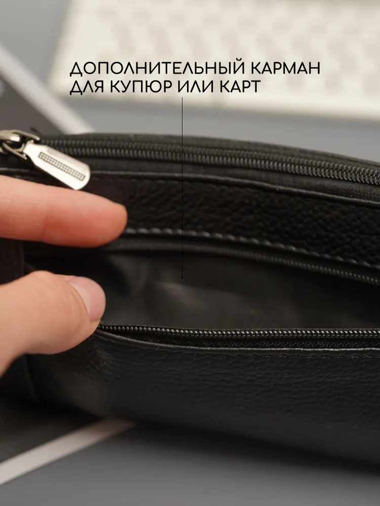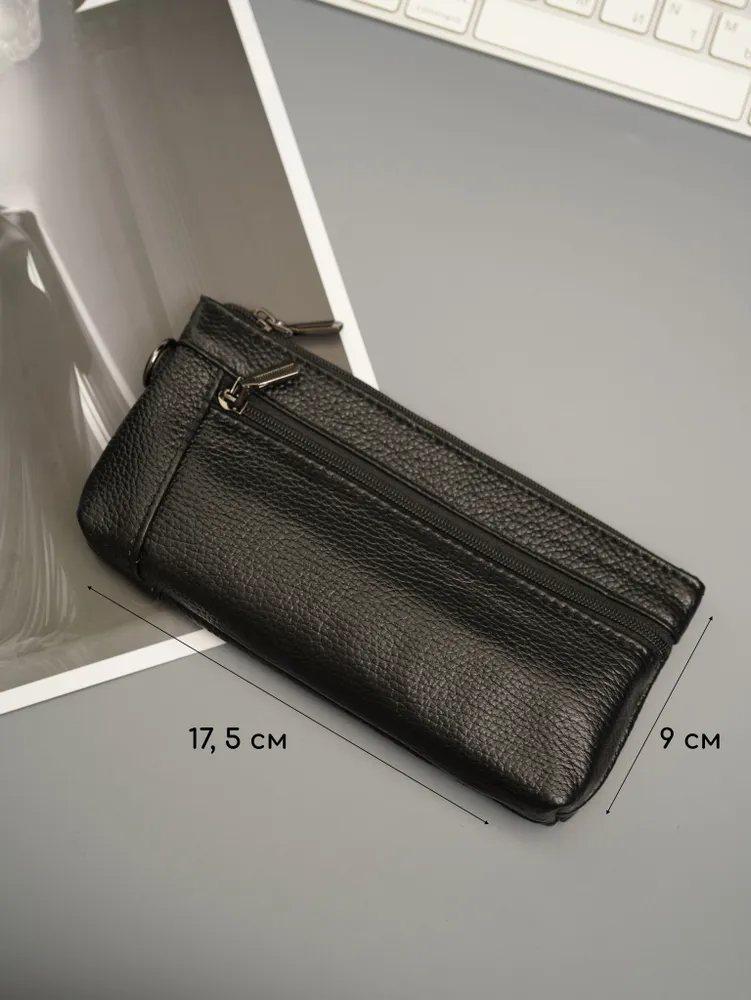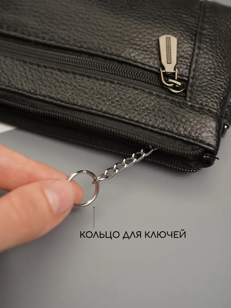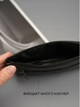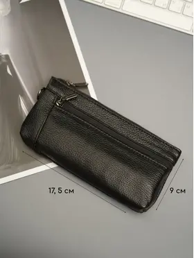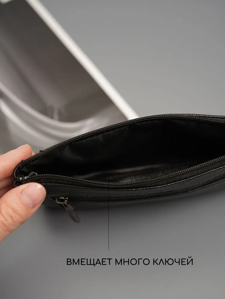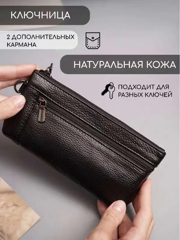 Ключница карманная кошелек Ключница карманная кошелек черная из натуральной кожи — кошелек-ключница для ключей, карт и наличных Ключница карманная — универсальный аксессуар, который сочетает функции хранения ключей, карт и денег. Практичная ключница кошелек выполнена из натуральной кожи, которая отличается прочностью, износостойкостью и сохраняет аккуратный внешний вид при ежедневном использовании. Классическая ключница черная подходит для любого стиля. Большая ключница кошелек карманная Функциональный кошелек ключница оснащен двумя карманами на молнии. Первое отделение предназначено для хранения ключей, включая крупные и длинные ключи, второе — для карт, наличных и других мелочей. Такой формат делает модель удобной как ключница и кошелек в одном аксессуаре. Большая ключница кошелек карманная женская и ключница кошелек мужская легко помещается в кармане, сумке или рюкзаке. При этом аксессуар достаточно вместительный и может использоваться как сумка кошелек ключница или мини-органайзер. Кошелек ключница натуральная кожа Кошелек ключница натуральная кожа обеспечивает надежную защиту содержимого — ключи не царапают вещи, а все необходимое удобно распределено по отделениям. Благодаря этому модель можно использовать как органайзер в сумку. Подходит как кошелек ключница женский, ключница кошелек женская, а также как кошелек ключница мужской кожаный благодаря универсальному дизайну и практичности. ПРЕИМУЩЕСТВА: • ключница карманная — компактность и удобство • ключница кошелек натуральная кожа — прочность и долговечность • 2 кармана на молнии — удобная организация • подходит для больших ключей • можно использовать как кошелек и ключница • сумка кошелек ключница — универсальное применение • ключница кожаная — премиальный внешний вид • черный цвет — классический и практичный Кошелек-ключница — это идеальное решение для хранения ключей, карт и наличных в одном компактном аксессуаре каждый день.
