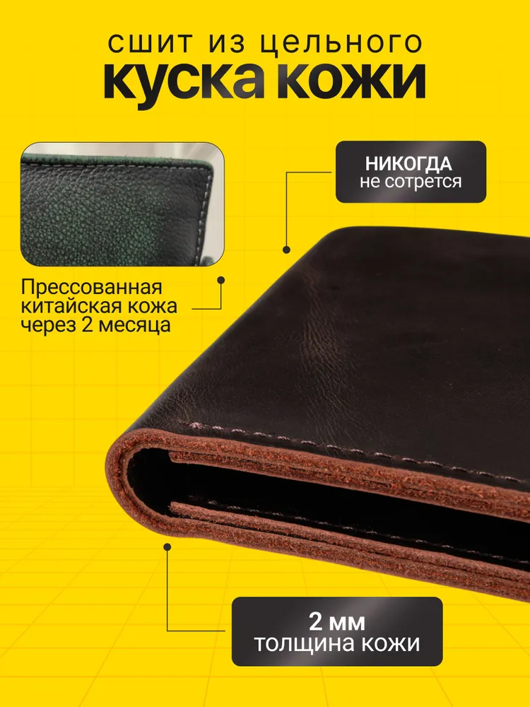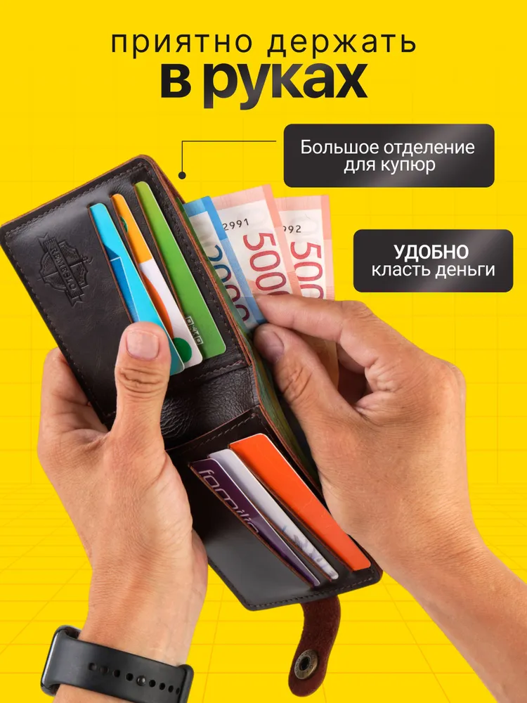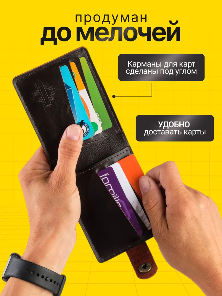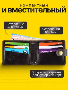 Кошелек мужской из натуральной кожи с застежкой кнопкой - это идеальный выбор для тех, кто ценит качество и стиль. Этот кошелек изготовлен из натуральной телячьей кожи, что обеспечивает долгую службу и высокую прочность изделия. Кошелек имеет 8 отделений для карт и 1 отделение для водительских прав, а также 3 отделения для купюр. Это позволяет хранить карты и деньги в одном месте, что очень удобно при ежедневном использовании. Застежка кнопкой обеспечивает быстрое открытие и закрытие кошелька, а также его защиту от непредвиденных ситуаций. Бумажник - это отличный выбор для тех, кто хочет иметь качественный и стильный аксессуар для своего гардероба. Он будет служить вам долго и надежно!