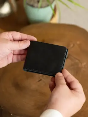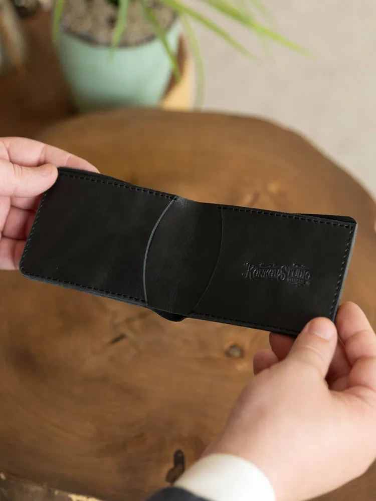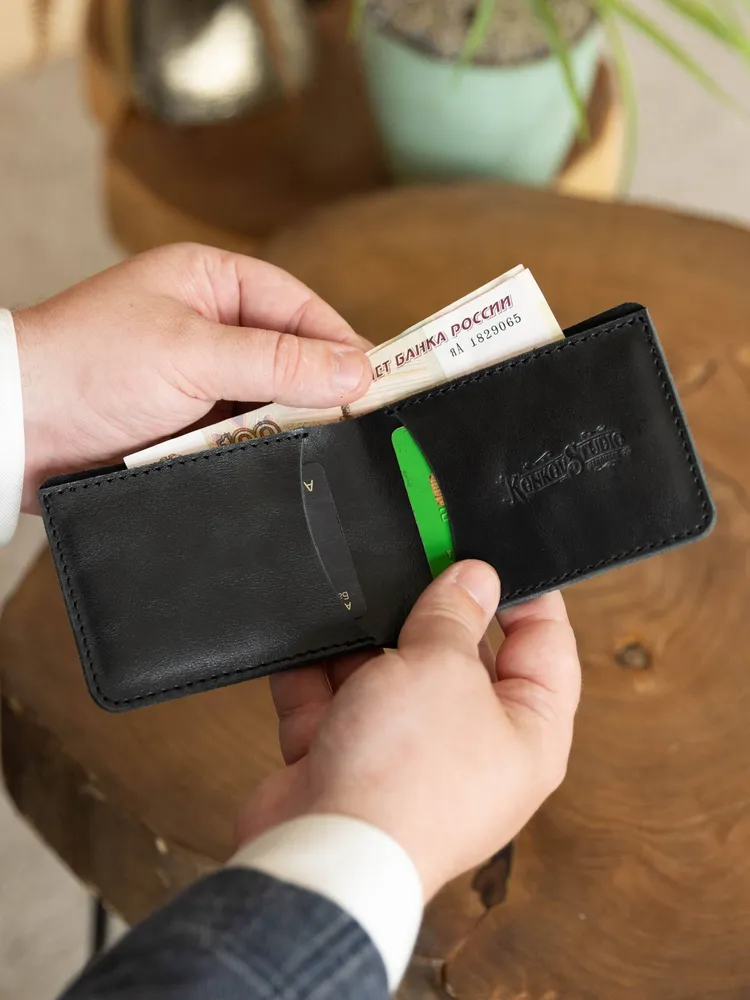 Кошелек из натуральной кожи от Konkovstudio — это элегантный и функциональный аксессуар, который подойдет как мужчинам, так и женщинам. Изготовленный из высококачественной кожи черного цвета, кошелек имеет гладкую текстуру и стильный дизайн. Он имеет два отделения для пластиковых карт и одно для банкнот, поэтому все необходимые карты и деньги всегда будут под рукой. Благодаря отсутствию застежек, кошелек легко открывается одной рукой, что особенно удобно в спешке. Кошелек поставляется в подарочной упаковке, что делает его отличным подарком на любой случай