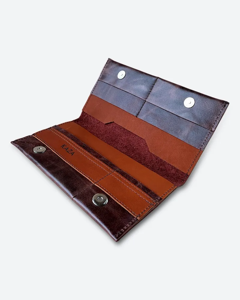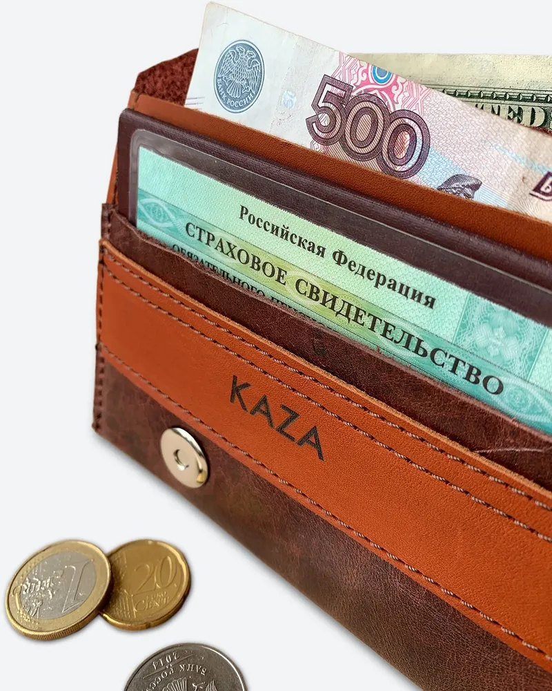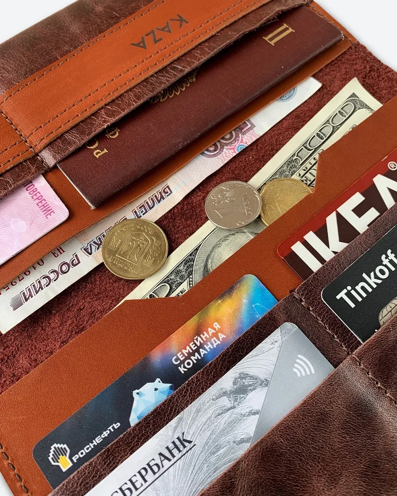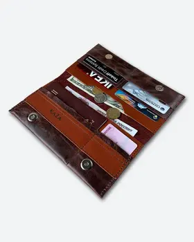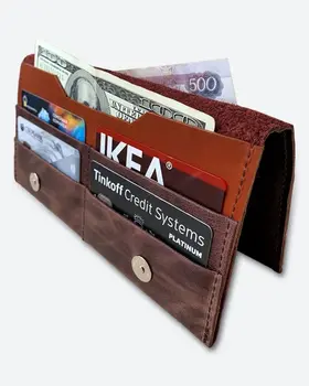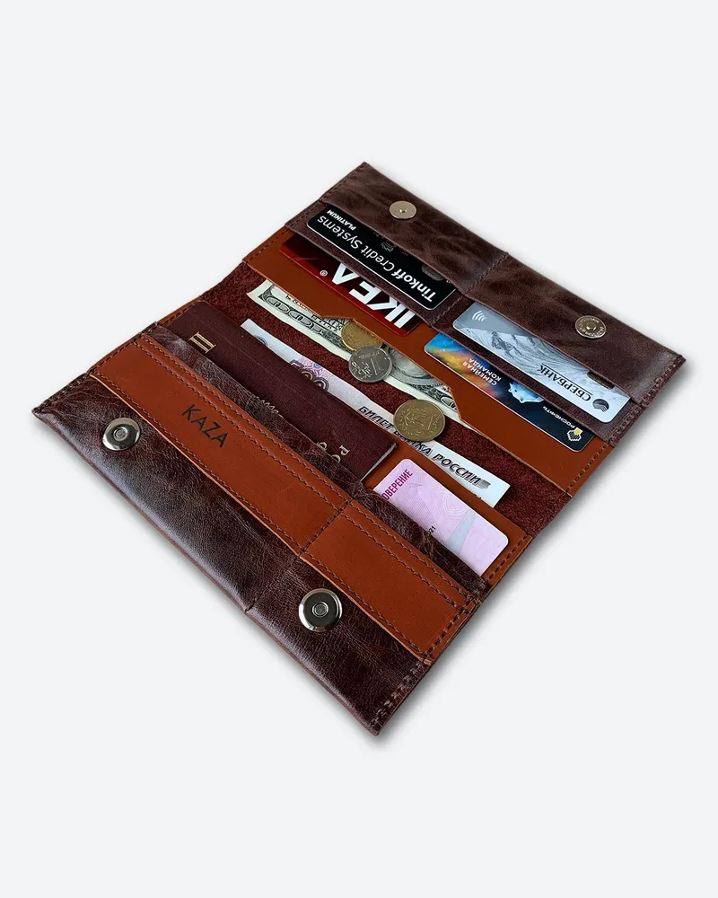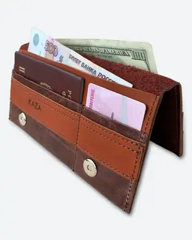 Большой вместительный кошелек для путешествий и города из натуральной кожи • Выполнен из натуральной кожи темно-коричневого мраморного цвета в сочетании с темно-коричневым кирпичного оттенка. • Изображение выжжено (не стирается и не трескается со временем). • Внешние размеры 10,5см Х 20см (+/-5мм). Закрывается на магнитные кнопки. • Вмещает в себя: бумажные купюры, банковские или дисконтные карточки, монеты, паспорт (Российский, Заграничный, Белорусский, Армения, Казахстан), СНИЛС и водительское удостоверение. Подходит для загранпаспорта и авто документов. • Имеет 2 отделения для бумажных денег; 5 отделений для пластиковых карт; 1 отделение для паспорта. • Мы используем качественную плотную, но при этом мягкую кожу толщиной 1.2-1.4 мм. • Гладкая кожа достаточно устойчива к загрязнениям, легко протереть влажной тканью. • Кошельки нашего бренда качественные и созданы для повседневного пользования взрослых мужчин или молодых женщин. • Женский кожаный кошелек – это идеальный подарочный вариант каждой женщине, девушке или девочке, коллеге или близкой подруге. Прекрасное дополнение любой сумки, рюкзака или портфеля. Картхолдер любимой маме (мамочке) на день матери или сестре на 8 марта. Любимому преподавателю на День учителя. • Портмоне – это роскошный подарок мужчине на день рождения (др). Стильные аксессуары брату или другу на 23 февраля (С Днём Защитника Отечества). Папе от дочки на Новый год (нг). Нужный подарок мужу на годовщину свадьбы или любимому парню ко Дню Святого Валентина (14 февраля). • Универсальные, классические, красивые аксессуары от кожевенной мастерской KAZA на праздники. Корпоративные подарки клиентам или коллегам. Презент российского производства начальнику или директору. • Ручная работа. • Производим с 2009 года. Другие кошельки бренда KAZA Вы можете кликнуть на изображение для перехода в карточку товара APOLLO LAOKI-PLUS MANcube MINICO SMALL LEMONI MINI TOMAS UNISEX RALPH